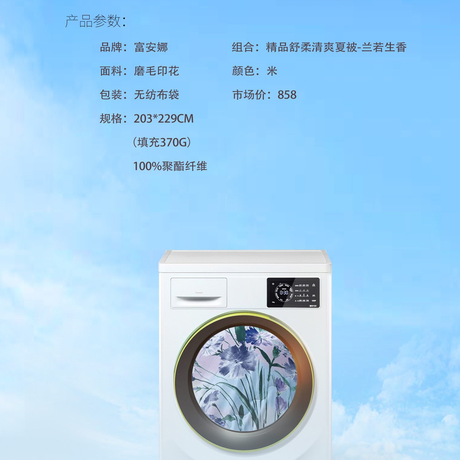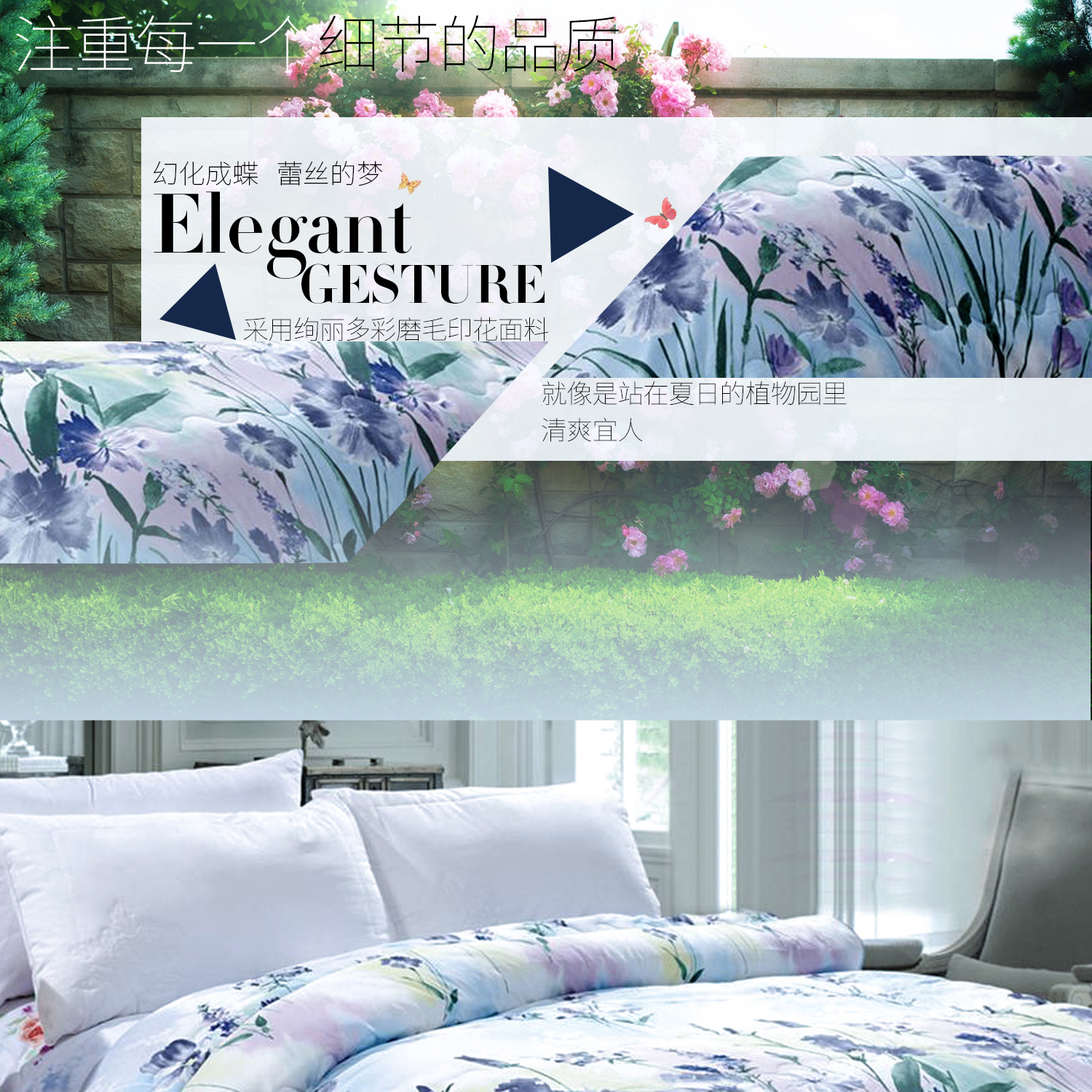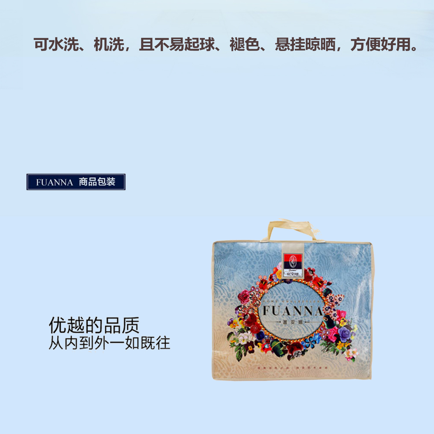面料:100%聚酯纤维 填充物:100%聚酯纤维 规格:203*229cm (填充370g) 面料:采用绚丽多彩磨毛印花面料,绒面丰盈,垂坠感强,柔软舒适 工艺:采用包边设计,均匀平整,四角特别有轮廓感,不易变形 材质:以蓬松柔软的材质,充盈饱满,耐洗耐用,易洗快干