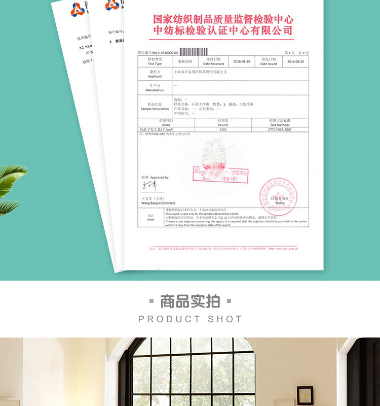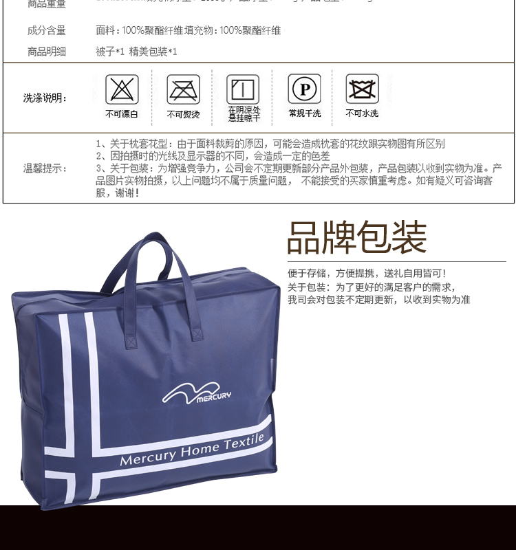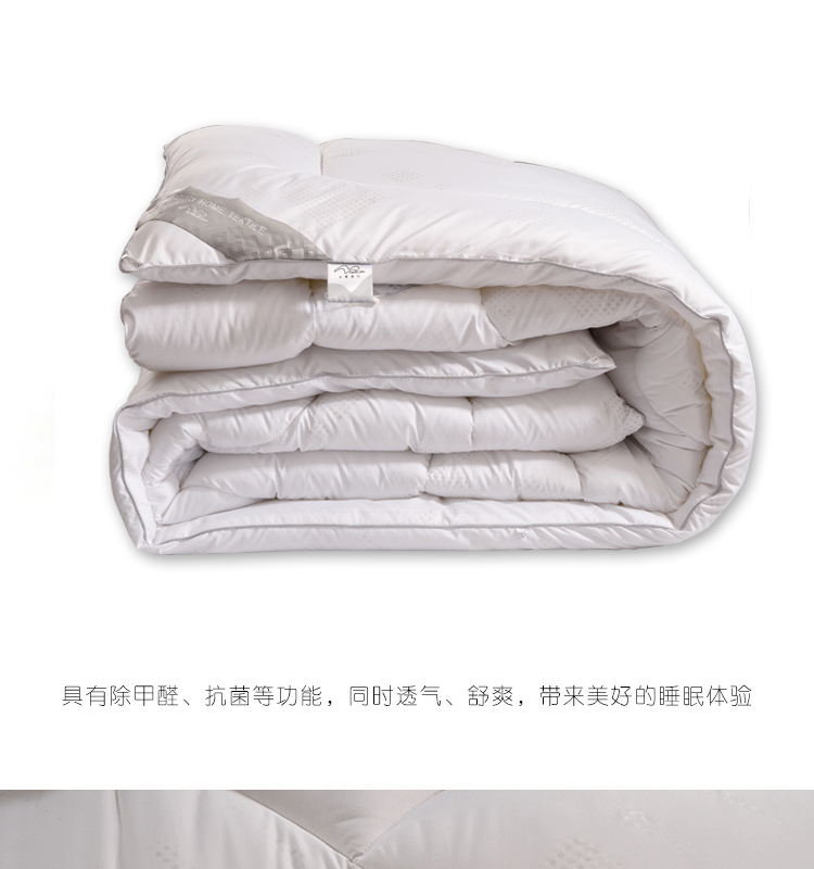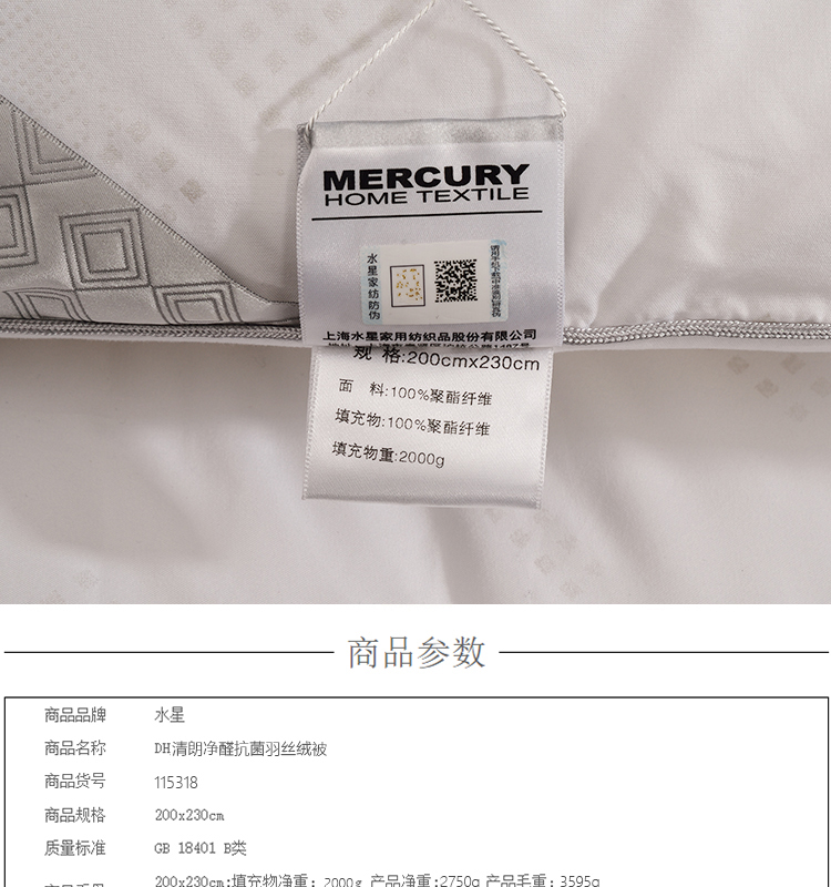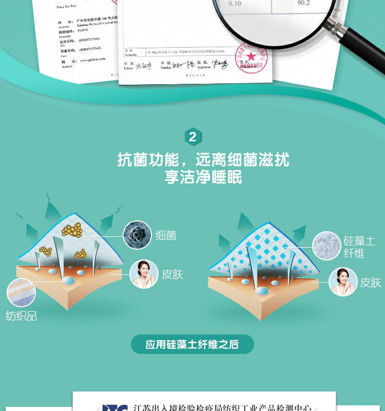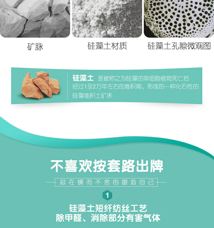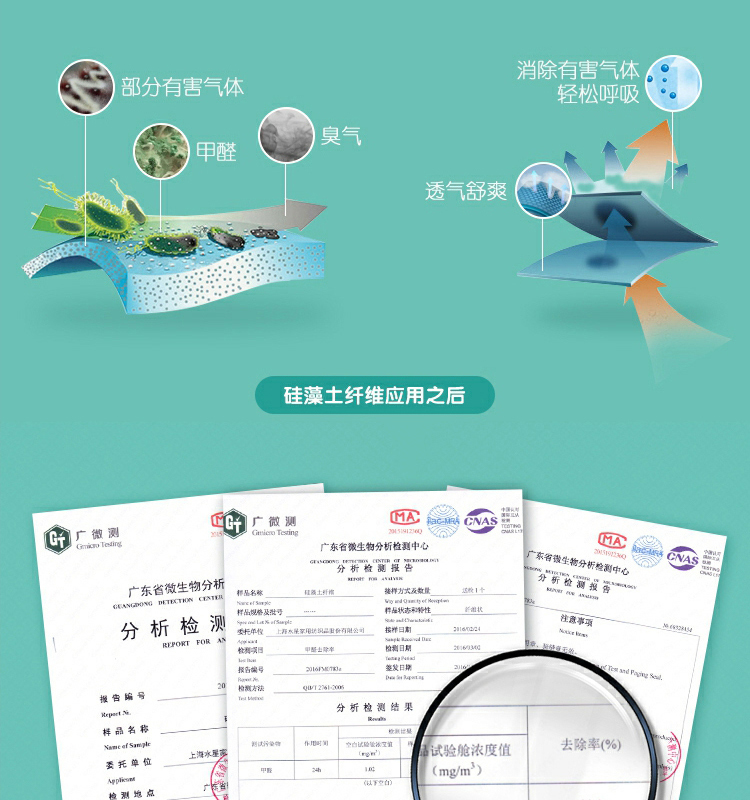 产品说明: 水星硅藻净享科技,把硅藻土运用到家纺领域,研制出多种含有硅藻土成分的纤维材料,为您的睡眠保驾护航。硅藻土成分纤维的三重作用:分解空气中的甲醛;抑制常见细菌和螨虫的生长;释放负离子,净化空气。