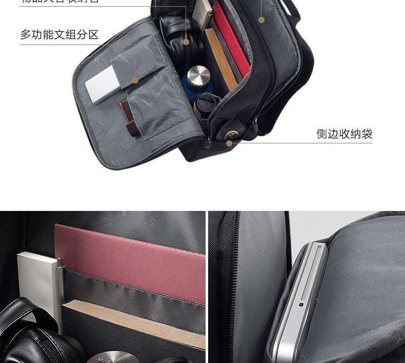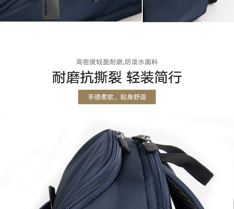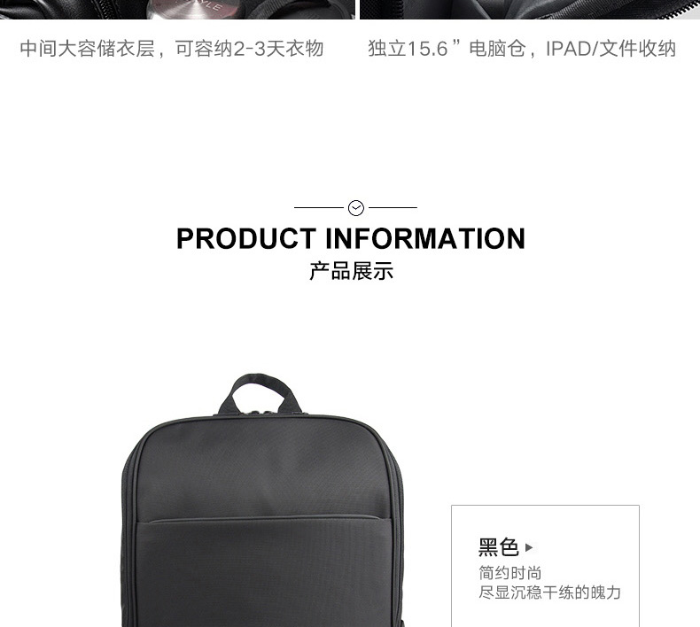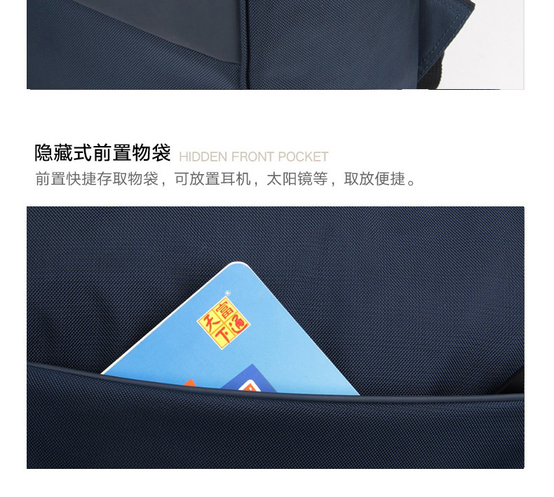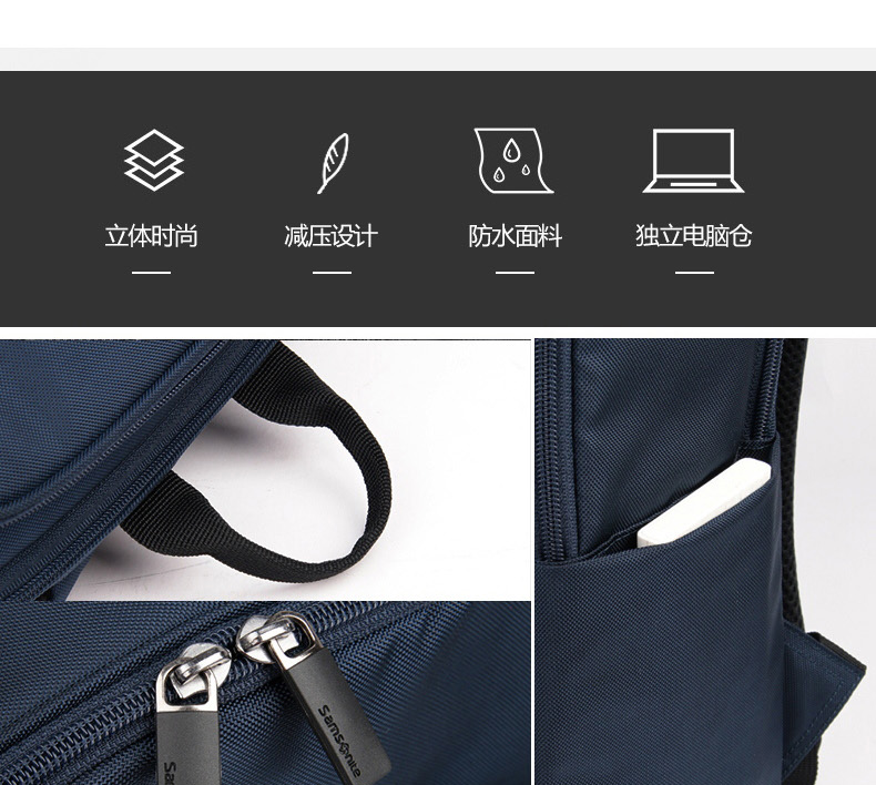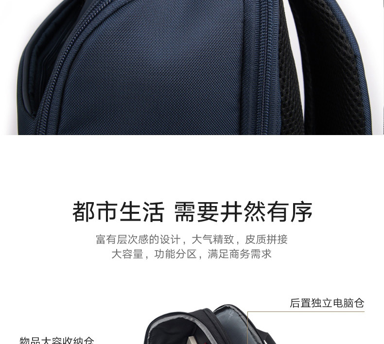商品特点/卖点: 立体造型设计,简约流畅的线条轮廓,合理的内部大空间结构兼修商务时尚与都市的休闲。高密度轻盈,防泼水面料,耐磨抗撕裂。