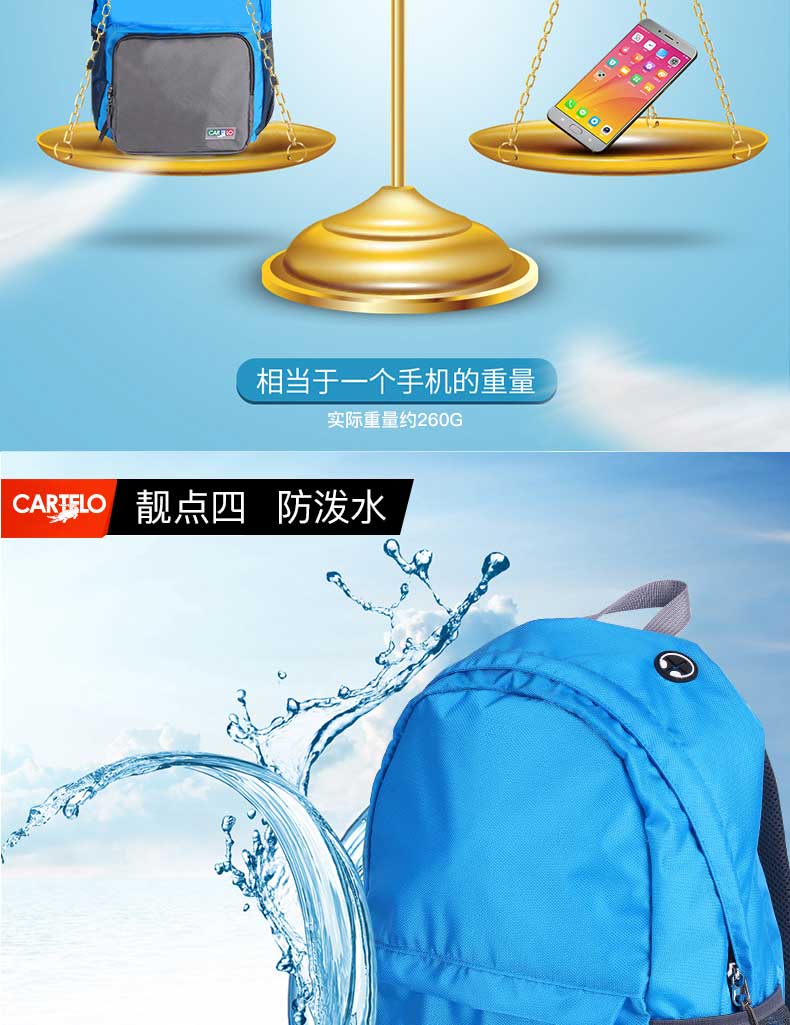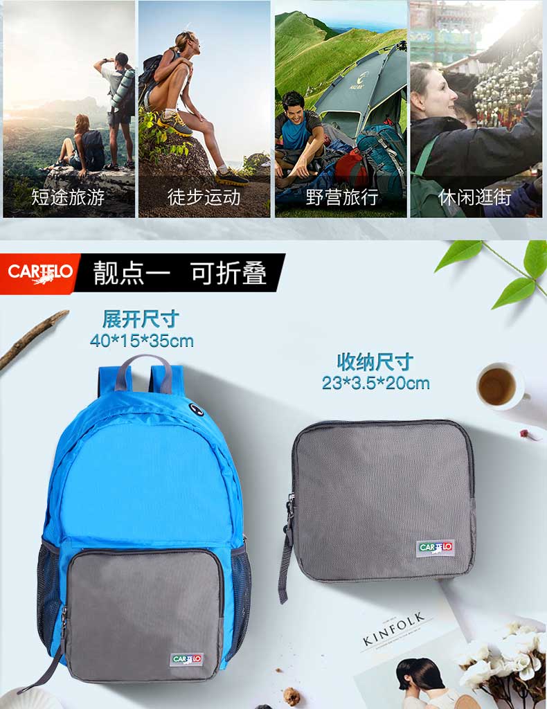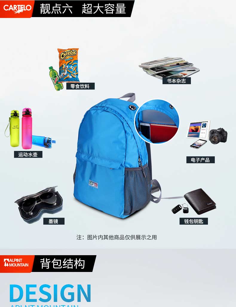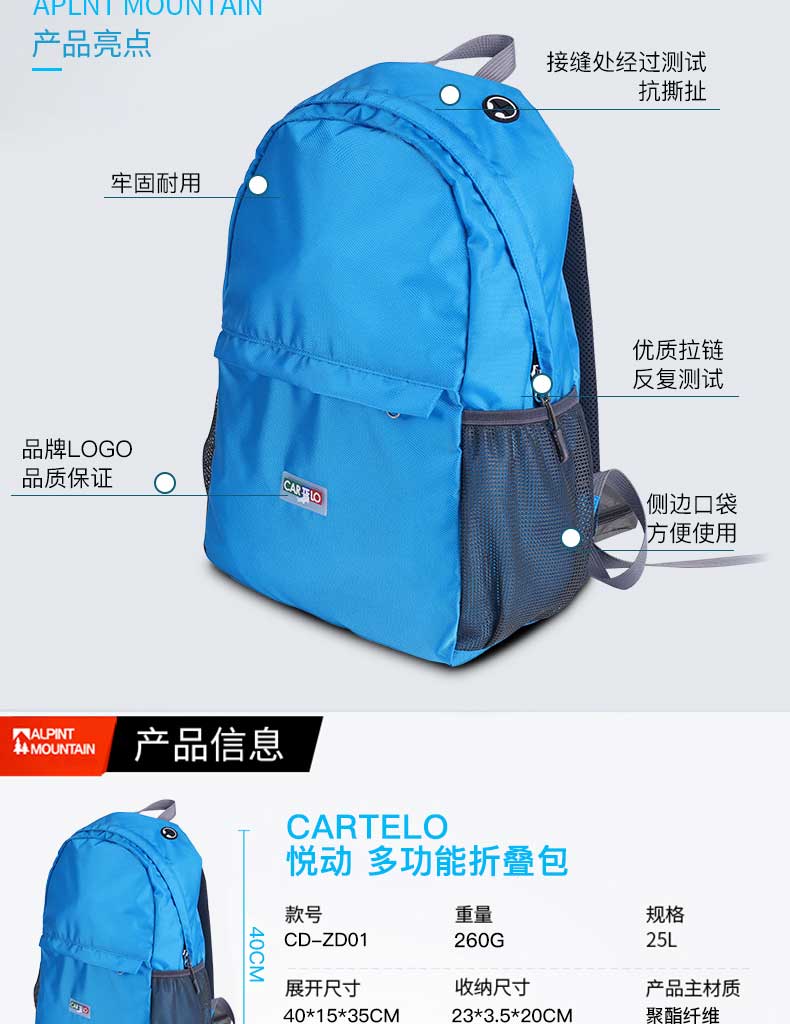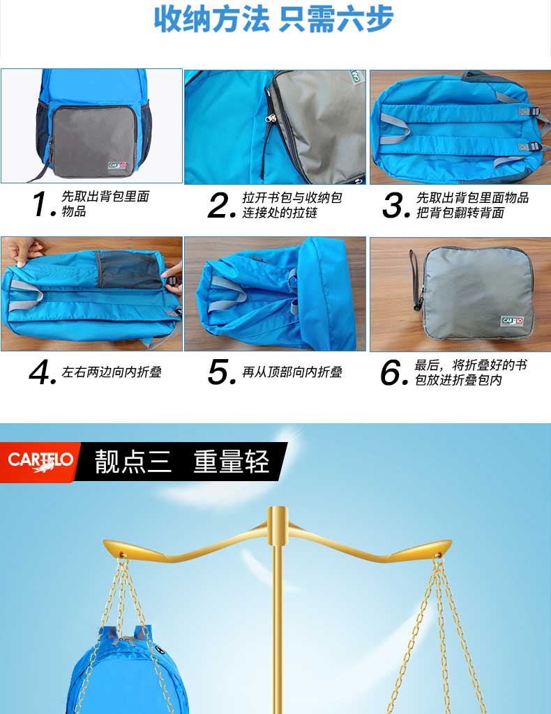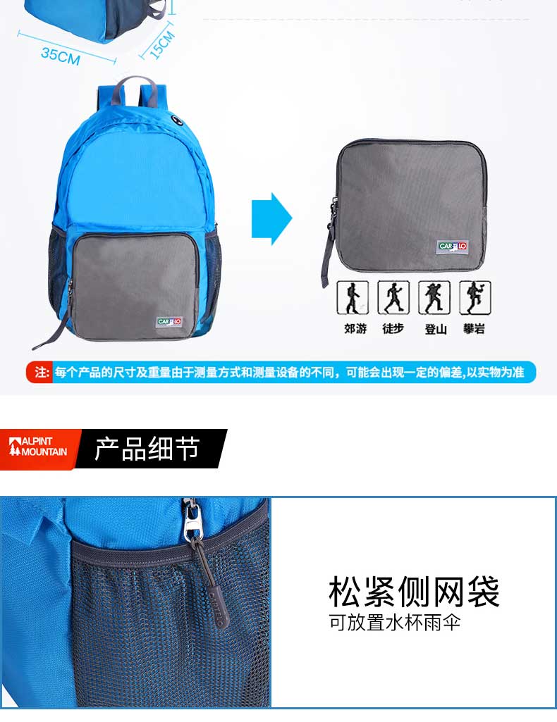 产品材质:聚酯纤维 产品尺寸:40*15*35CM 包装尺寸:23*3.5*20CM 外箱尺寸:47*42*53CM 毛重/净重:13.8KG /12.6KG 装箱数:60PCS/箱 执行标准:QB/T 1333-2010 可拆卸,既单独收纳包,又背包使用,一包多用透气性强,材料轻盈; 收纳,便于携带,不占地方; 舒适透气背带,符合人体力学设计,承重力大的惊人; 超大容量,内设隔层,让你出行无;忧 轻松收纳,“0”压力。