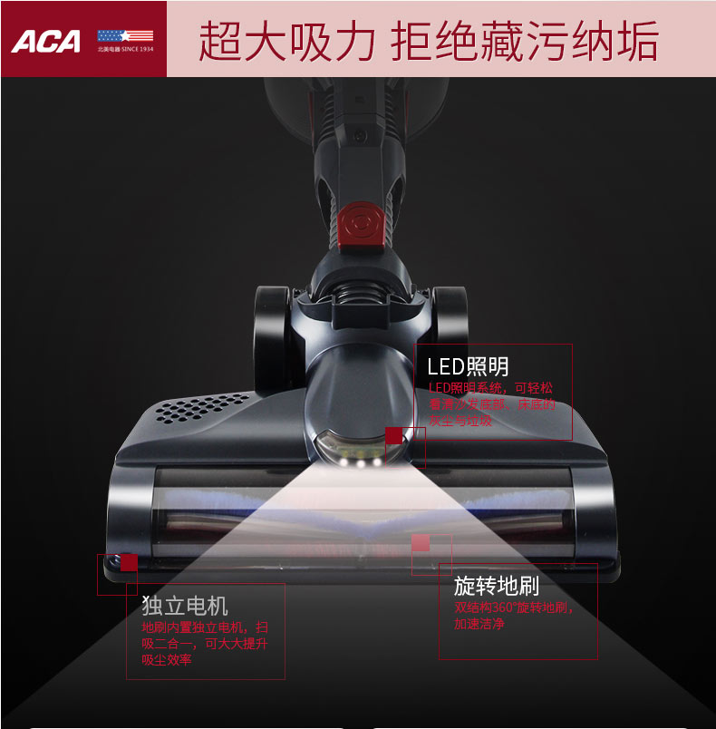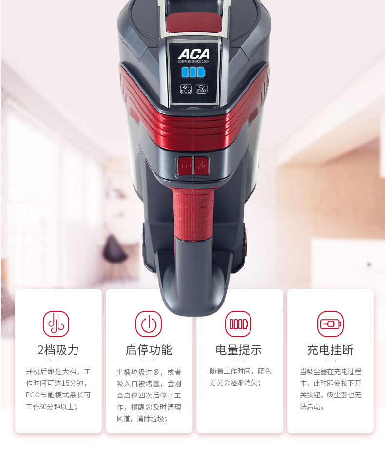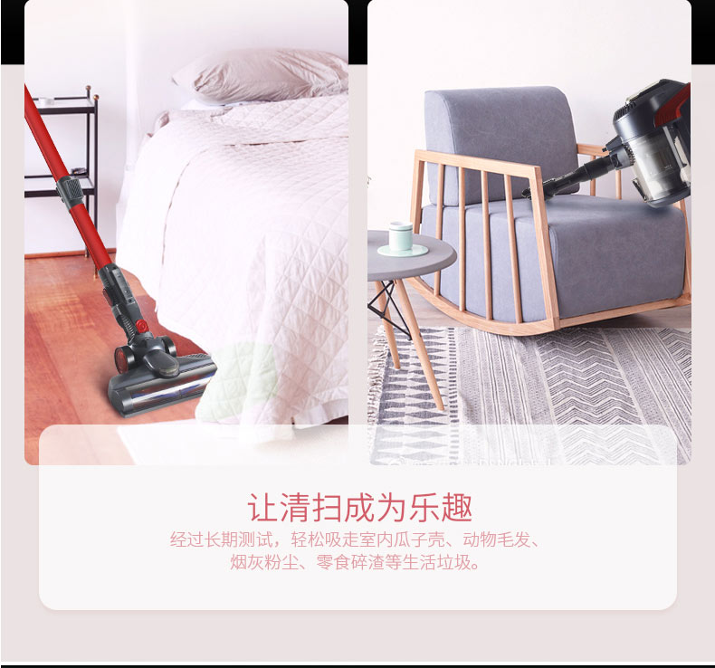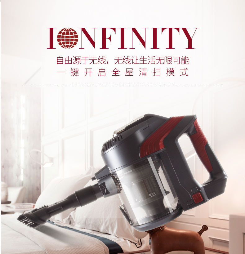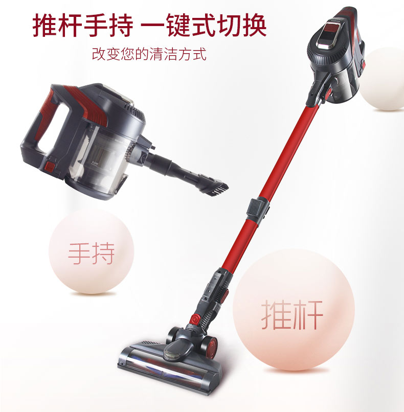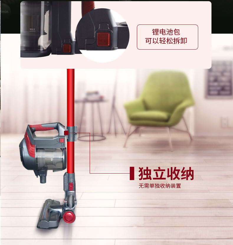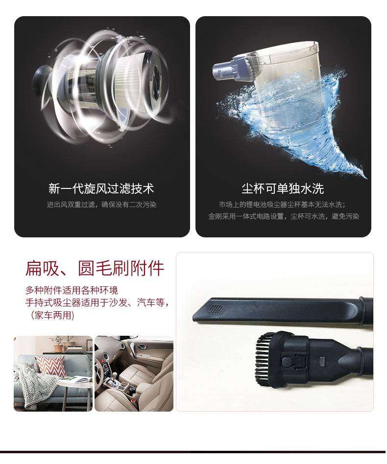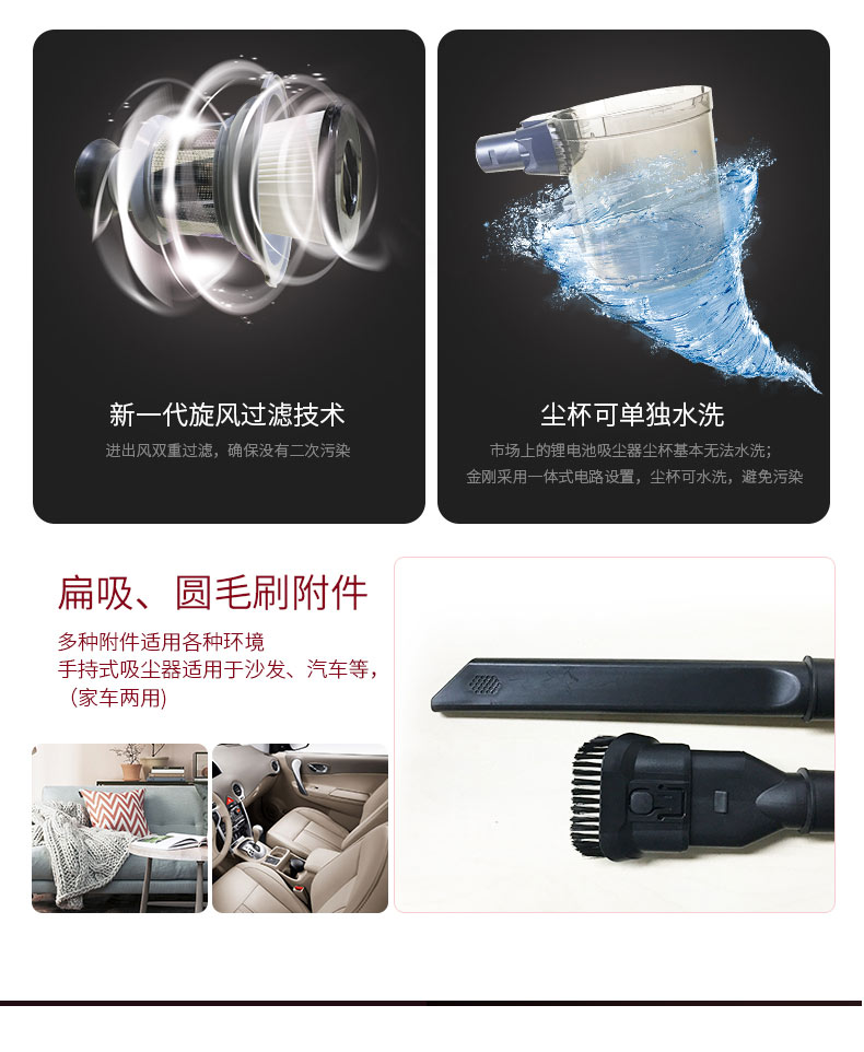 额定功率:120W 额定电压:22.2V DC 容 量:0.6L 产品尺寸:1220*225*243mm 彩盒尺寸:695*285*195mm 装箱规格:6台/箱 毛 重:3.2kg 装箱规格:6台/箱 配套物件:长扁吸、圆刷 1. 无线设计,乐享除尘 2. 手持操作、轻松便捷 3. 旋风集尘系统、尘土高效分离 4. 大容量锂电、220MAH续航长效安全 5. 电动地刷、深度清洁 6. 多功能充电座,充电收纳不占地 7. 多功能附件、全方位清洁