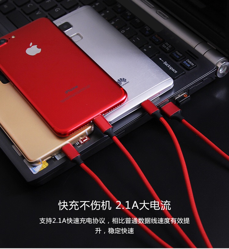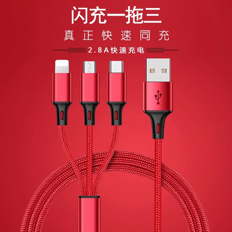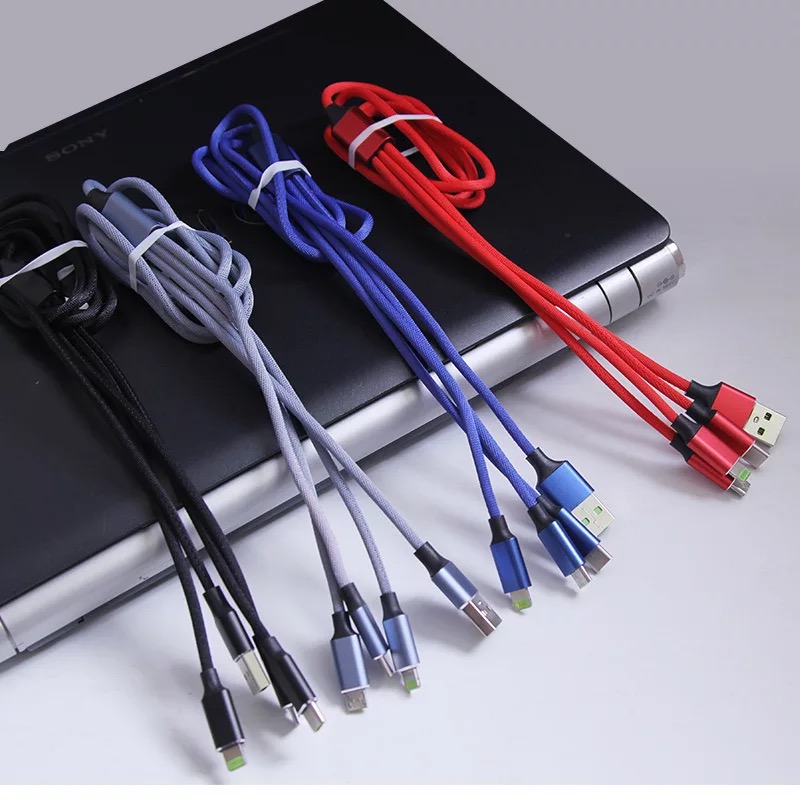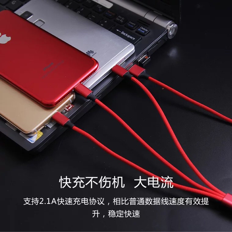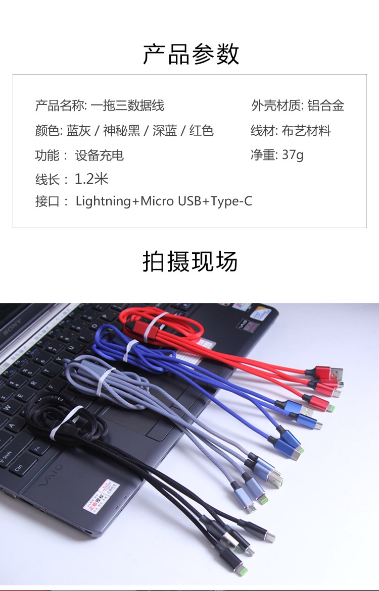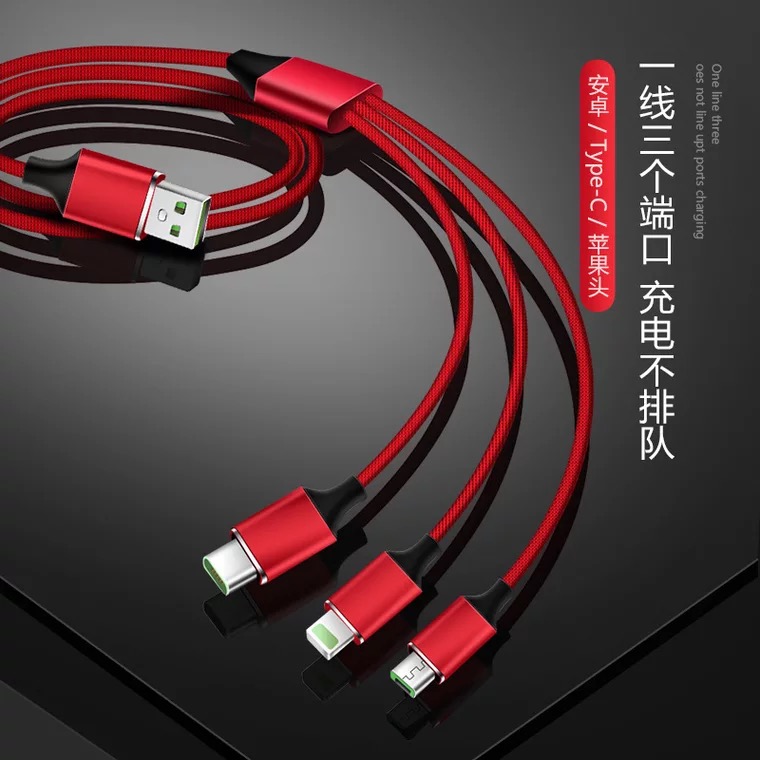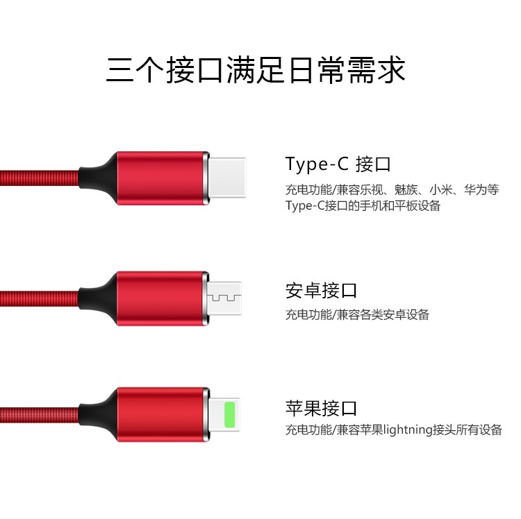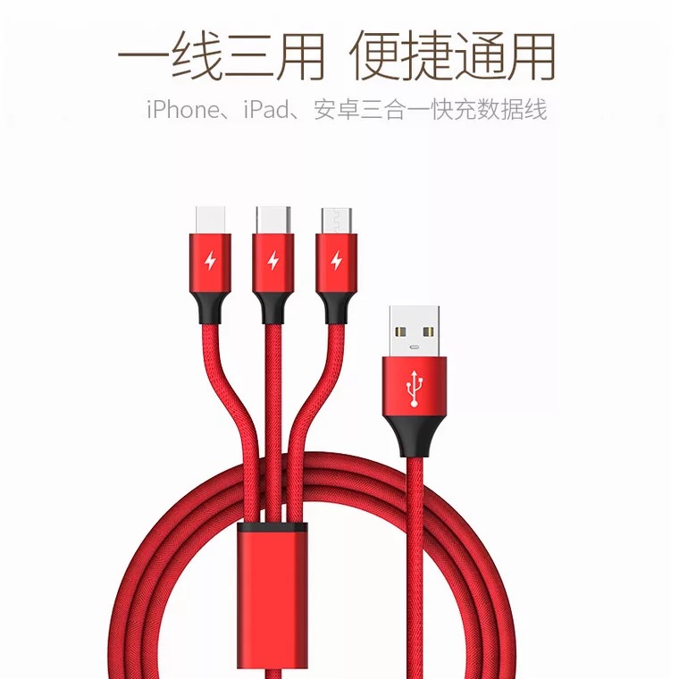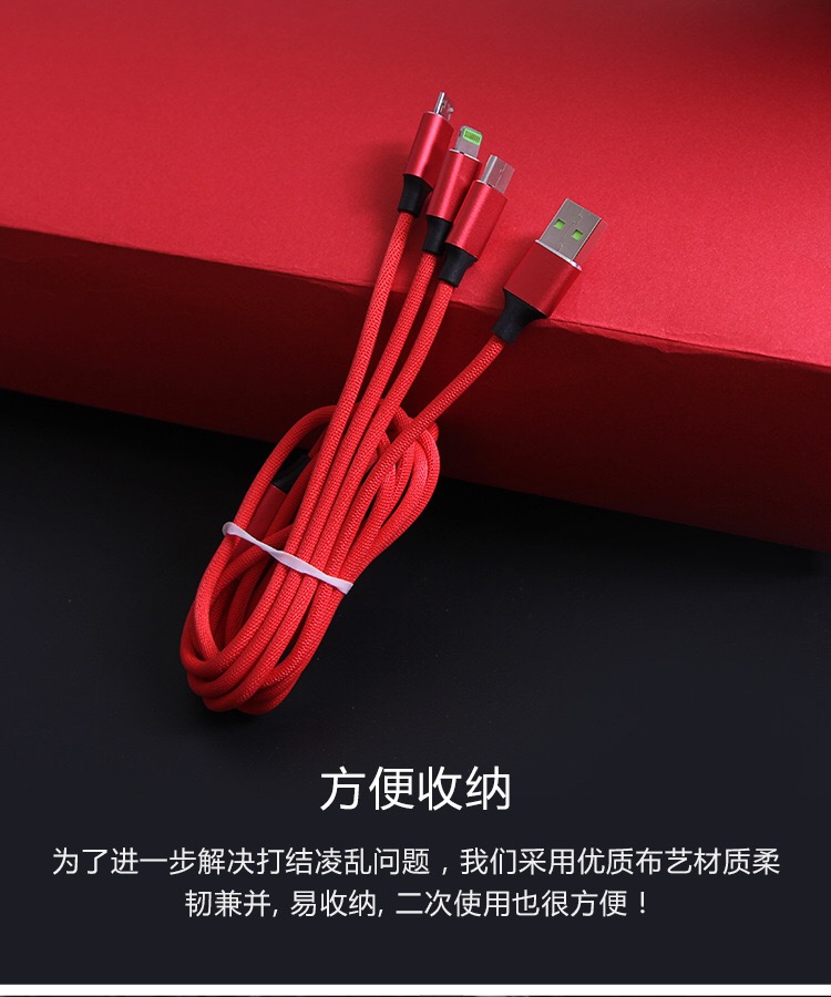 产品名称:编织绳一拖三充电线 产品型号:RX-D 产品规格:1.2M 产品功能:设备充电+数据传输 接口类型:Micro USB、Lighting、USB-C 产品材质:TPE+PE+五金 适用范围:电流电压国际通用 附属功能:精编布艺,耐磨寿命超强, 2.1A极速快充 印制工艺:激光… 可选颜色:红、蓝、黑、灰
