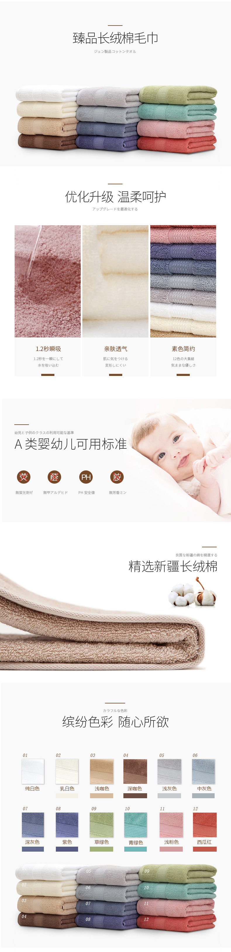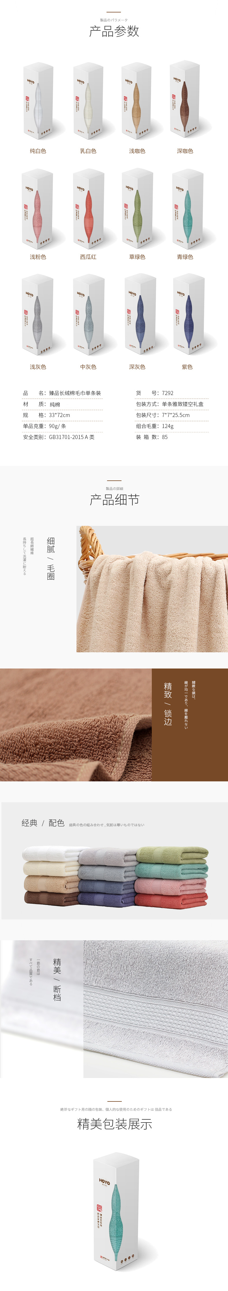 品名:7292-臻品长绒棉毛巾单条礼盒 包装形式:雅致镂空礼盒毛巾单条装 规 格:33*72cm 单品克重:90g 颜 色:1601纯白色、1602乳白色、1603浅咖色、1604深咖色、 1605浅灰色、1606中灰色、1607深灰色、1608紫色、 1609西瓜红、1610草绿色、1611浅粉色、1612青绿色 包装尺寸:7*7*25.5cm 装 箱 数 :85PCS 组合毛重:124g