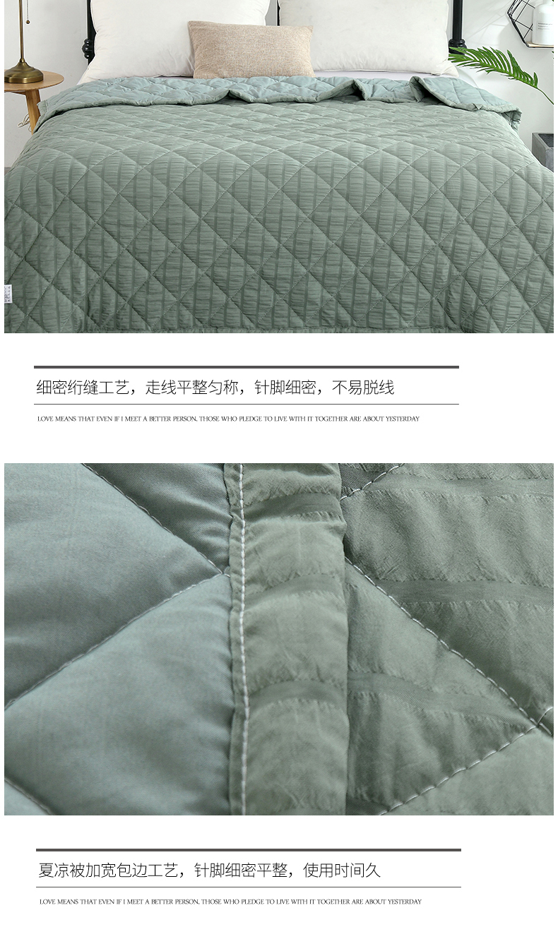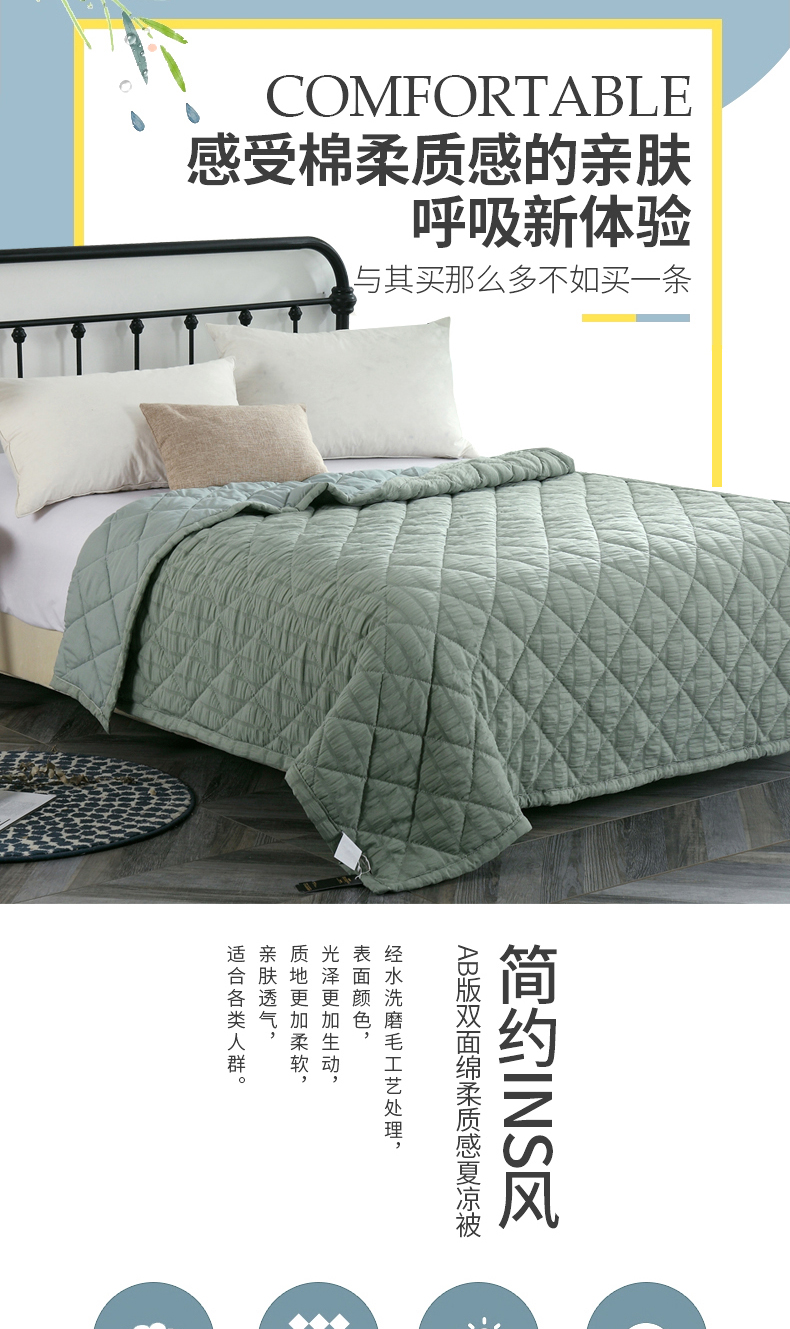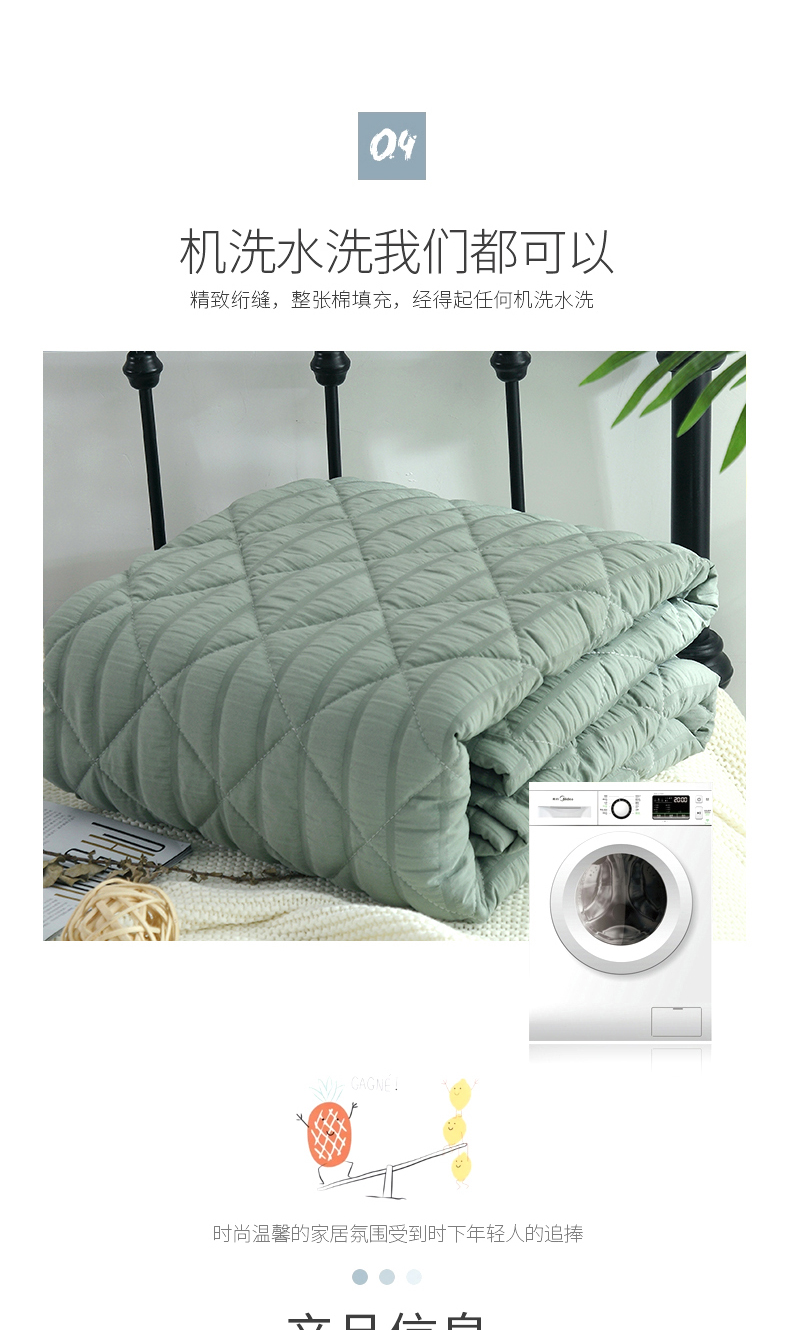 产品规格:180*200CM 面料:泡泡纱(聚酯纤维) 包装:彩盒 产品描述:采用韩国进口泡泡纱面料,轻盈透气,触感舒适,羽丝棉填充,多针绗缝工艺,给您舒适好睡眠。
