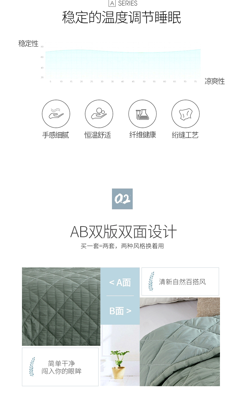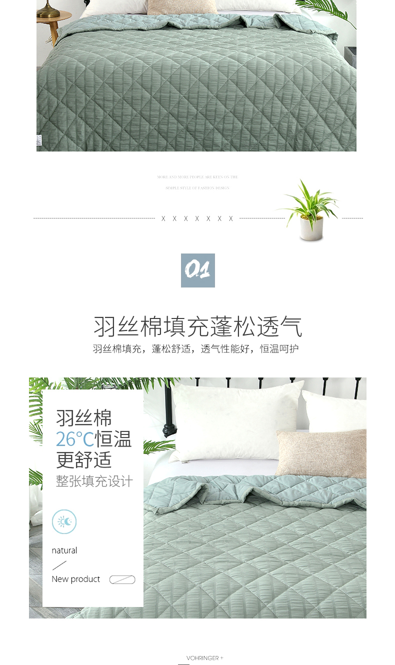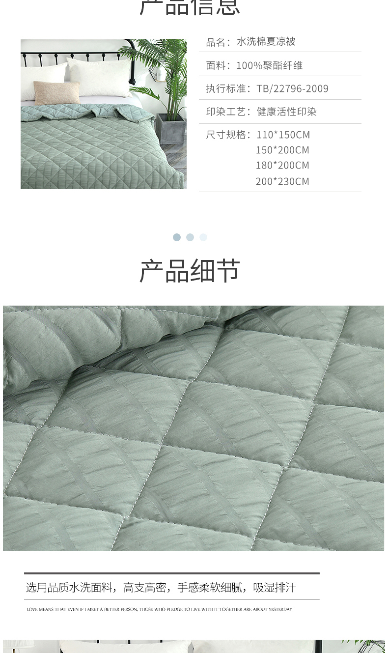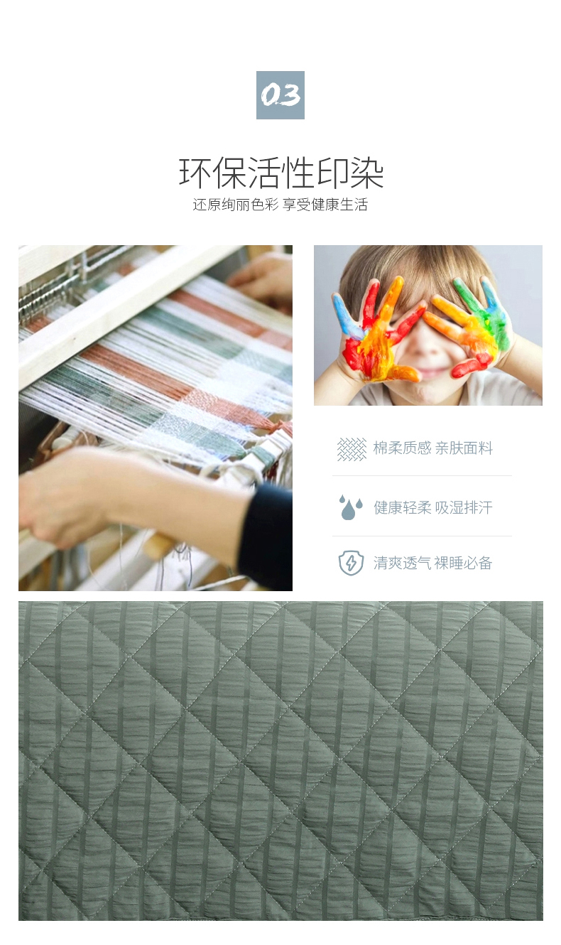 产品规格:180*200CM 面料:泡泡纱(聚酯纤维) 包装:彩盒 产品描述:采用韩国进口泡泡纱面料,轻盈透气,触感舒适,羽丝棉填充,多针绗缝工艺,给您舒适好睡眠。