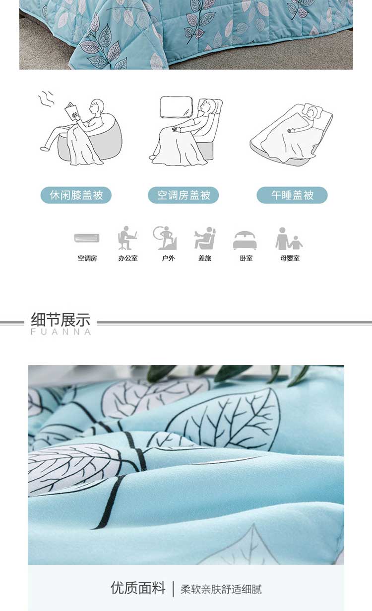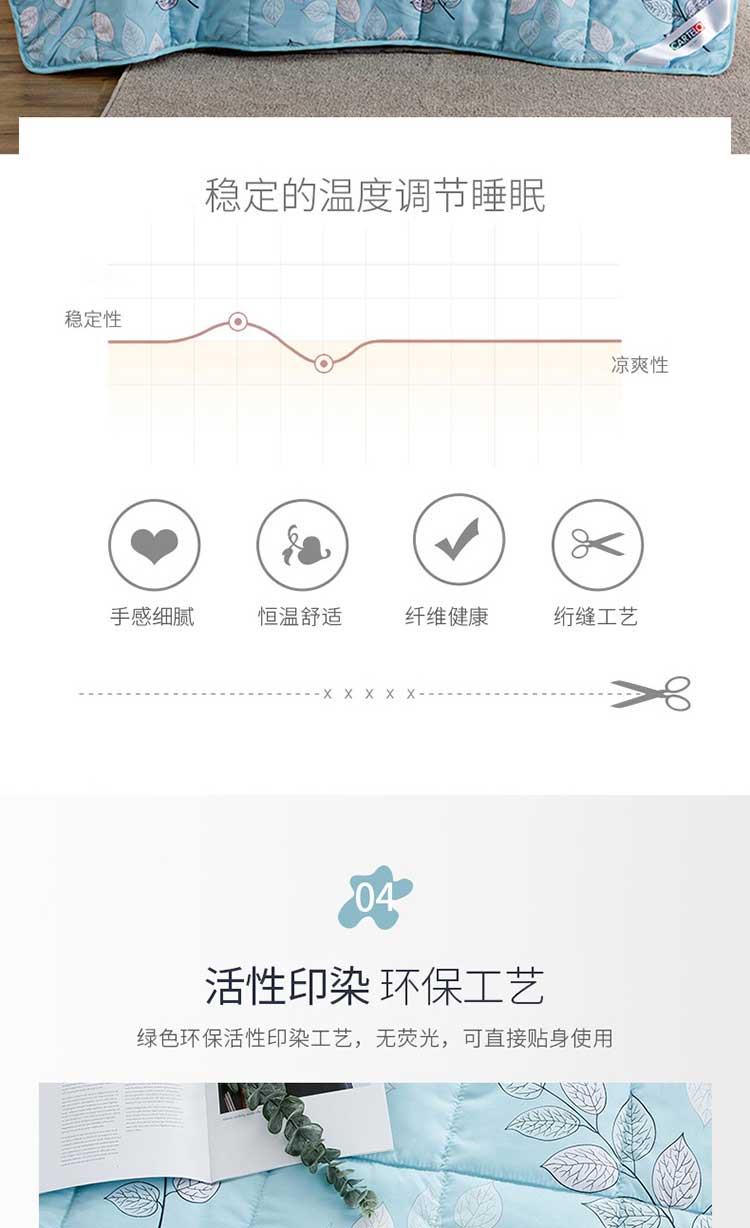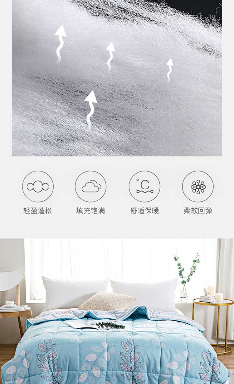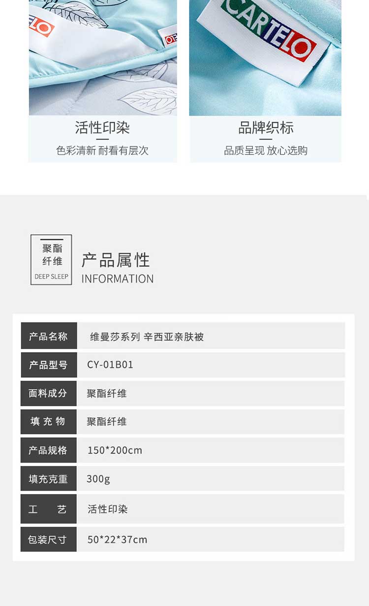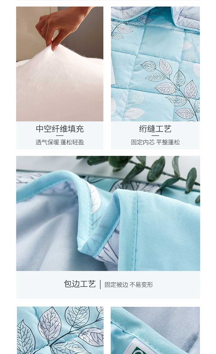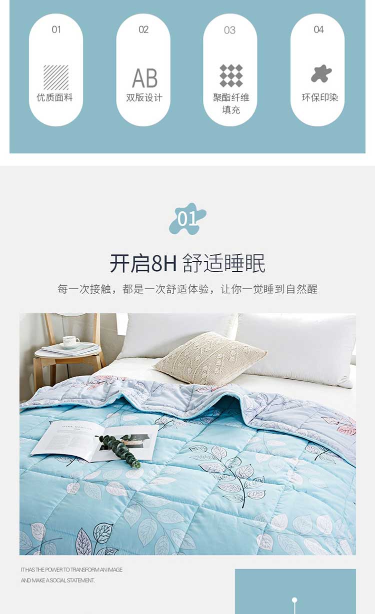 产品规格:150*200cm 产品材质:面料成分: 聚酯纤维 填充成分: 聚酯纤维 填充净重:300g /400g 工 艺:活性印染 包装尺寸:50x22x37cm 毛重净重:1.2kg /0.7kg 毛重净重:1.4kg /0.9kg ◆ 透气吸湿,带走闷热; ◆ 活性印染,色彩清新耐看有层次; ◆ 优质好芯,由内到外,营造舒爽睡眠环境; ◆ 密实紧致不跑绒,无荧光,可直接贴身使用; ◆ 双版设计,实用多变,轻轻一翻又是另一种心情。