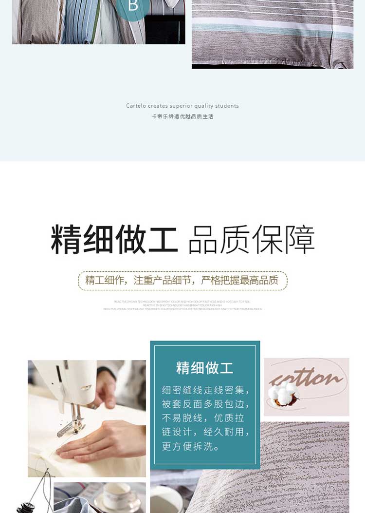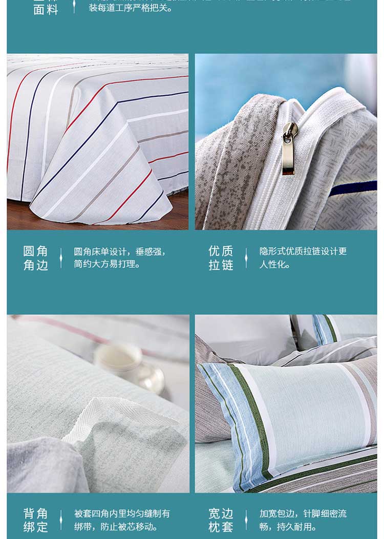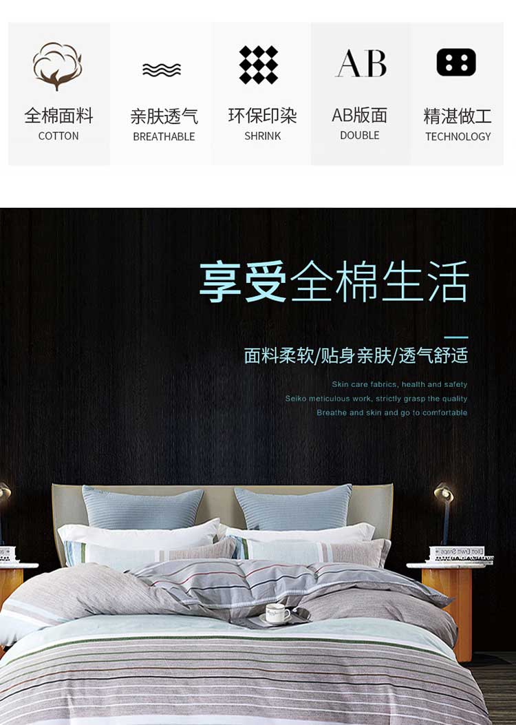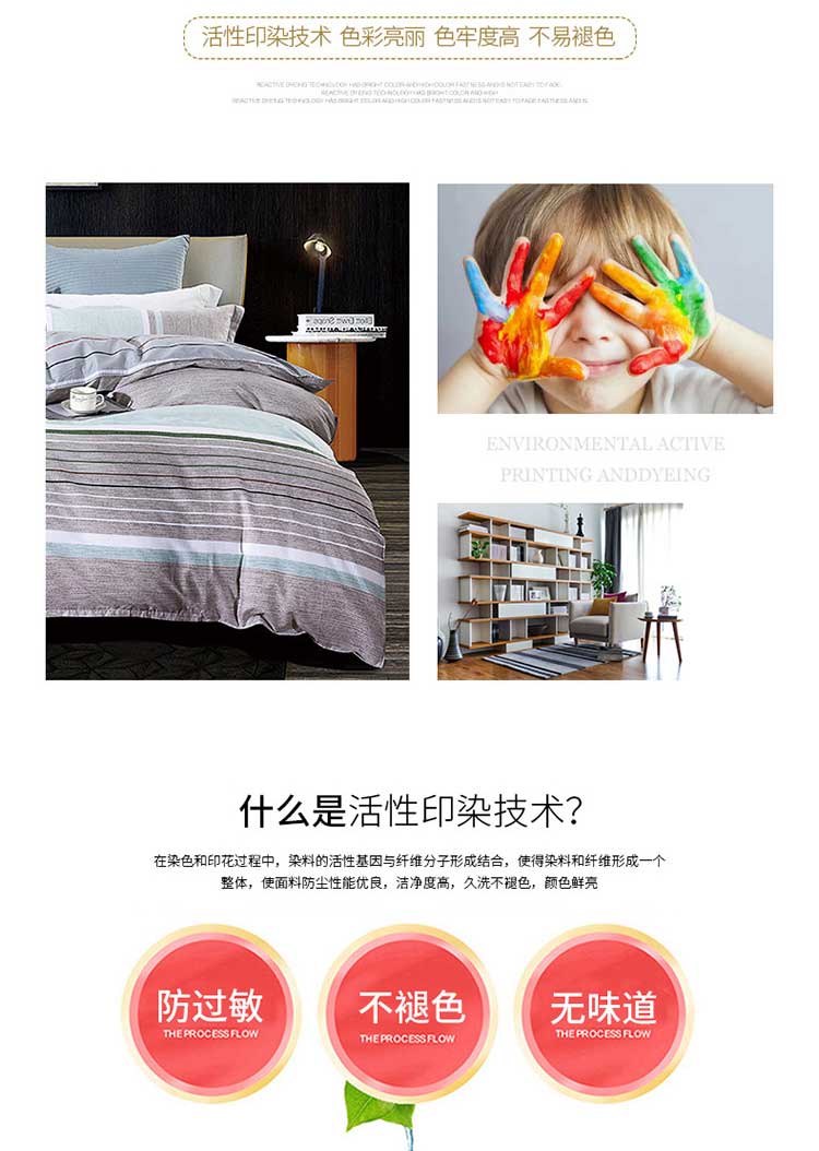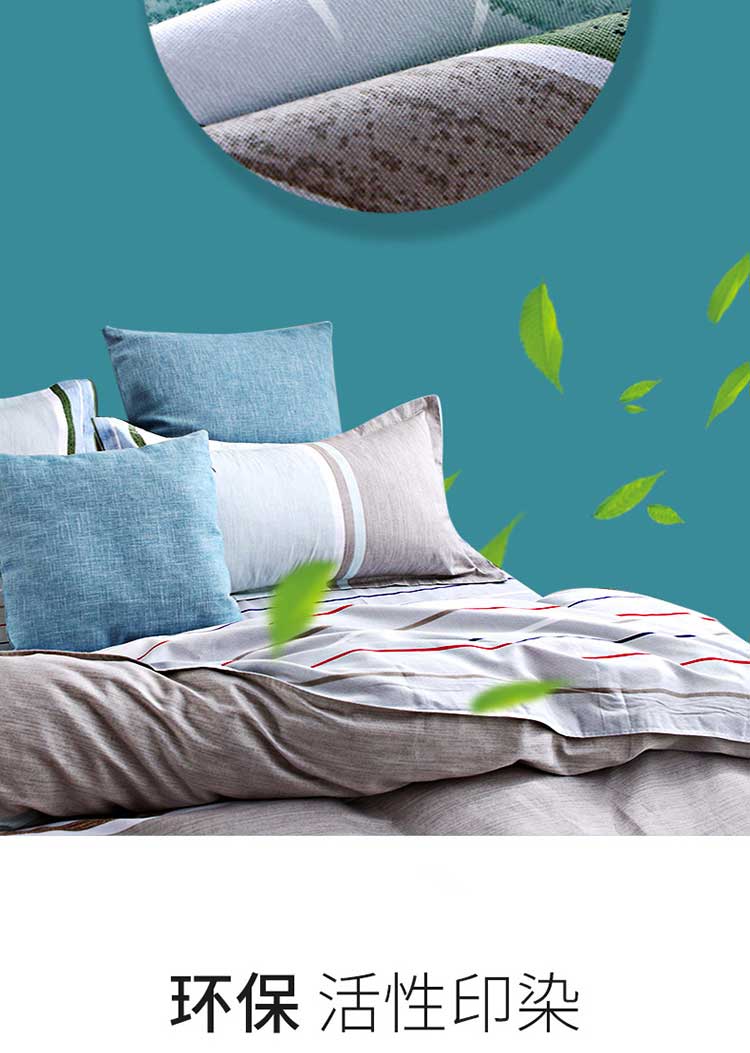产品规格: 被套:200*230cm 床单: 230*230cm 枕套:48*74cm*2 产品材质: 棉100% 工 艺:活性印染 包装尺寸: 38*29.5*7cm 外箱尺寸: 40*33.5*65cm 毛重净重:2.3kg/1.8kg 装 箱 数: 8套 ◆ 亲肤面料,安全健康; ◆ 透气排汗,保暖性好,牢牢锁住温度; ◆ 精细做工,严格把握品质; ◆ 活性印染工艺,色牢度高,不易缩水; ◆ 十字绑带和菱形卡纸,更添尊贵与大气。