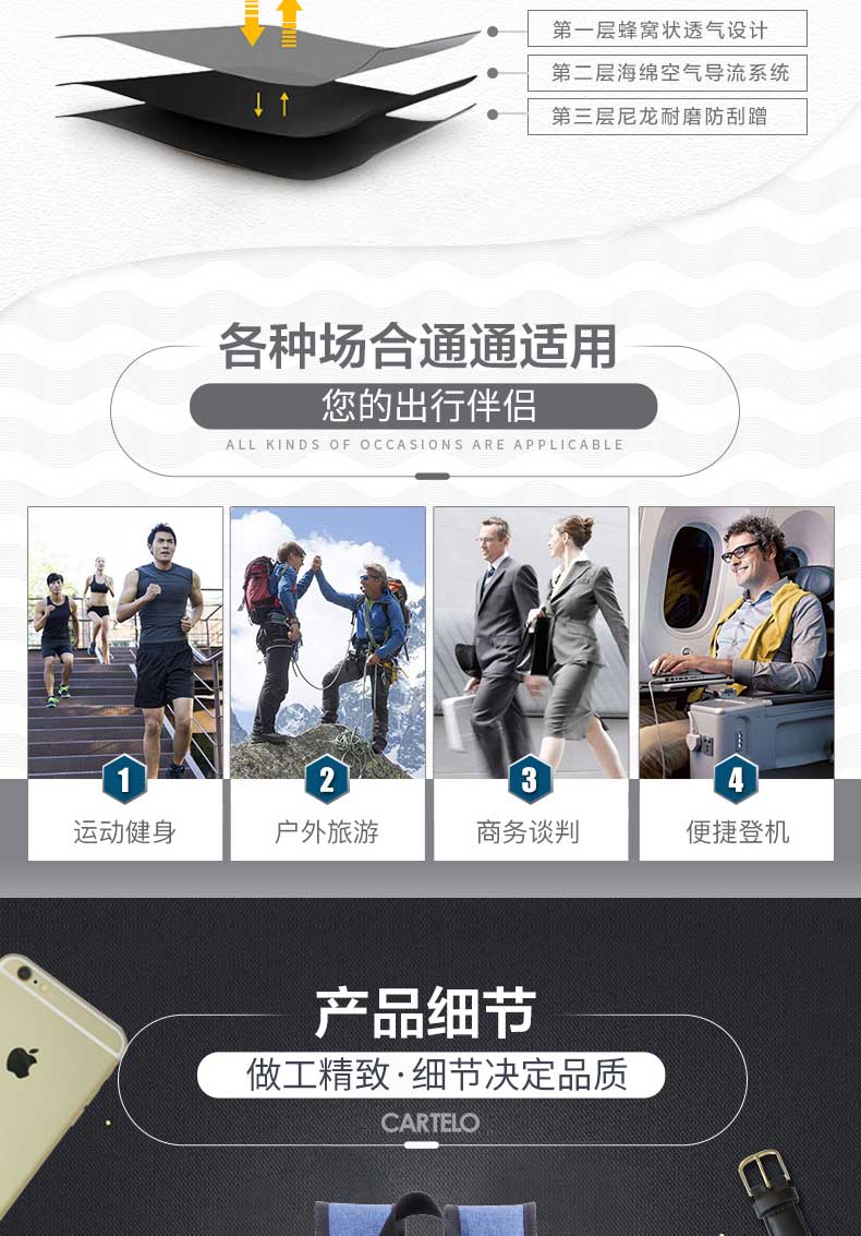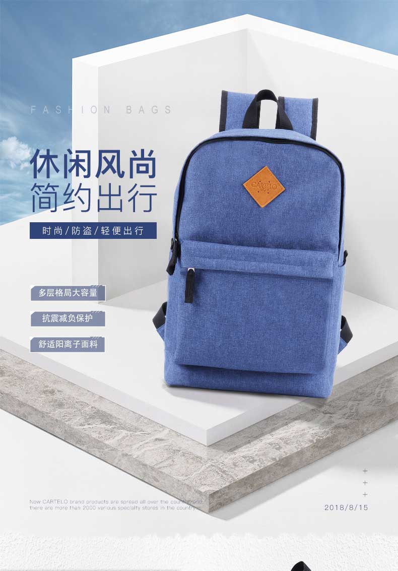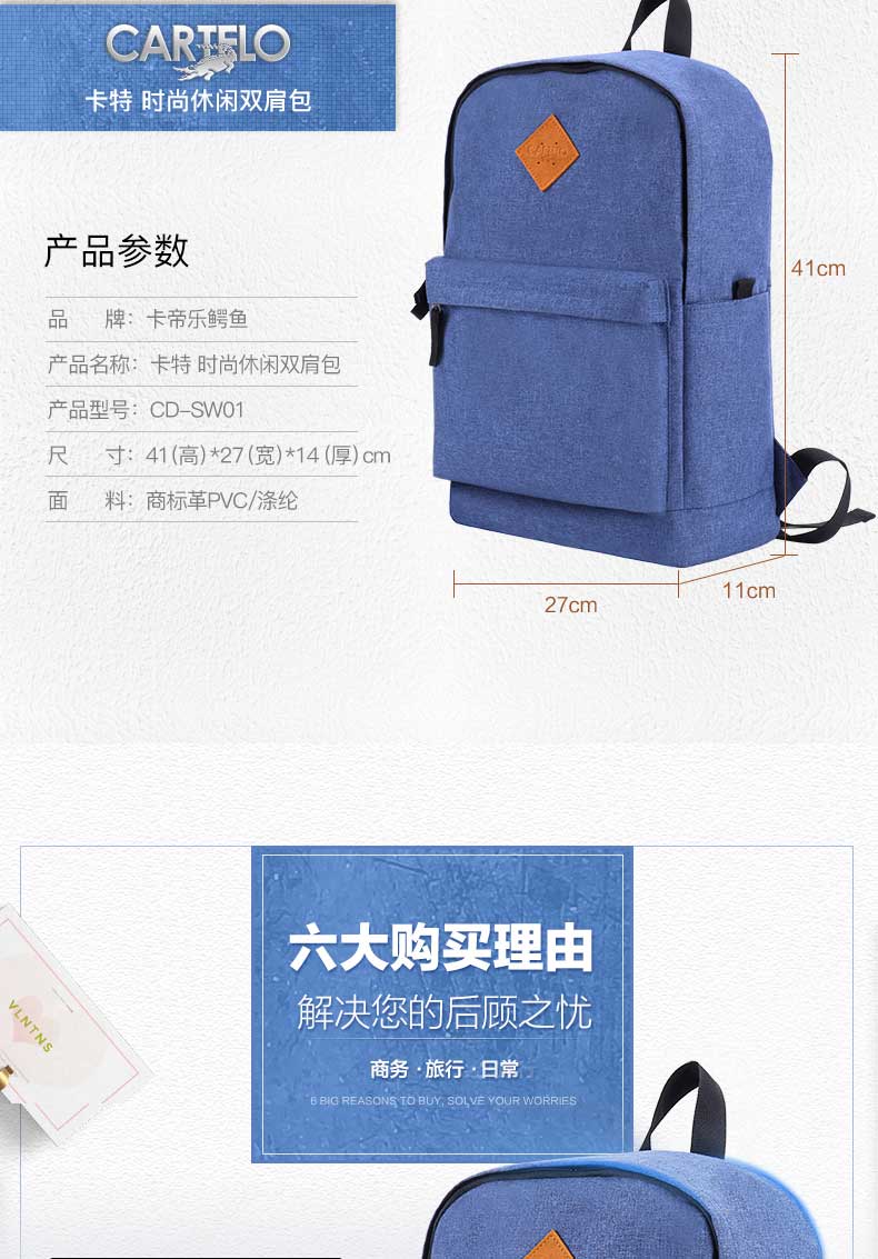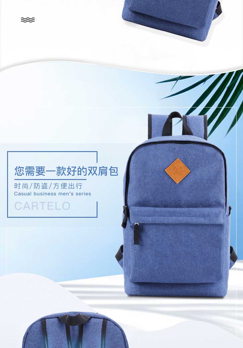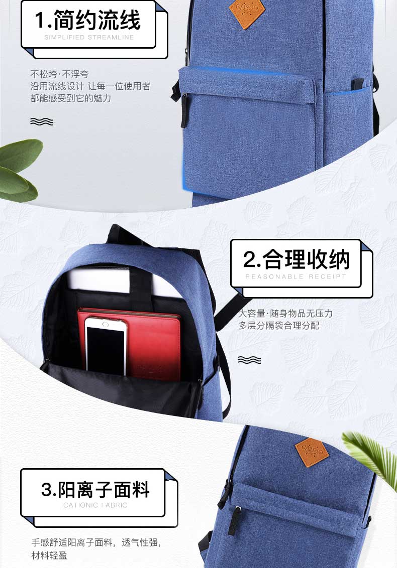 产品材质:300D阳离子,商标革PVC 210D涤纶 产品尺寸:41*27*14CM 包装尺寸:41.5*27.5*15CM 外箱尺寸:40*46*60CM 毛重/净重:13.8KG /12.5KG 装箱数:25PCS/箱 执行标准:Q防盗前盖设计,无忧出行; 人体工程学背带设计,减负; 手感舒适阳离子面料,透气性强,材料轻盈; 超大容量,内设隔层; 前置口袋,多收纳。 /T 1333-2010