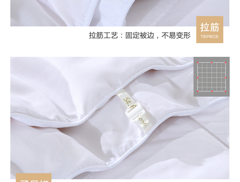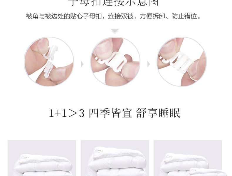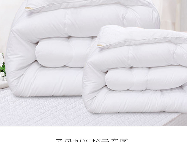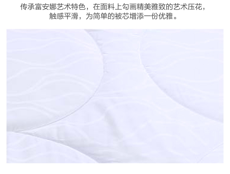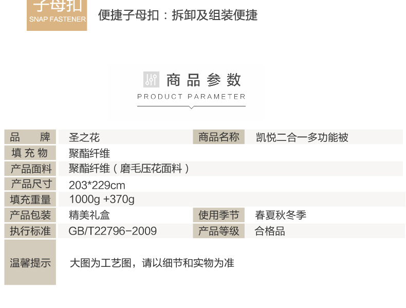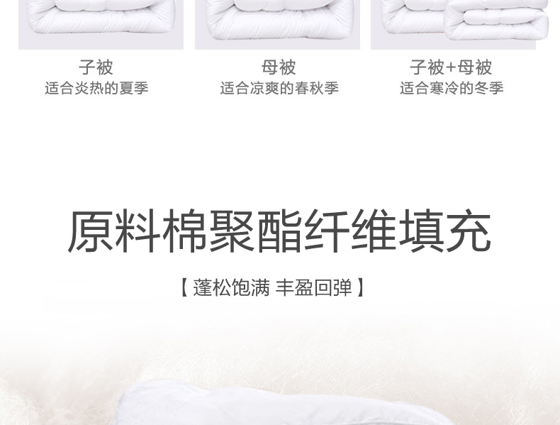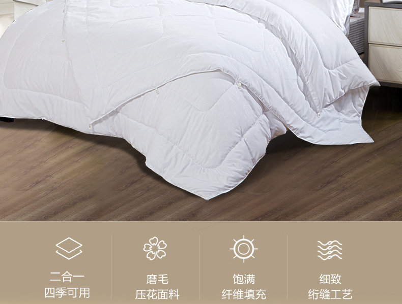 品牌:圣之花 面料:磨毛压花面料(聚酯纤维) 填充物:100%聚酯纤维 填充克重:1000g+370g 产品规格:203*229cm 产品颜色:白 产品特点:1、选用磨毛压花面料,优质中空螺旋纤维填充,蓬松柔软,透气性佳,长期使用变形和塌陷、成团;2、绗缝裥棉工艺,既有效固定纤维,又不失蓬松度;3、1+1=3,采用人性化的二合一设计,满足不同季节的睡眠需求,人性化子母扣,给您四季皆宜的睡眠享受,实用性更高。