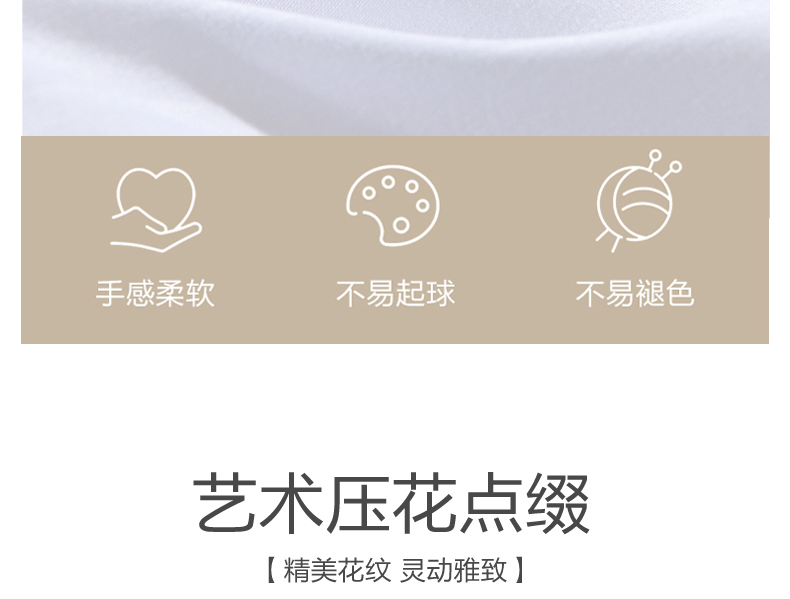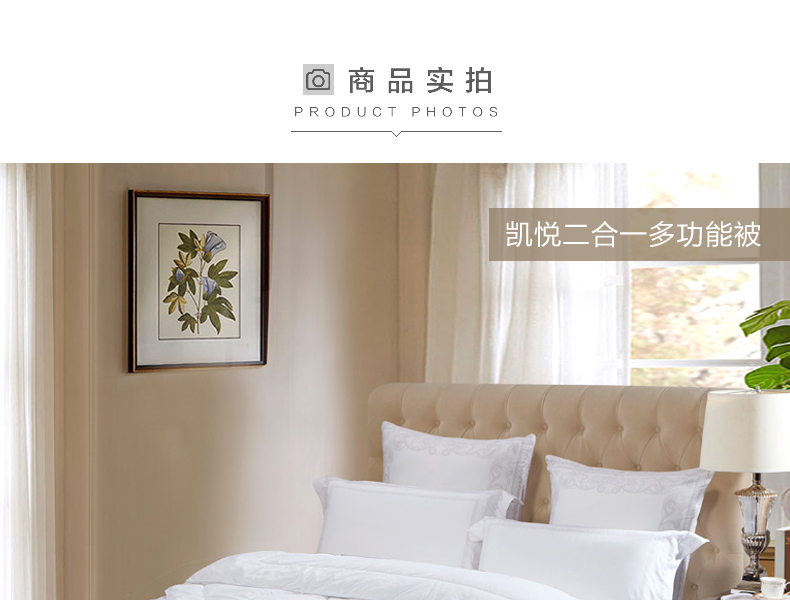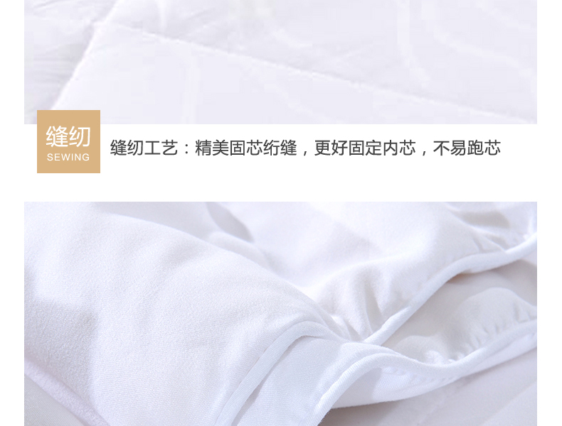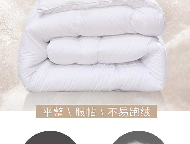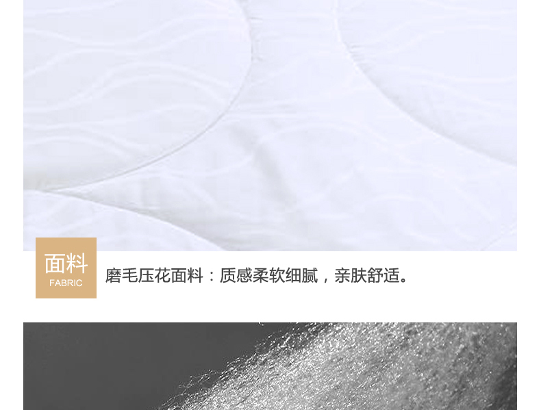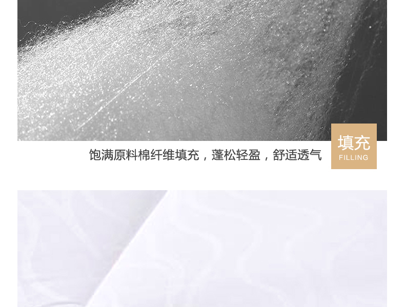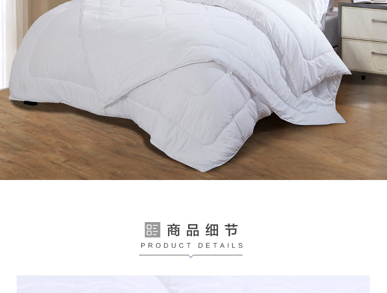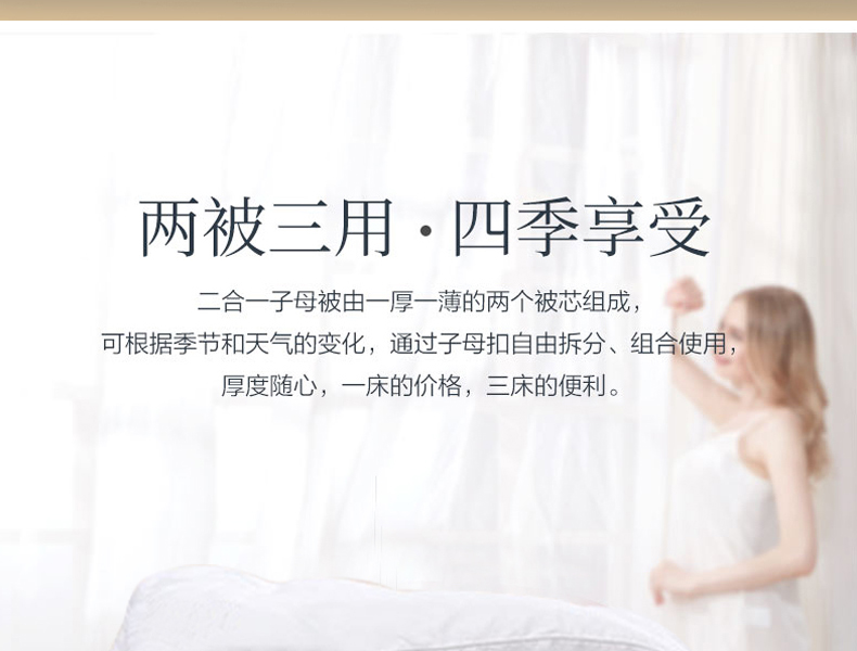 品牌:圣之花 面料:磨毛压花面料(聚酯纤维) 填充物:100%聚酯纤维 填充克重:1000g+370g 产品规格:203*229cm 产品颜色:白 产品特点:1、选用磨毛压花面料,优质中空螺旋纤维填充,蓬松柔软,透气性佳,长期使用变形和塌陷、成团;2、绗缝裥棉工艺,既有效固定纤维,又不失蓬松度;3、1+1=3,采用人性化的二合一设计,满足不同季节的睡眠需求,人性化子母扣,给您四季皆宜的睡眠享受,实用性更高。