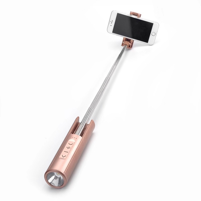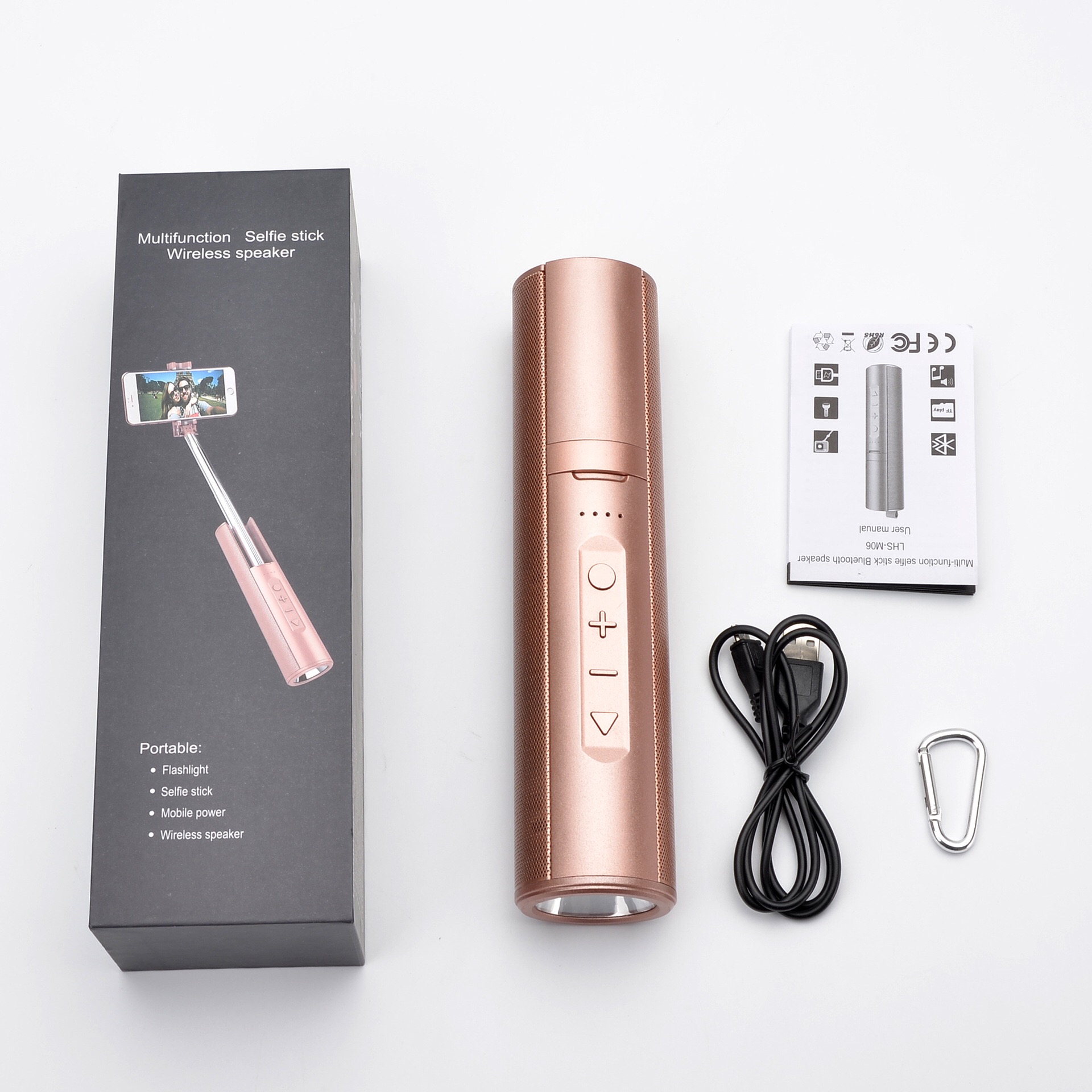 产品名称:四合一多功能音箱(自拍杆,充电宝,电筒,音箱) 产品规格:201*215*48mm(自拍杆拉伸长度635mm) 产品重量:360g,带彩盒550g 电芯类型:聚合物电池 电池容量:4800mAh(实际容量) 充电时间:3H左右 使用时间:10H左右 外壳材质:ABS,钢网,不锈钢 蓝牙距离:10米 可选颜色:黑,银,玫瑰金(黑色现货居多) 印制工艺:激光,移印 附加功能:蓝牙音箱,插卡音箱, 蓝牙自拍杆,LED手电筒,充电宝