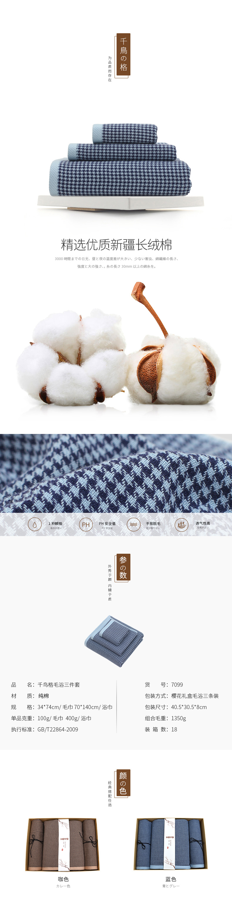 品名:7099-千鸟格毛浴三件套 包装方式:樱花礼盒毛巾*2+浴巾*1 规 格:34*74cm、70*140cm 单品克重:100g、400g 颜 色:3526蓝色、3527咖色 包装尺寸:40.5*30.5*8cm 装 箱 数 :18PCS 组合毛重:1350g