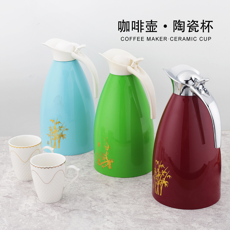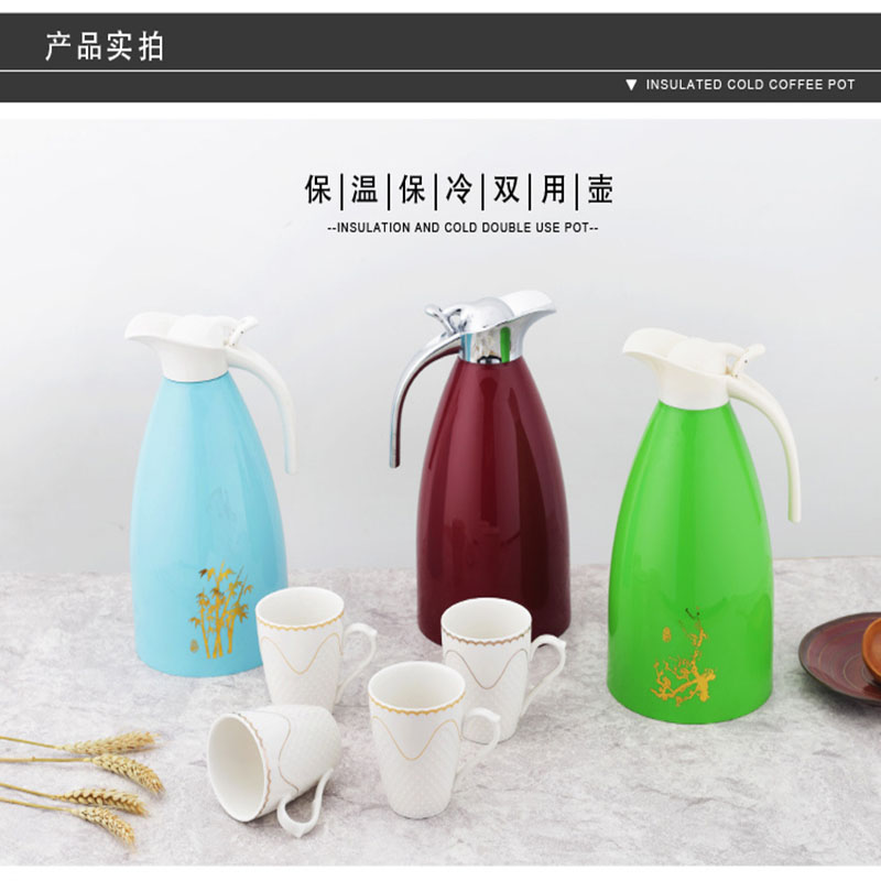 型号:LYFS-8607 容量:2L 材质:奥氏体不锈钢 装箱数:12/箱 外箱尺寸:51✘49✘61cm 主要特点: . 外层为塑料(新料),内层不锈钢(201#或304#不锈钢); . 使用德国发泡技术, 保温时间更持久; . 塑料电镀手柄,或纯色塑料手柄, 均可搭配。 . 全瓷陶瓷杯, 上品釉色均净, 备注:(304内胆加6元)