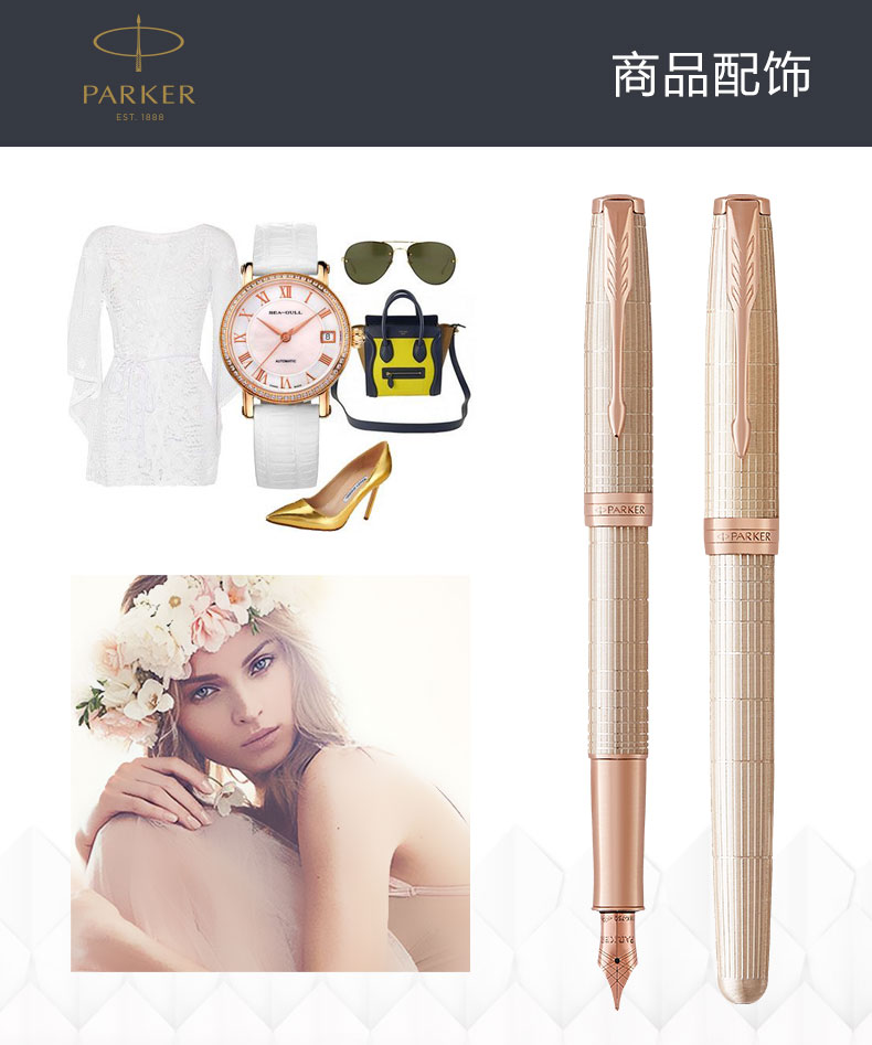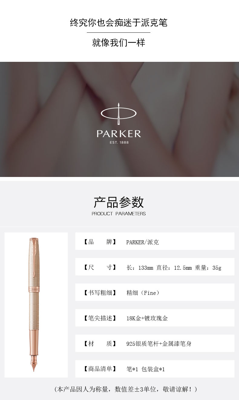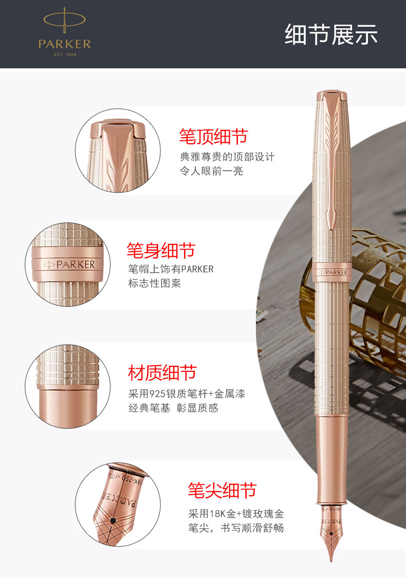商品名称:派克(PARKER)2015卓尔玫瑰流年墨水笔 类型:钢笔 商品属性:笔尖:18K金+镀玫瑰金 笔身:925纯银+雕刻格纹图案+保护漆 笔饰:镀玫瑰金 笔帽:925纯银+雕刻格纹图案+保护漆 数量:单支装 零售价:¥5150