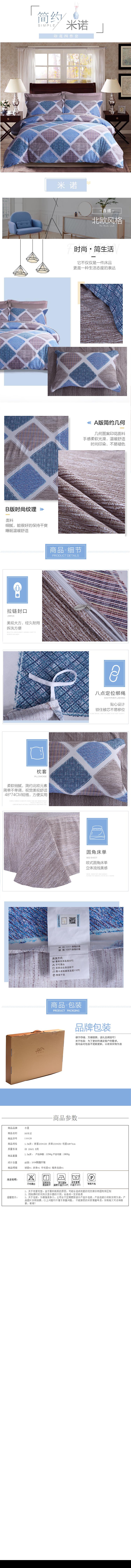 材 质:100%聚酯纤维 规 格:被套:200*230cm 床单:230*250cm 枕套:48*74cm*2 产品说明: 简约主义意味着简练、优雅、不失亲切的生活环境。 它们既有实用性又颇为舒适,在我们现代化快节奏的生活中,满足精神上和审美上的需要。