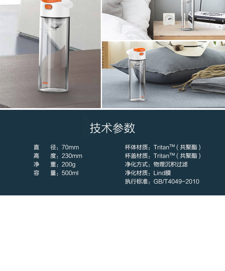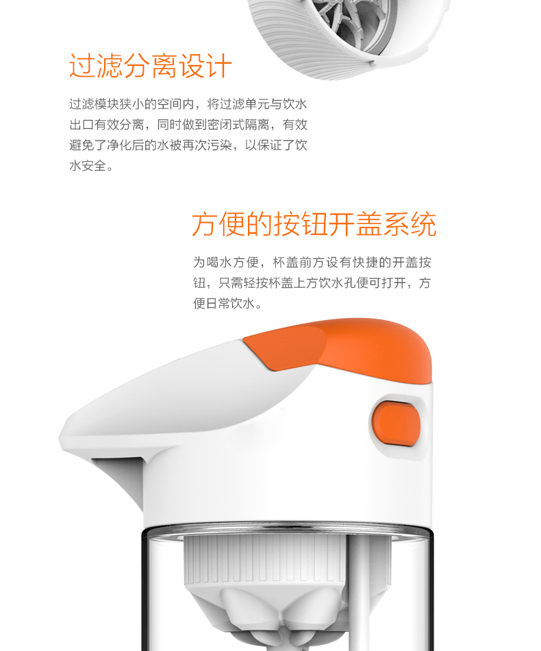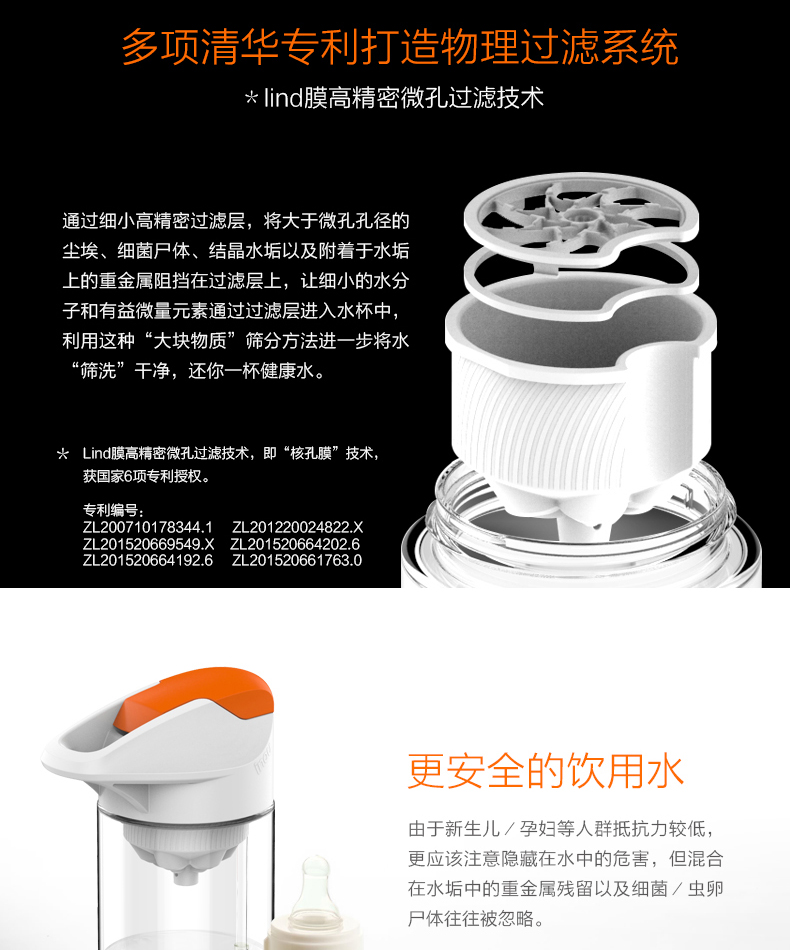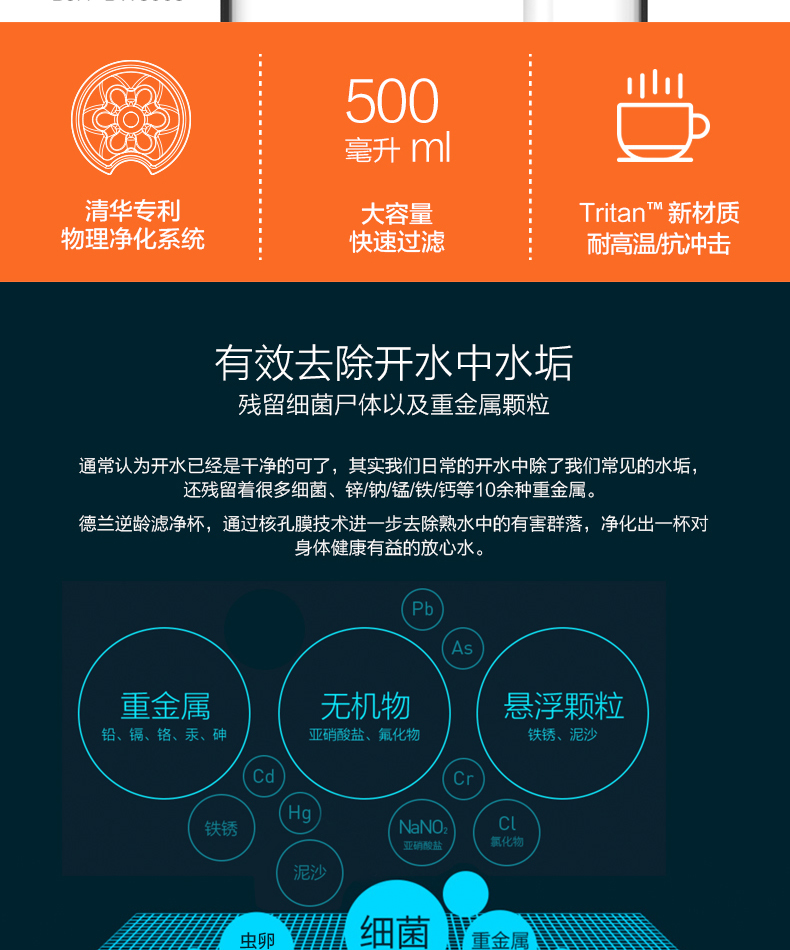 材质:Tritan 容量:500ML 过滤方式:核孔模过滤 与清华大学联合开发,核孔膜技术,实现物理净化系统,行业创,可直接净化开水过滤系统; 有效祛除开水中重金属残留; 过滤单元与饮水出口有效分离,避免二次污染,保证饮水安全; 便携式杯盖设计,方便提拿; 进口Tritan杯身,耐冲击,耐高温,不变形,无双酚A; 500ML大容量,满足饮用水需要。