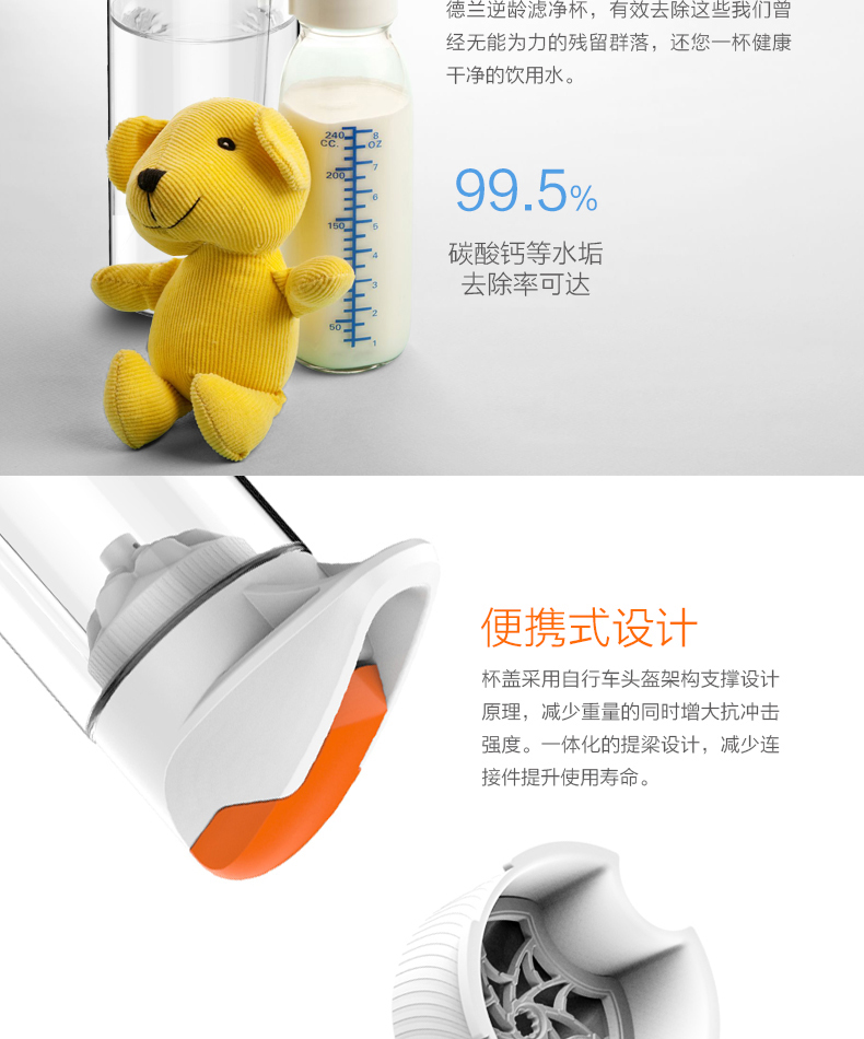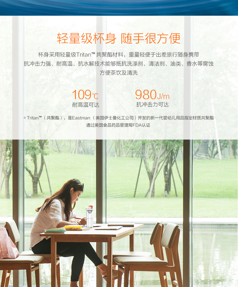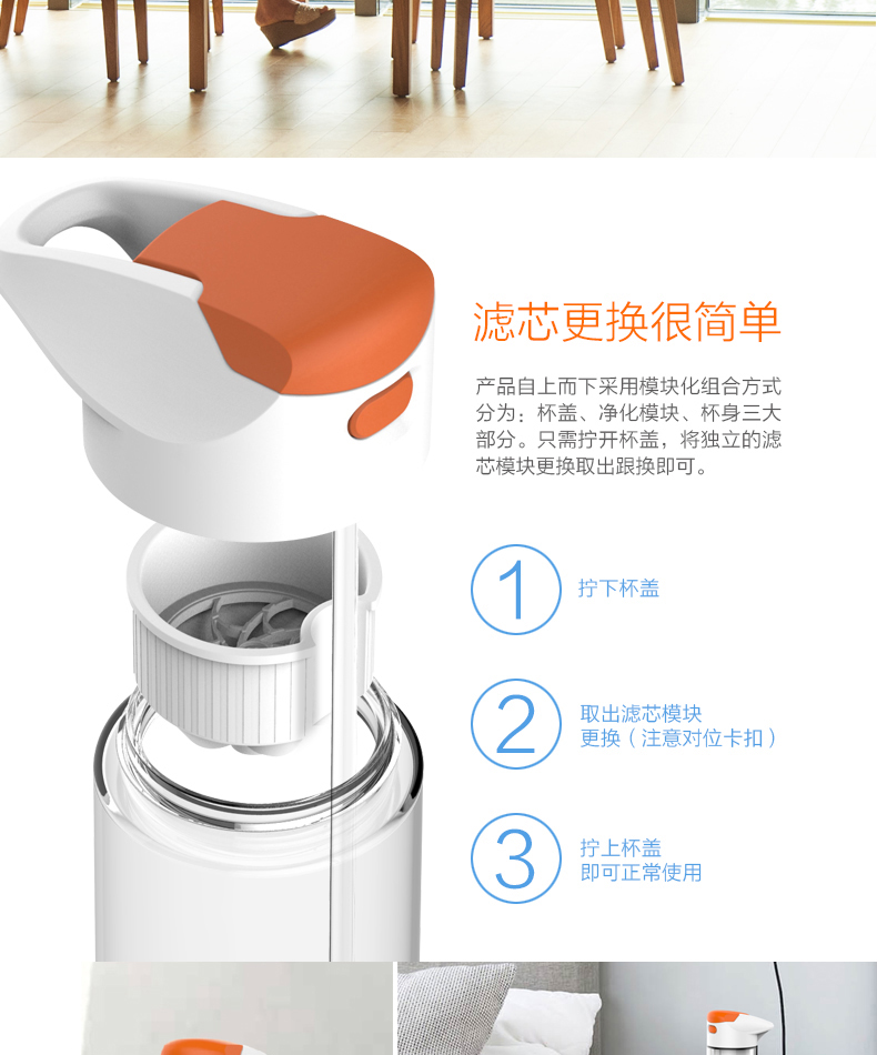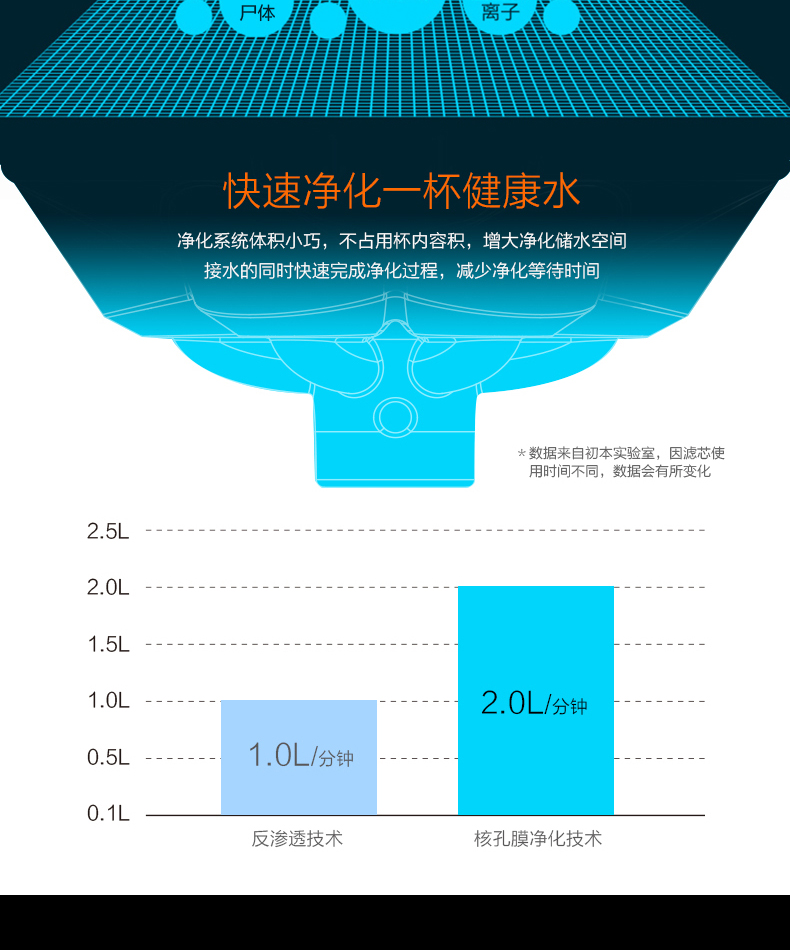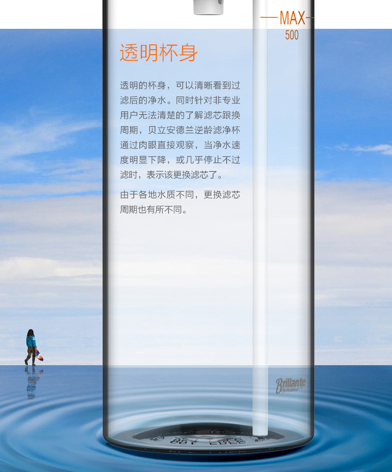 材质:Tritan 容量:500ML 过滤方式:核孔模过滤 与清华大学联合开发,核孔膜技术,实现物理净化系统,行业创,可直接净化开水过滤系统; 有效祛除开水中重金属残留; 过滤单元与饮水出口有效分离,避免二次污染,保证饮水安全; 便携式杯盖设计,方便提拿; 进口Tritan杯身,耐冲击,耐高温,不变形,无双酚A; 500ML大容量,满足饮用水需要。