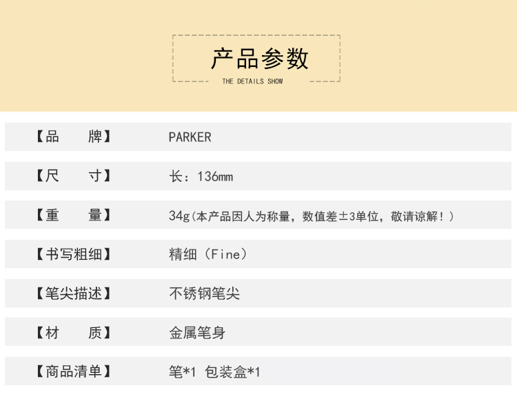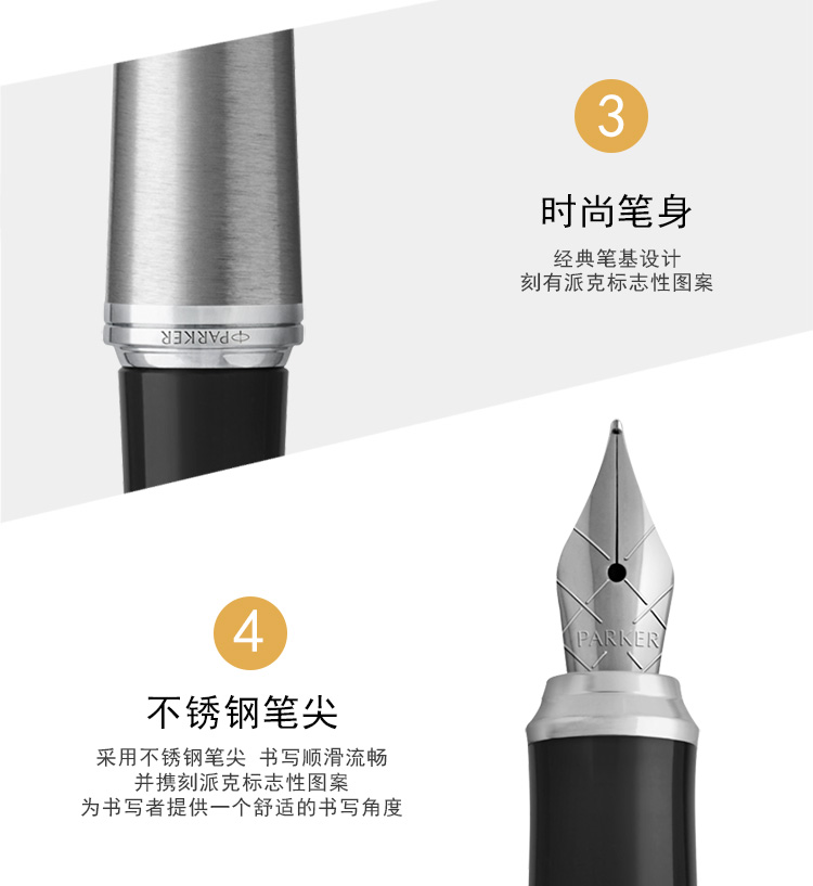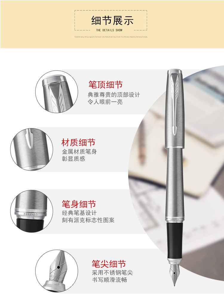 商品名称:派克(PARKER)都市金属银白夹墨水笔 商品属性:笔尖:不锈钢 笔饰:不锈钢 笔身:黄铜,丽雅漆 笔帽:黄铜,丽雅漆 零售价:¥578