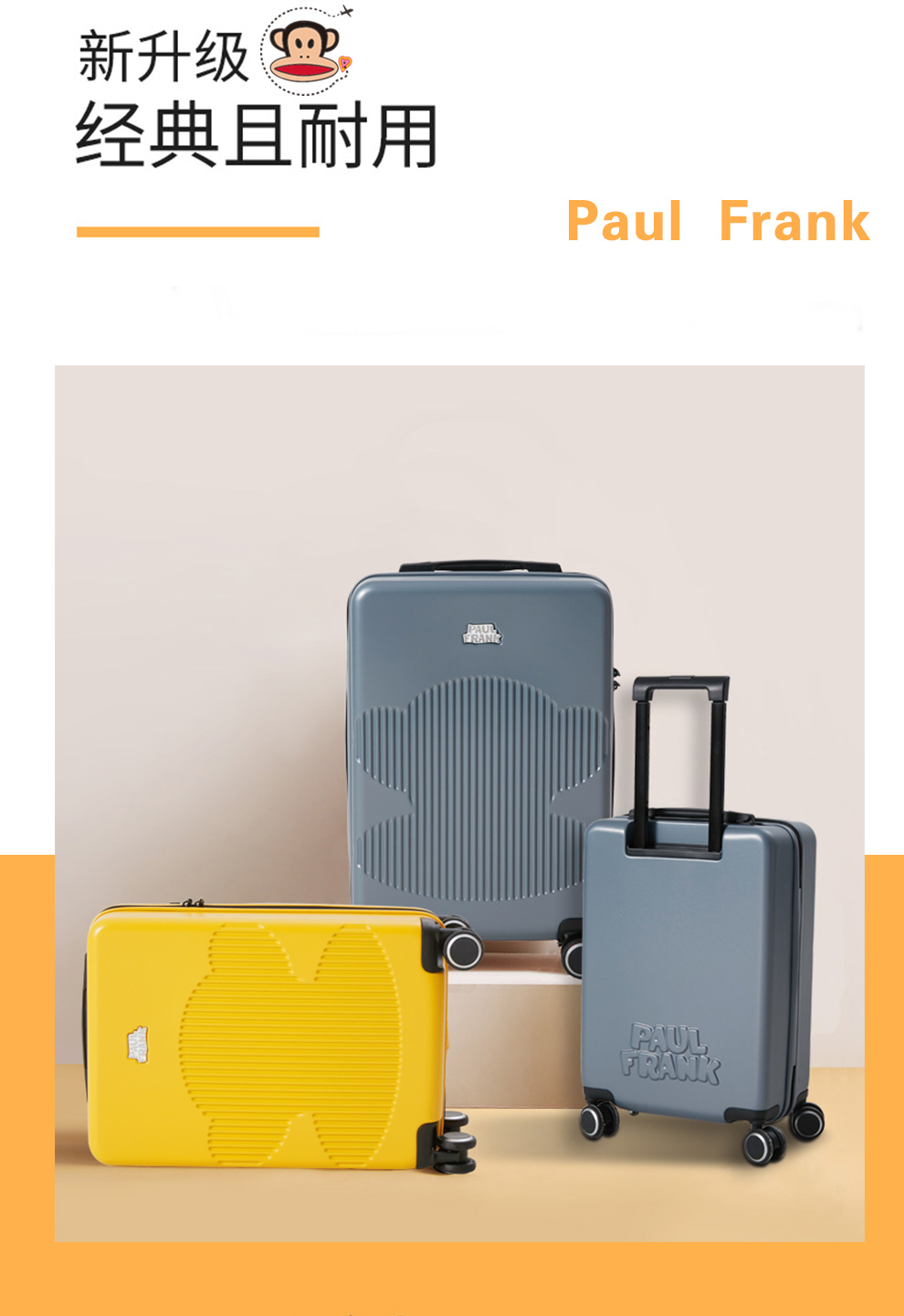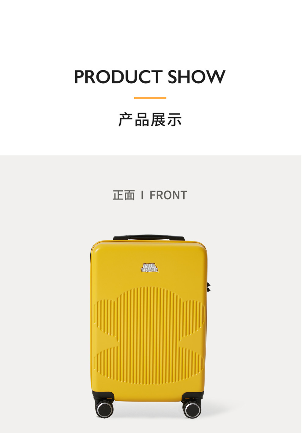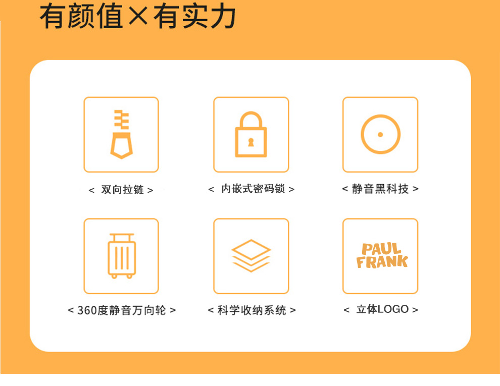 4、大牌设计,精致品牌ogo,3D立体箱面,亮丽黄色,温暖色彩,富足、快乐、幸福的颜色。优质提手,牢固可靠,不伤手;