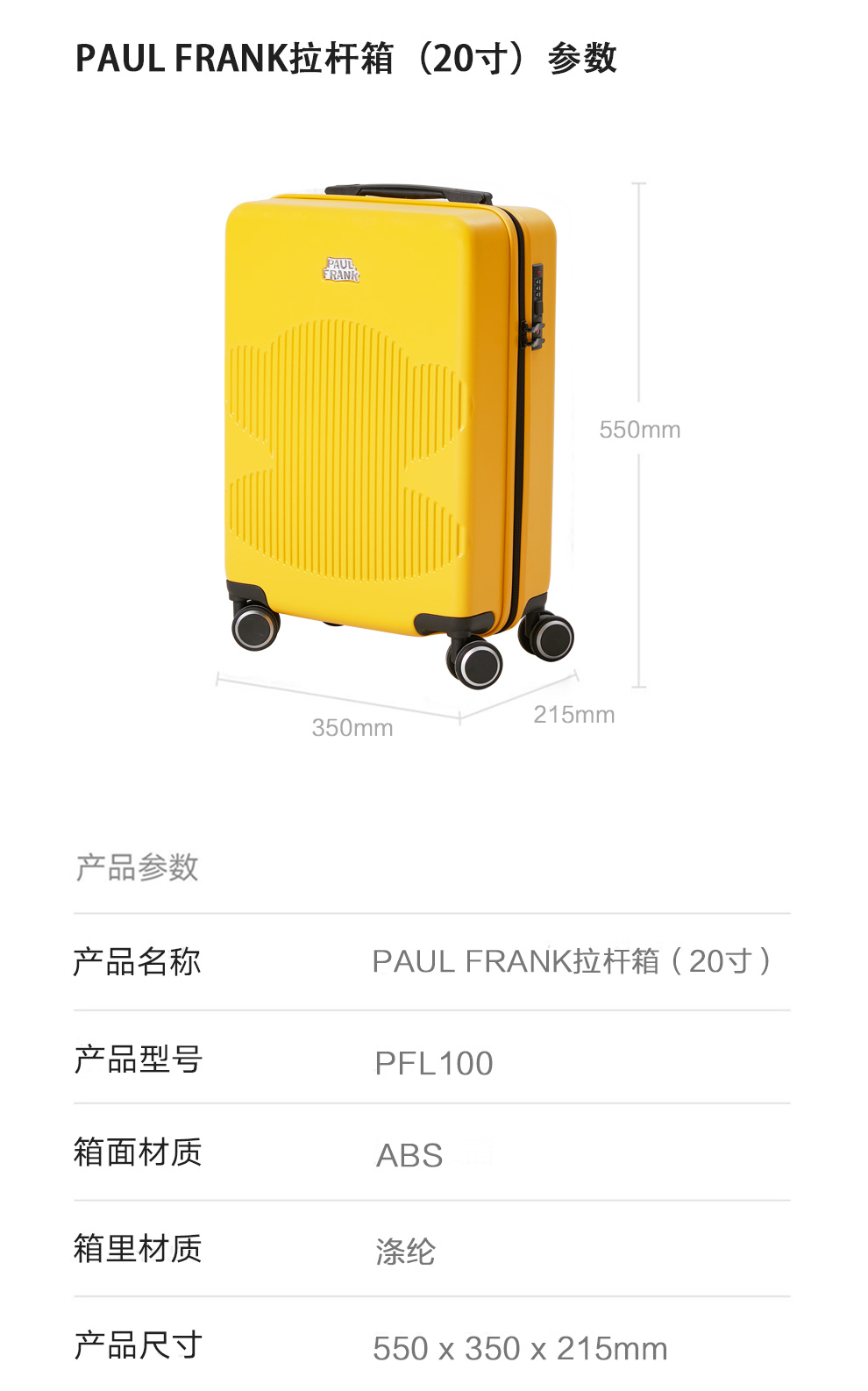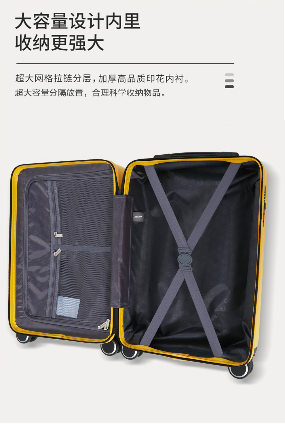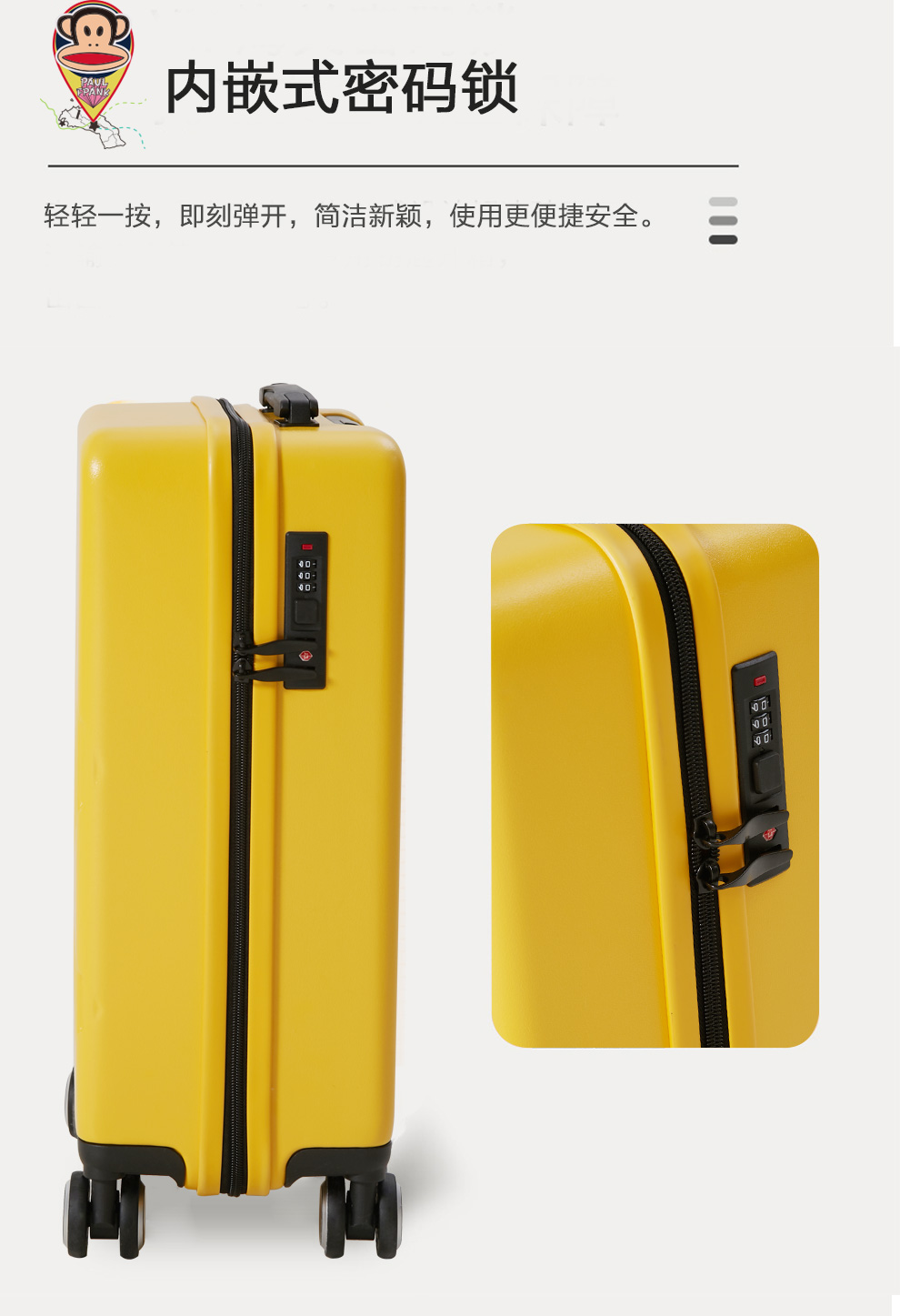 4、大牌设计,精致品牌ogo,3D立体箱面,亮丽黄色,温暖色彩,富足、快乐、幸福的颜色。优质提手,牢固可靠,不伤手;