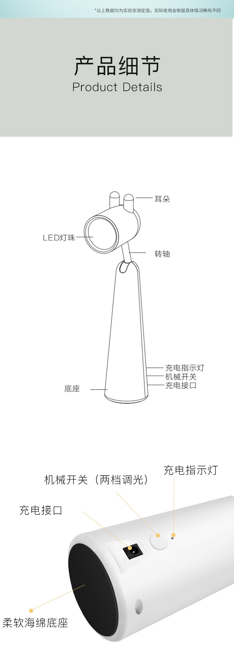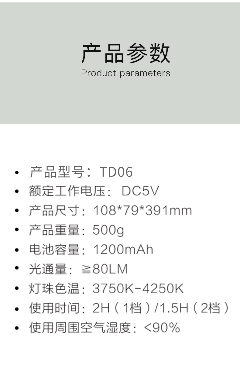 尺寸:108*79*391mm 电池:1200mAh 充电电压:DC5V1A 使用时间:2H(1档)/1.5H(2档) LED灯珠数量:12PCS 重量:500g 装箱数: 18个