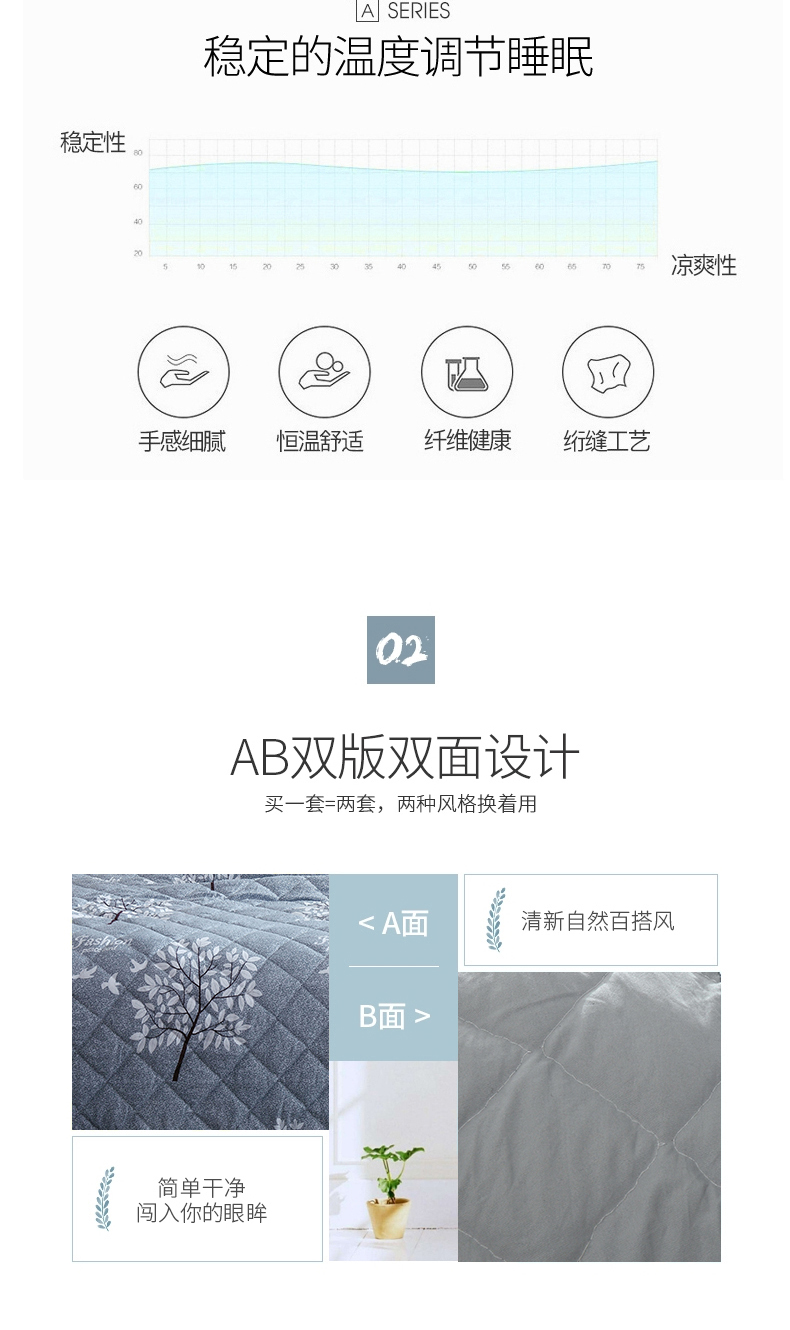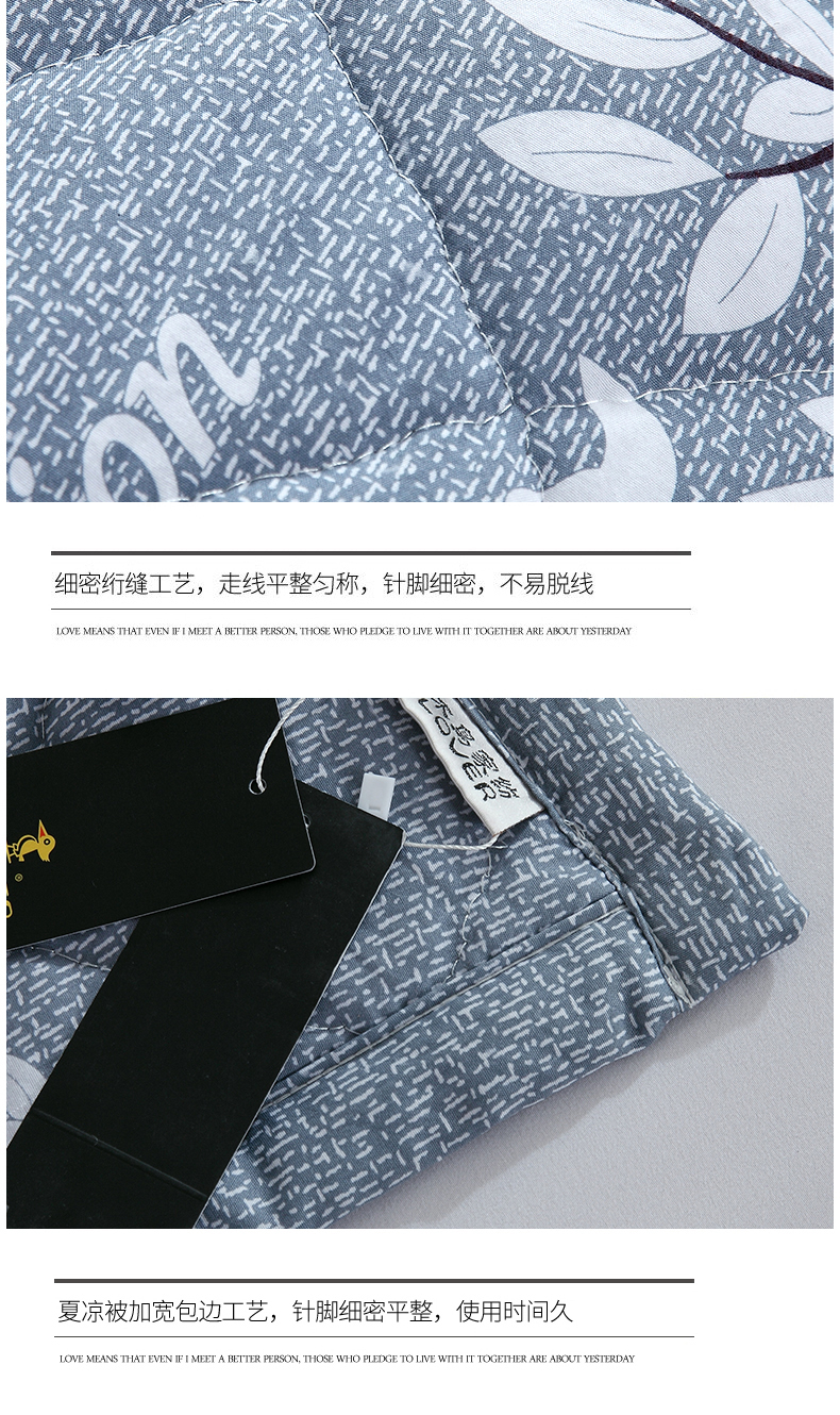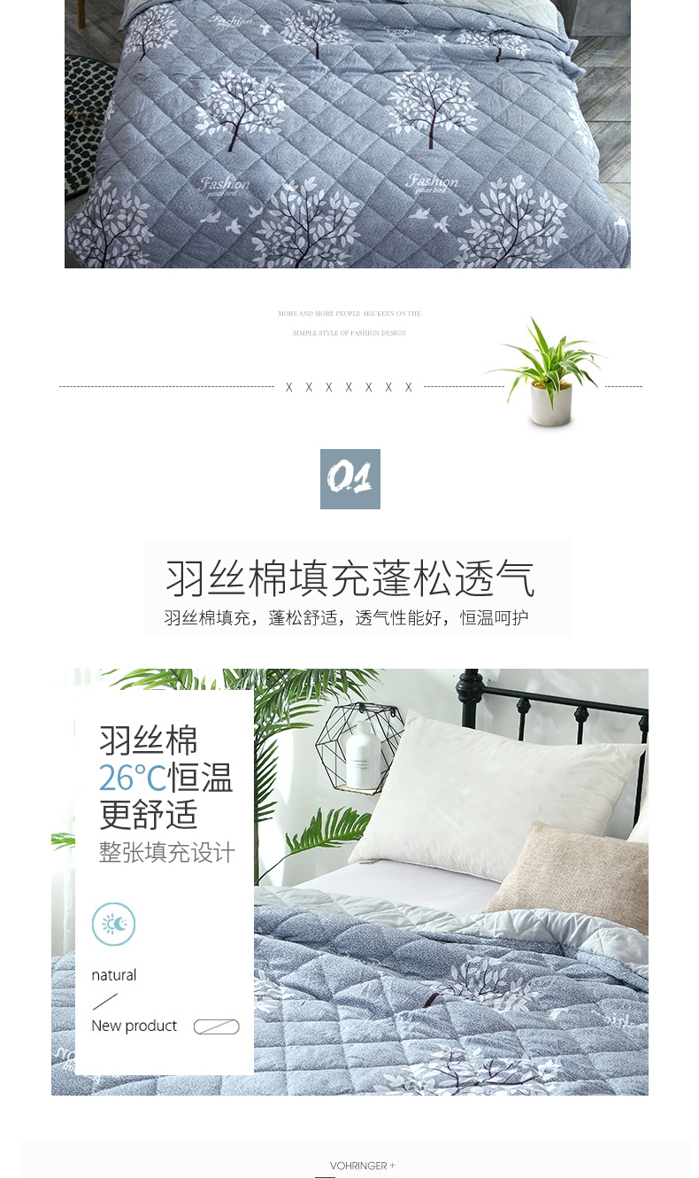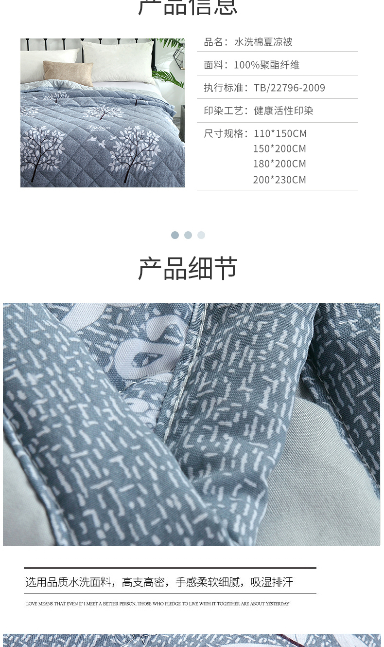 产品规格:180*200CM 面料:水洗棉(聚酯纤维) 包装:彩盒 产品描述:采用水洗棉面料,绿色健康,亲肤凉爽,羽丝棉填充,蓬松舒适,透气性佳,恒温呵护,多针绗缝工艺,水洗机洗都可以。