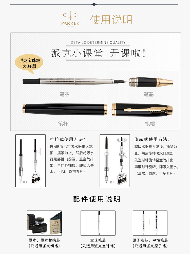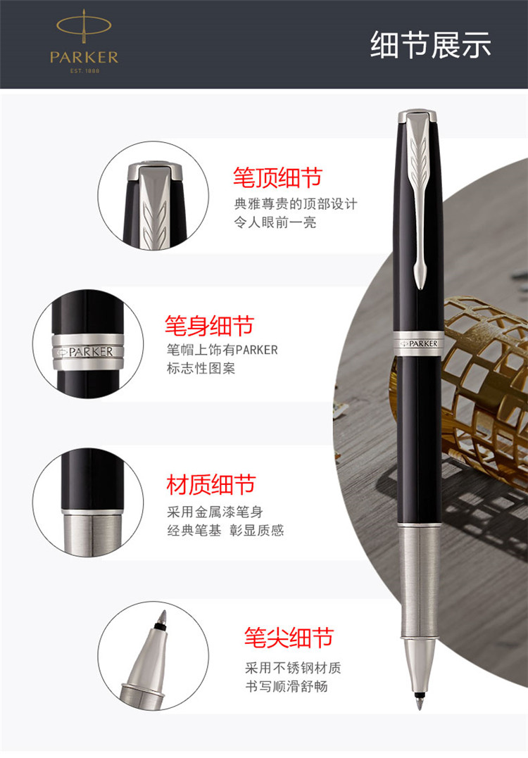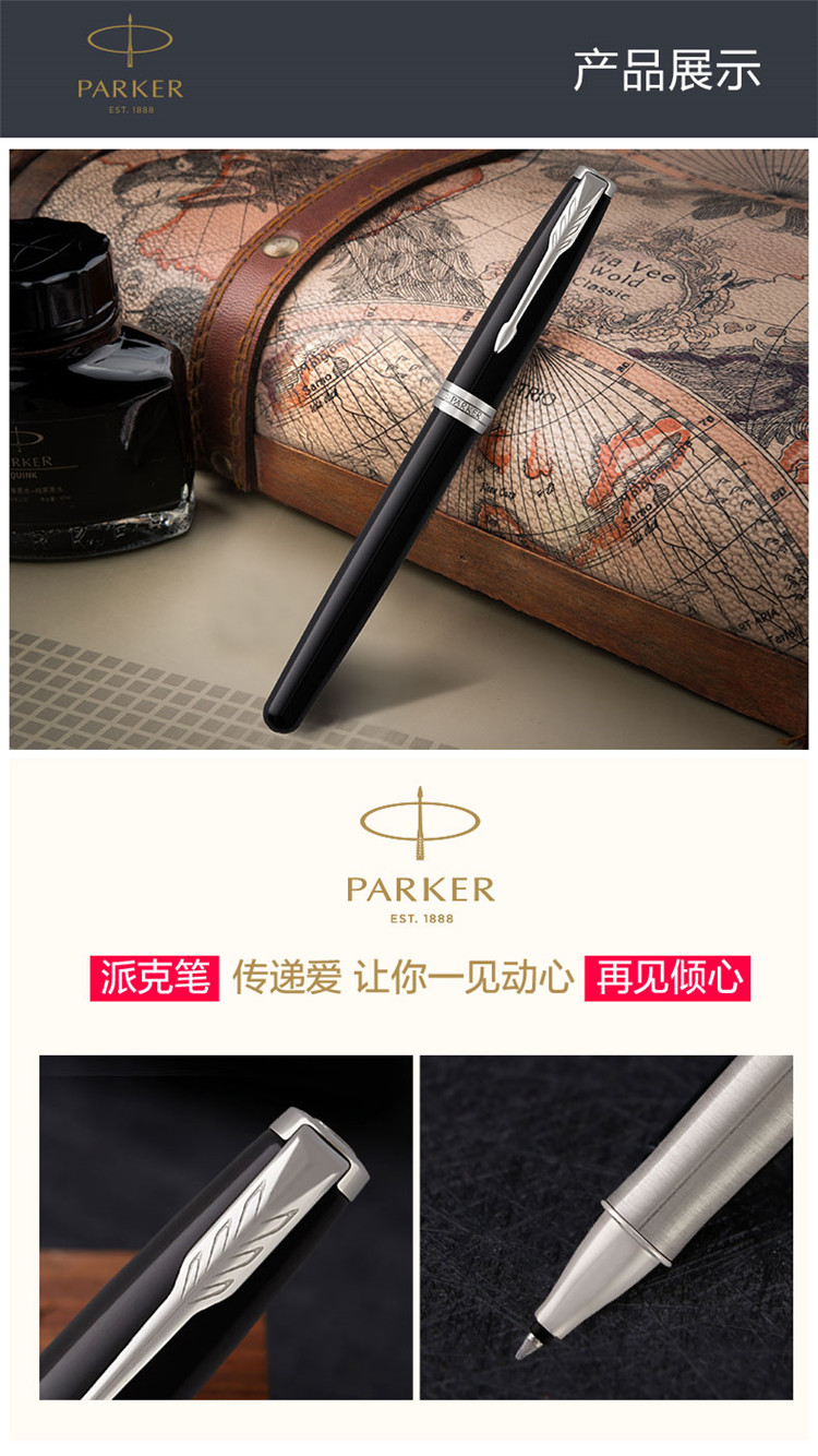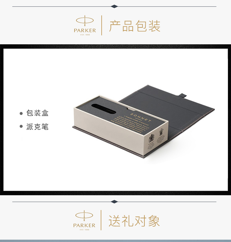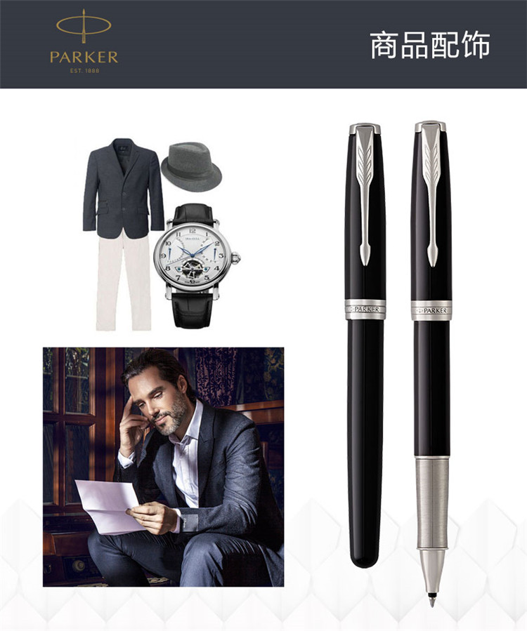 商品名称:派克(PARKER)2015卓尔纯黑丽雅白夹宝珠笔 材质:金属 数量:单支装 零售价:¥1698 黑色磨砂漆笔身表面呈现绸缎面效果。 配合镀钯金笔饰和不锈钢笔尖。 匹配派克豪华礼盒。