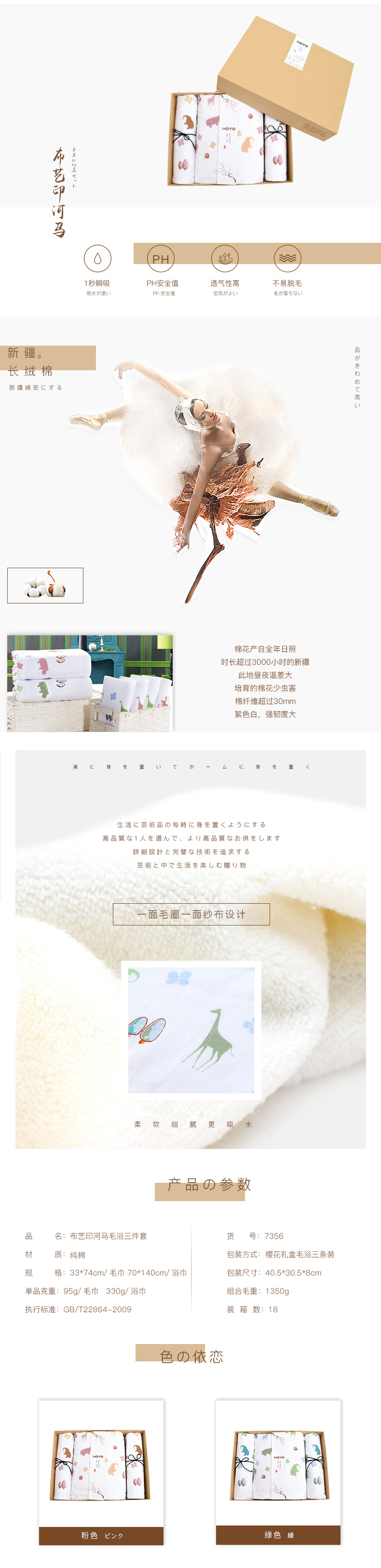 品名:7356-布艺印河马毛浴三件套 包装方式:樱花礼盒毛巾*2+浴巾*1 规 格:33*74cm、70*140cm 单品克重:95g、330g 颜 色:3530绿色、3531粉色 包装尺寸:40.5*30.5*8cm 装 箱 数 :18PCS 组合毛重:1290g