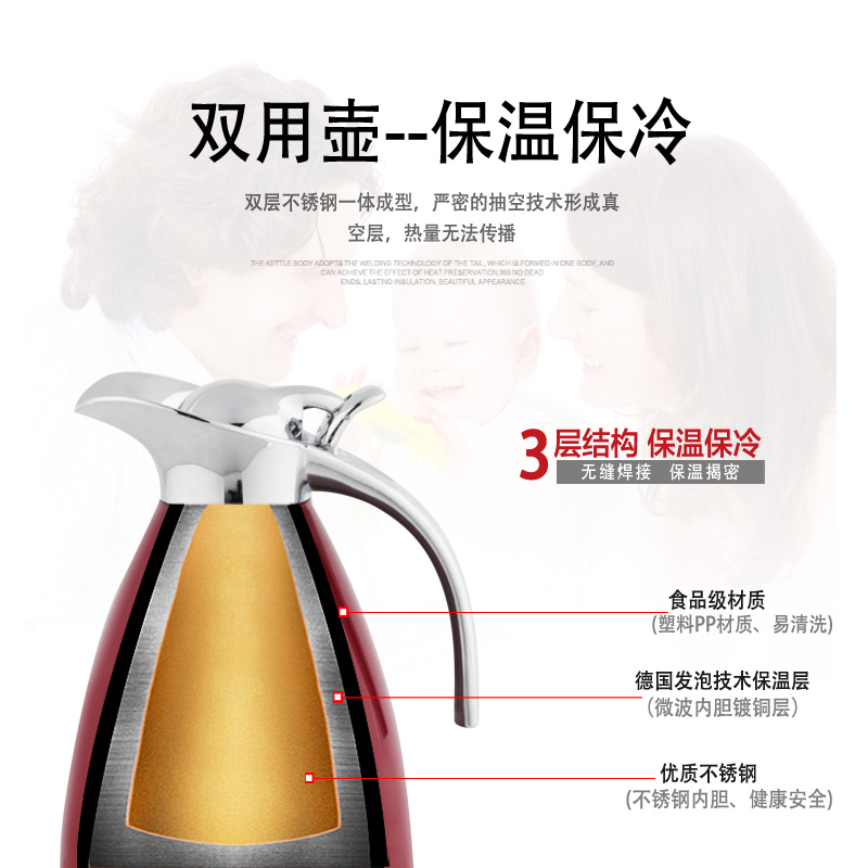 型号:LYFS-8606 容量:2L 材质:奥氏体不锈钢 装箱数:18套/箱 主要特点: . 外层为塑料(新料),内层不锈钢(201#或304#不锈钢); 使用德国发泡技术, 保温时间更持久; . 塑料电镀手柄,或纯色塑料手柄, 均可搭配。 备注:(304内胆加6元)