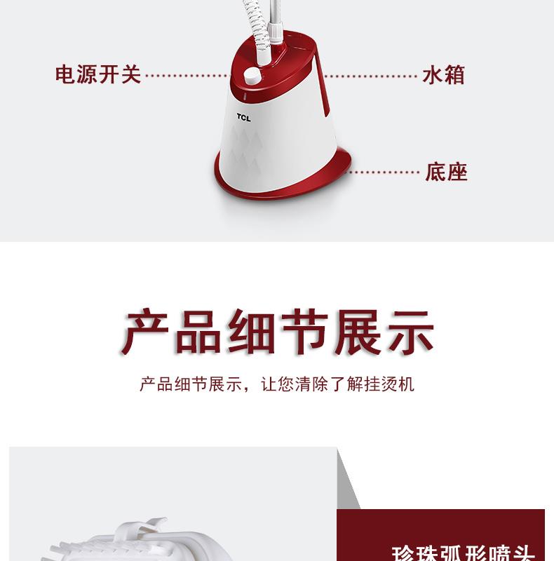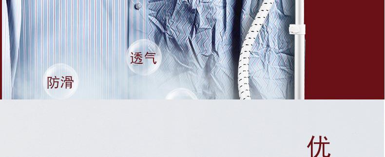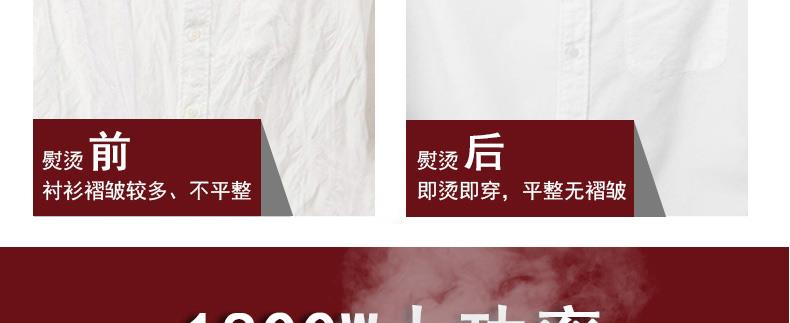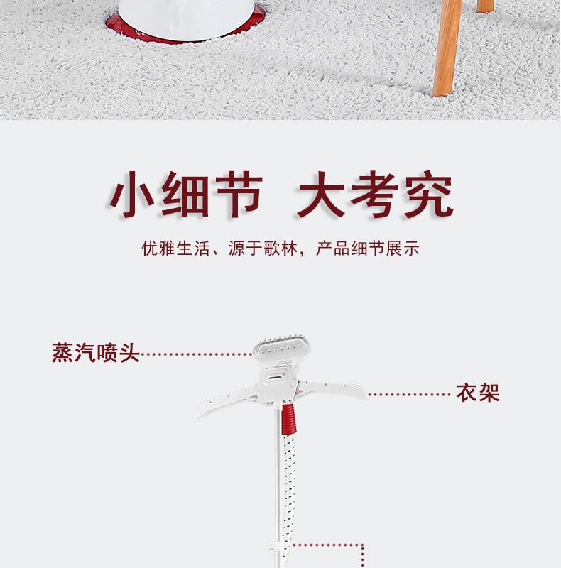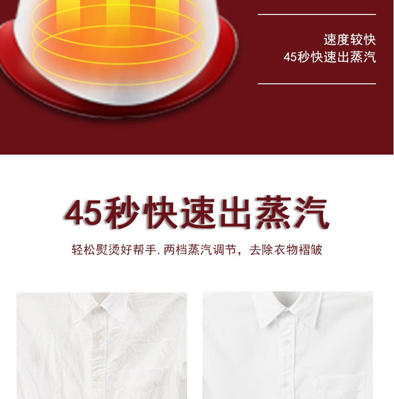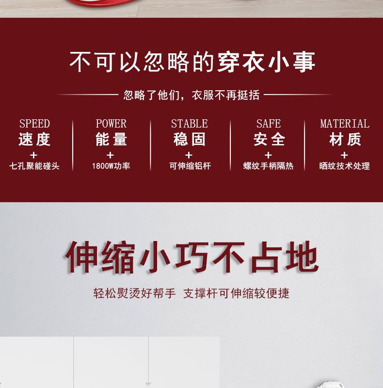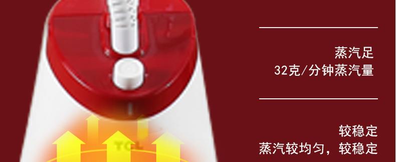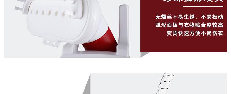 1、温馨开机蓝光指示灯,使用更方便更安全 2、pp水箱一次吹塑成型,耐摔打不易变形 3、45秒快速出蒸汽,2档蒸汽调节 4、4节可伸缩铝杆表面晒纹技术处理防滑耐磨抗腐蚀,卡扣式调节高度更便捷 5、珍珠弧形喷头一次冲压而成,无螺丝不生锈,不会松动,弧形面板与衣物贴合度高,熨烫快速方便不伤衣 6、螺纹手柄防滑隔热,长久熨烫不烫手