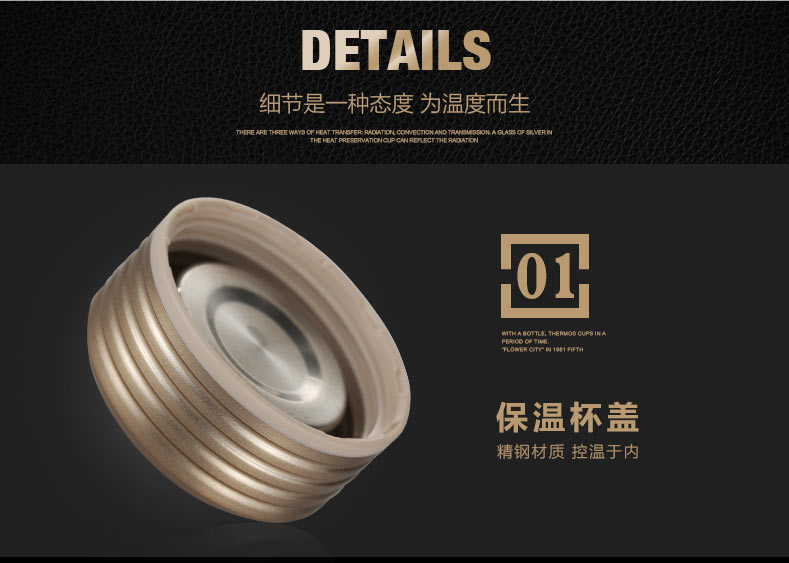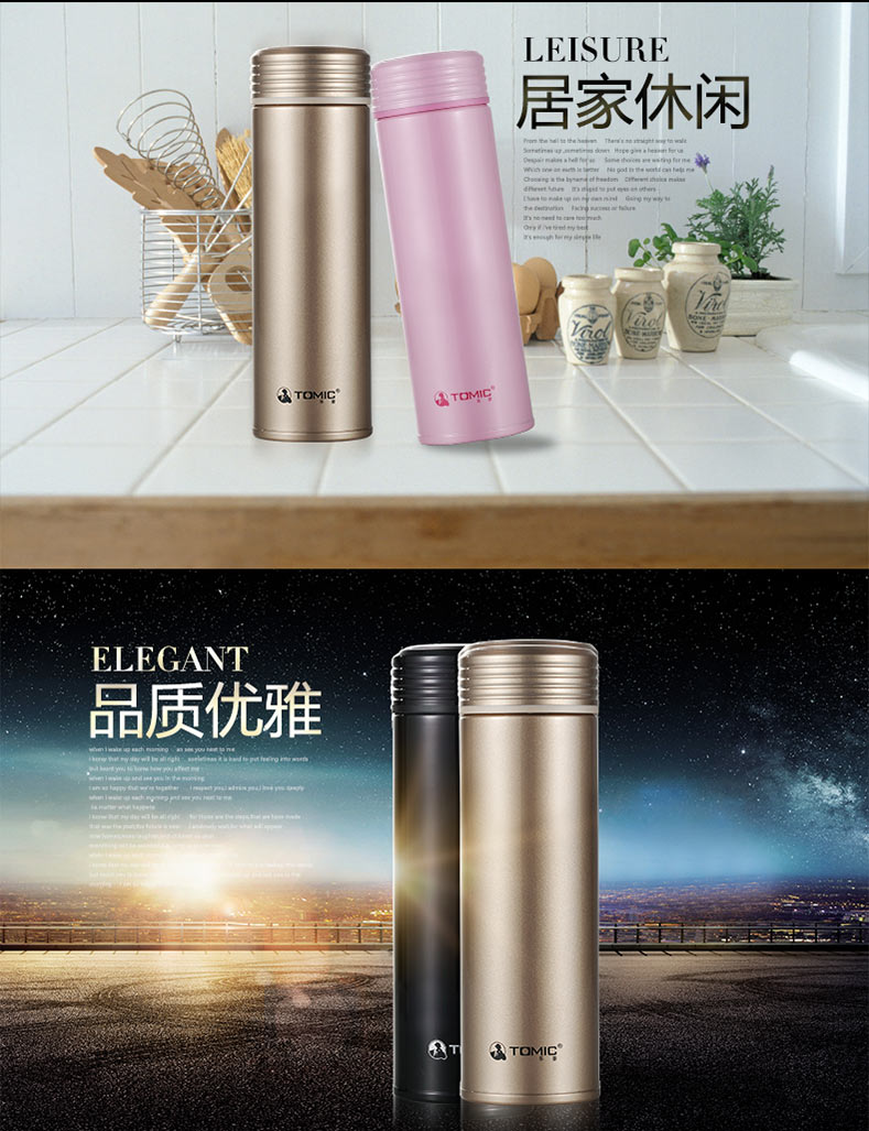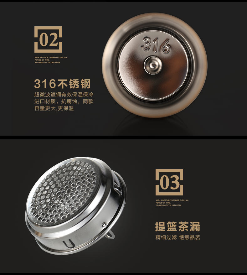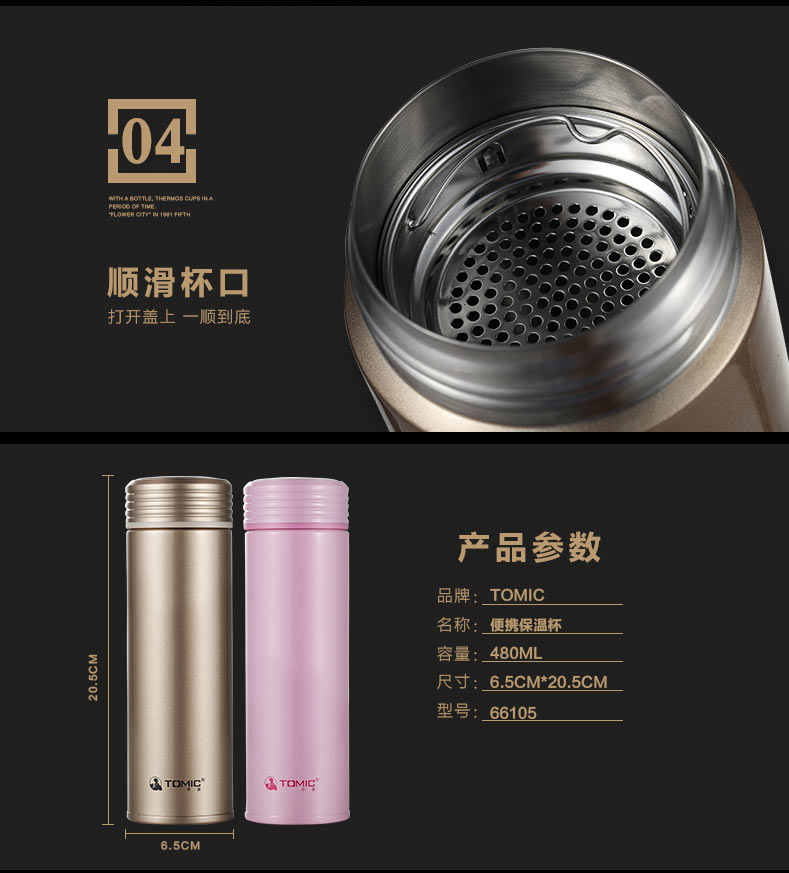 型号: 1BBS66015 规格:480ML 产品尺寸:6.5*6.5*20.9/cm 净重:0.23/kg 装箱数:24/箱 彩盒 零售价: 358元/只 颜色:土豪金、黑色、粉色、蓝格 产品特点 ·耐腐蚀性超强:抗酸碱性(碳酸饮料、茶水,奶,咖啡)优越 ·轻便、容量大 ·工艺先进:引进先进生产线,不锈钢抽真空工艺,确保产品质量 ·外观精美:采用时尚外形与色彩设计,新颖美观、携带方便; ·功能实用:旋转闭合防溅盖子,封水性强