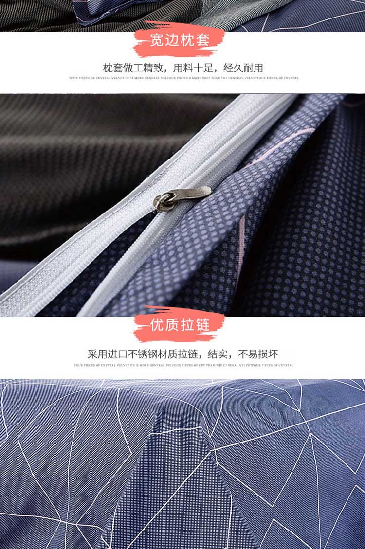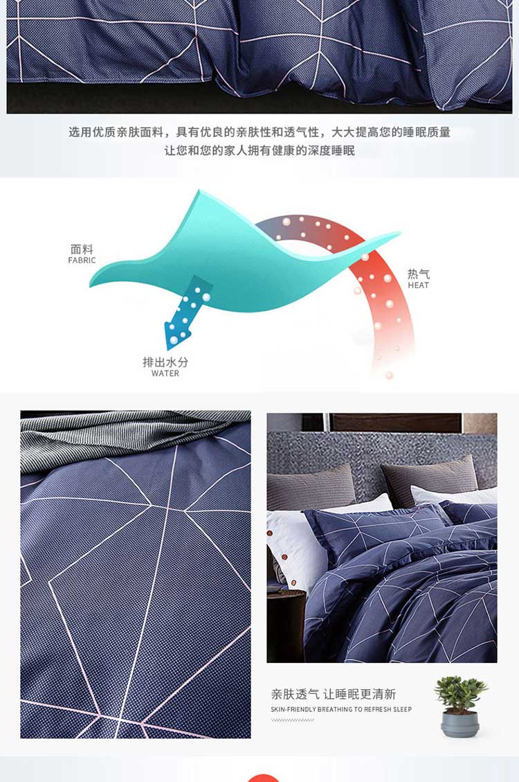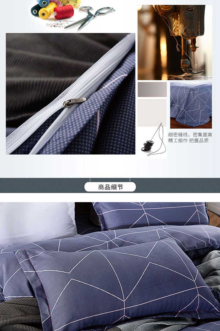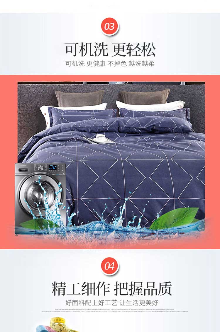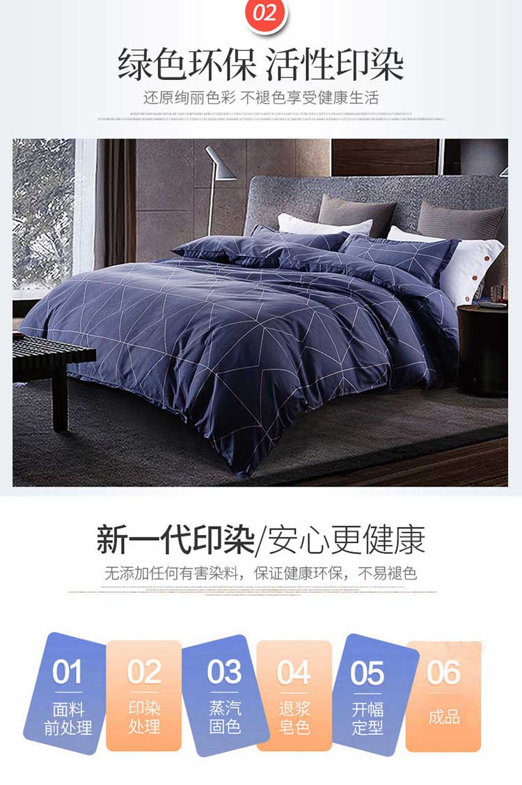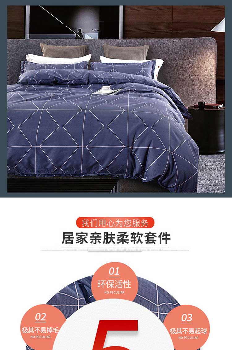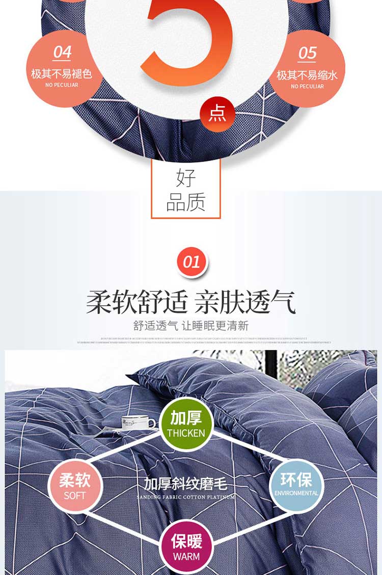 产品规格: 被套:200*230cm 床单: 230*230cm 枕套:48*74cm*2 产品材质: 聚酯纤维 工 艺: 活性印染 包装尺寸: 44*33*9cm 外箱尺寸: 46.5*39*71.5cm 毛重净重:2.9kg/2.2kg 装 箱 数: 8套 ◆ 亲肤面料,安全健康; ◆ 透气排汗,保暖性好,牢牢锁住温度; ◆ 精细做工,严格把握品质; ◆ 活性印染工艺,色牢度高,不易缩水; ◆ 十字绑带和菱形卡纸,更添尊贵与大气。