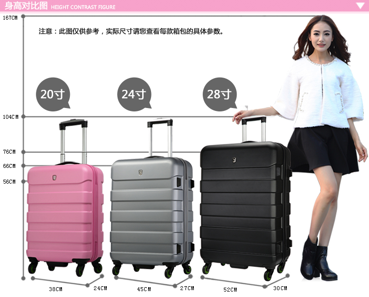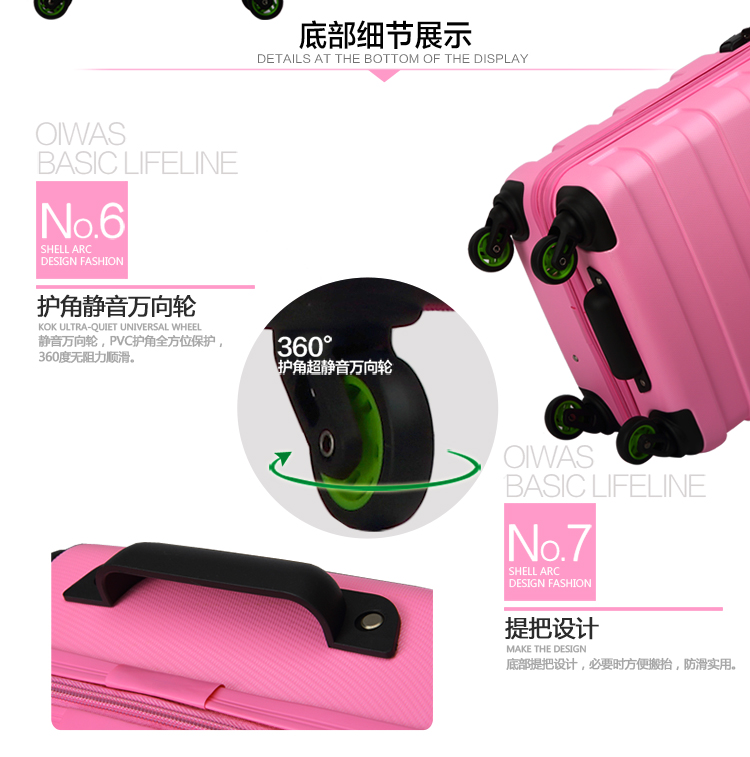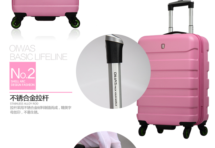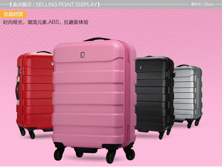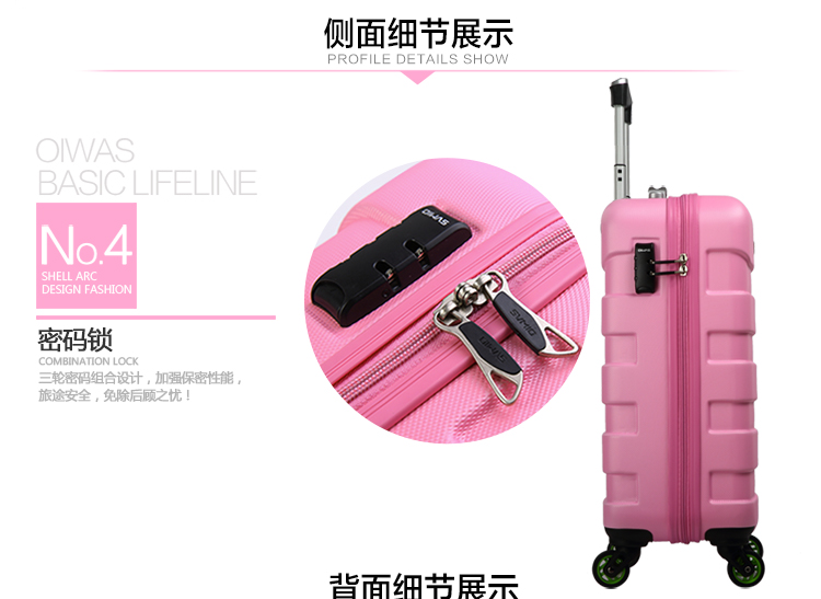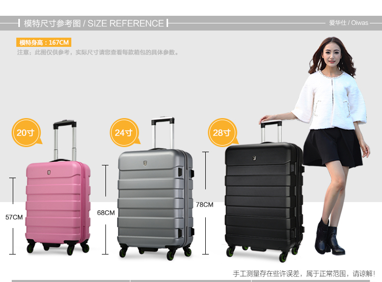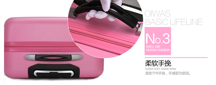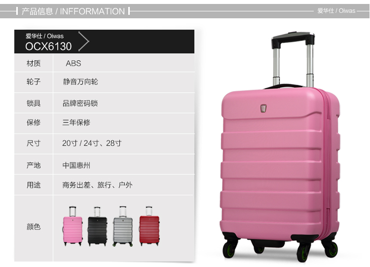 型号:OCX6130A 材质:ABS 尺寸: 380*240*560mm(20寸) 450*270*660mm(24寸) 颜色:灰色,黑色,粉色 吊牌价:779元(24寸)