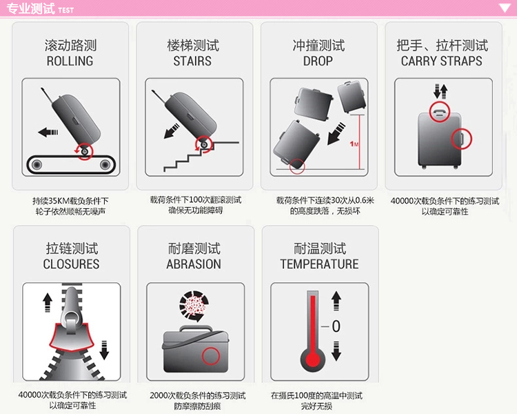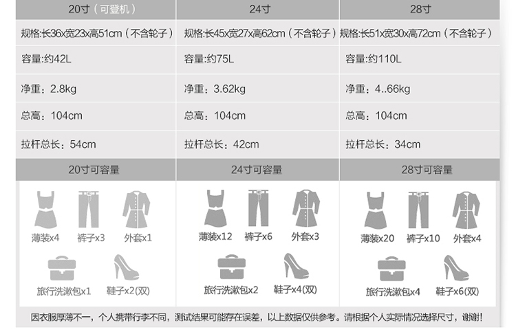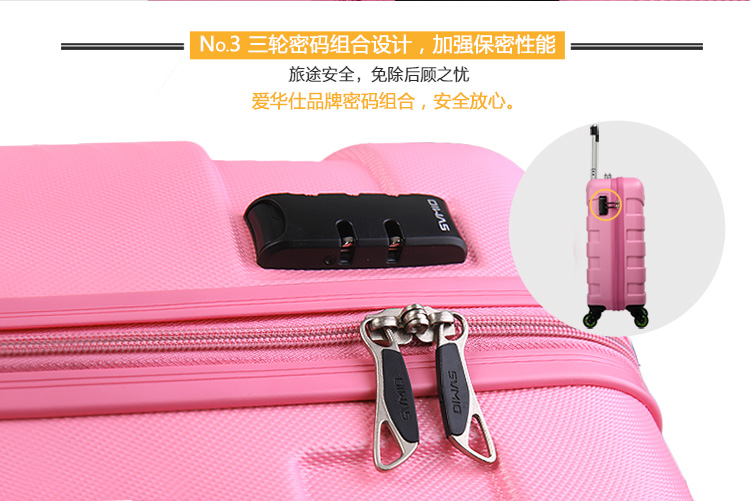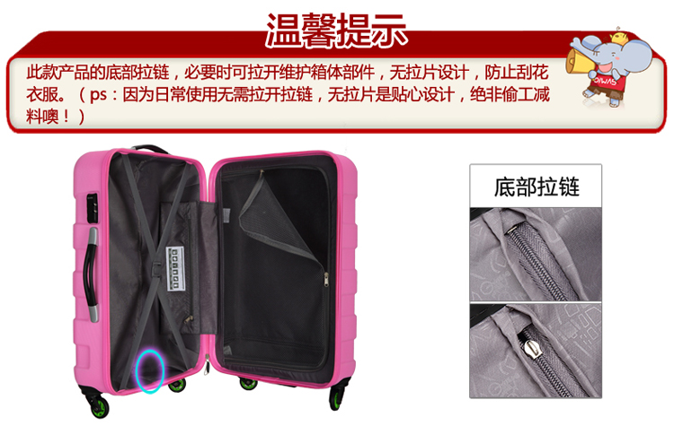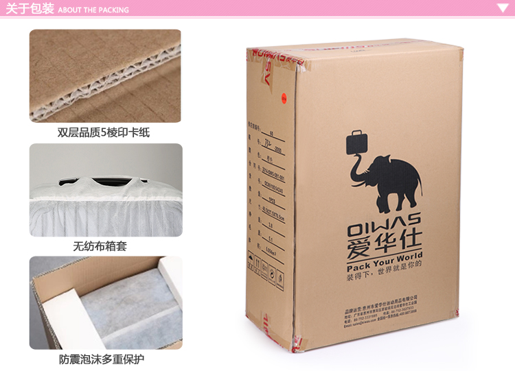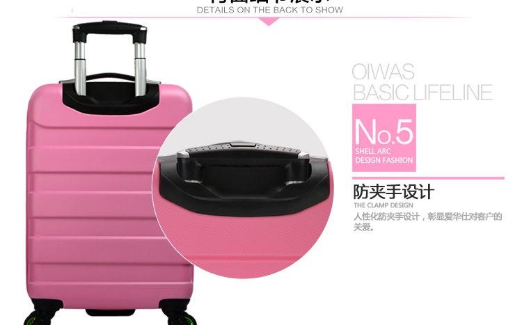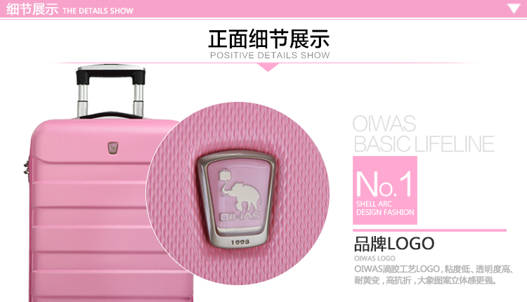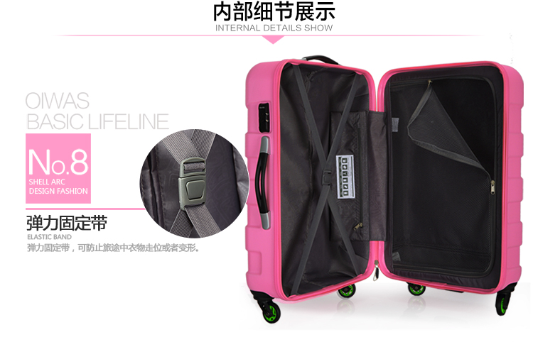 型号:OCX6130A 材质:ABS 尺寸: 380*240*560mm(20寸) 450*270*660mm(24寸) 颜色:灰色,黑色,粉色 吊牌价:779元(24寸)