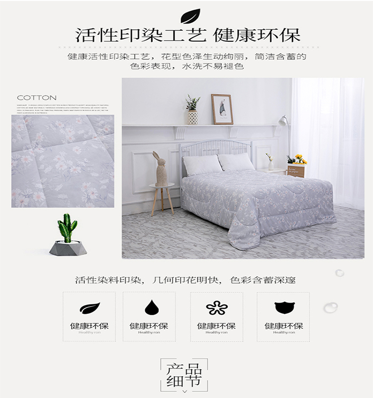 产品规格:200x230cm 面料:芦荟棉(聚酯纤维) 棉芯重量:1000g 包装:彩盒/无纺布袋 产品描述:芦荟棉纤羽被,轻薄透气,舒适而不闷热,手感柔软,采用环保印染工艺,更健康。