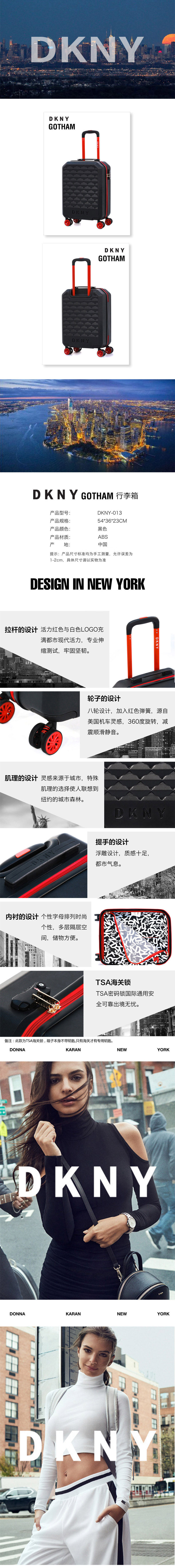 型号:DKNY-013 材质: ABS 规格:54*36*23 cm 产品特点: 1.内衬个性字母排列,灵感来源纽约,时尚外观 2.活力拉杆设计,顺滑不卡顿,舒适体验 3.海关TSA密码锁,开箱不尴尬,安全出行 4.经典缓震万向轮,360度滚轮旋转,耐冲击
