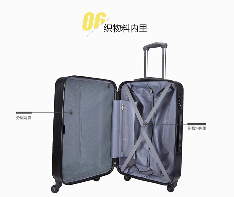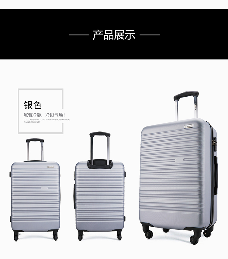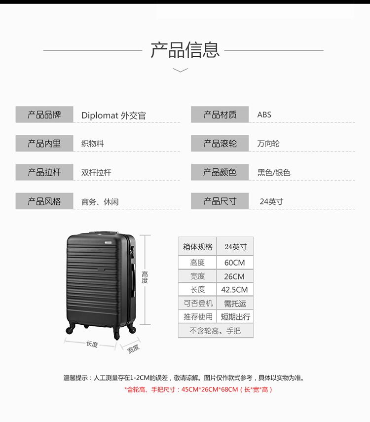 外观尺寸:45*26*68CM 箱体尺寸:42.5*26*60CM 材质:ABS 颜色:黑色∕银色