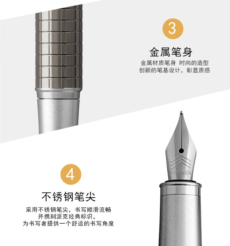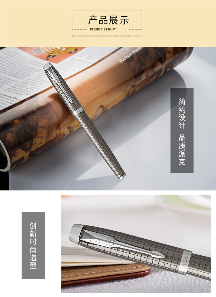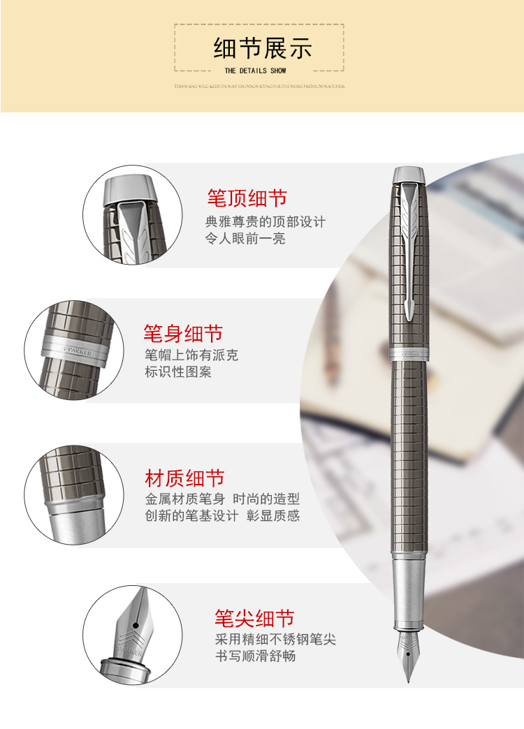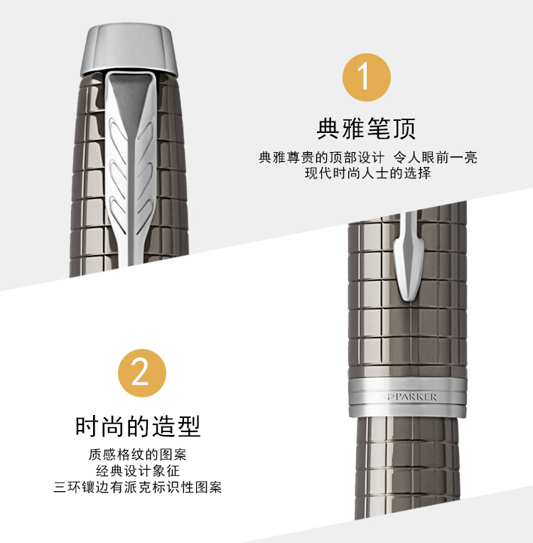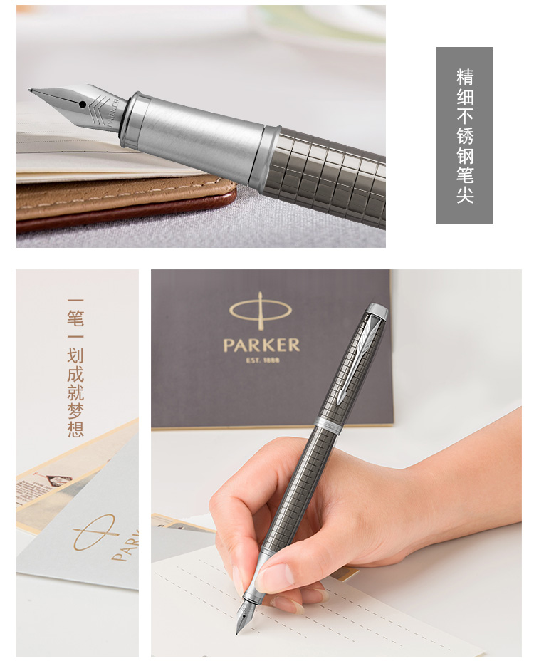 商品名称:派克(PARKER)IM金属灰格子纹墨水笔 商品属性:笔尖:不锈钢 笔身:黄铜铬+凿刻 笔饰:黄铜 笔帽:黄铜铬+凿刻 零售价:¥718