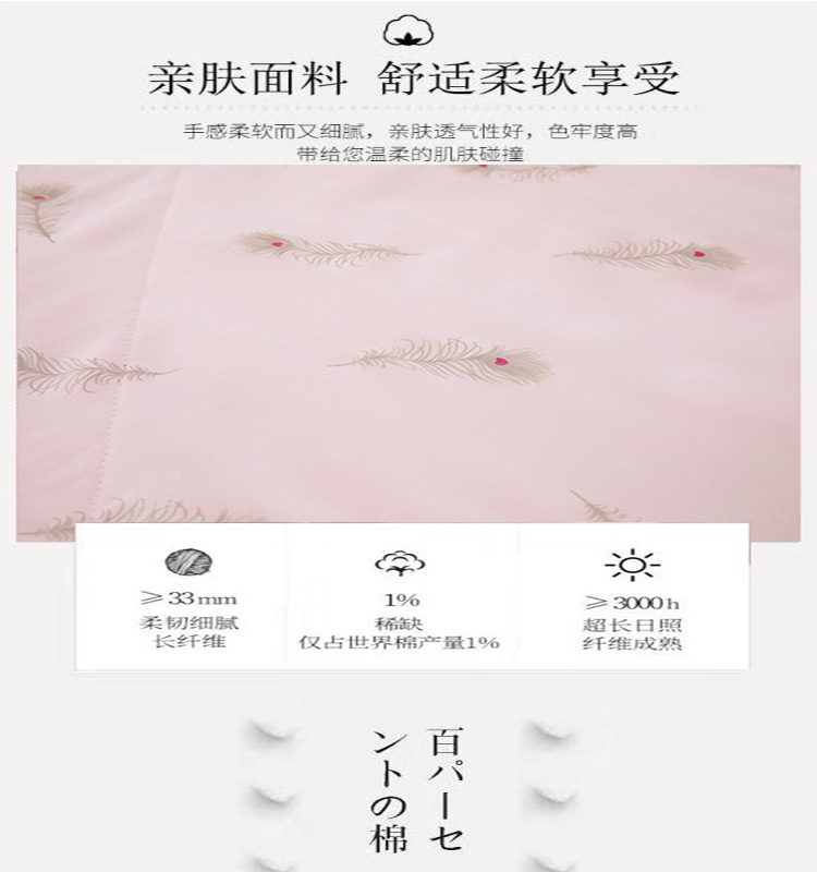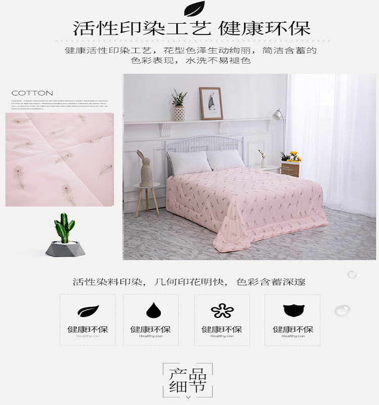 产品规格:200x230cm 面料:芦荟棉(聚酯纤维) 棉芯重量:1000g 包装:彩盒/无纺布袋 产品描述:芦荟棉纤羽被,轻薄透气,舒适而不闷热,手感柔软,采用环保印染工艺,更健康。