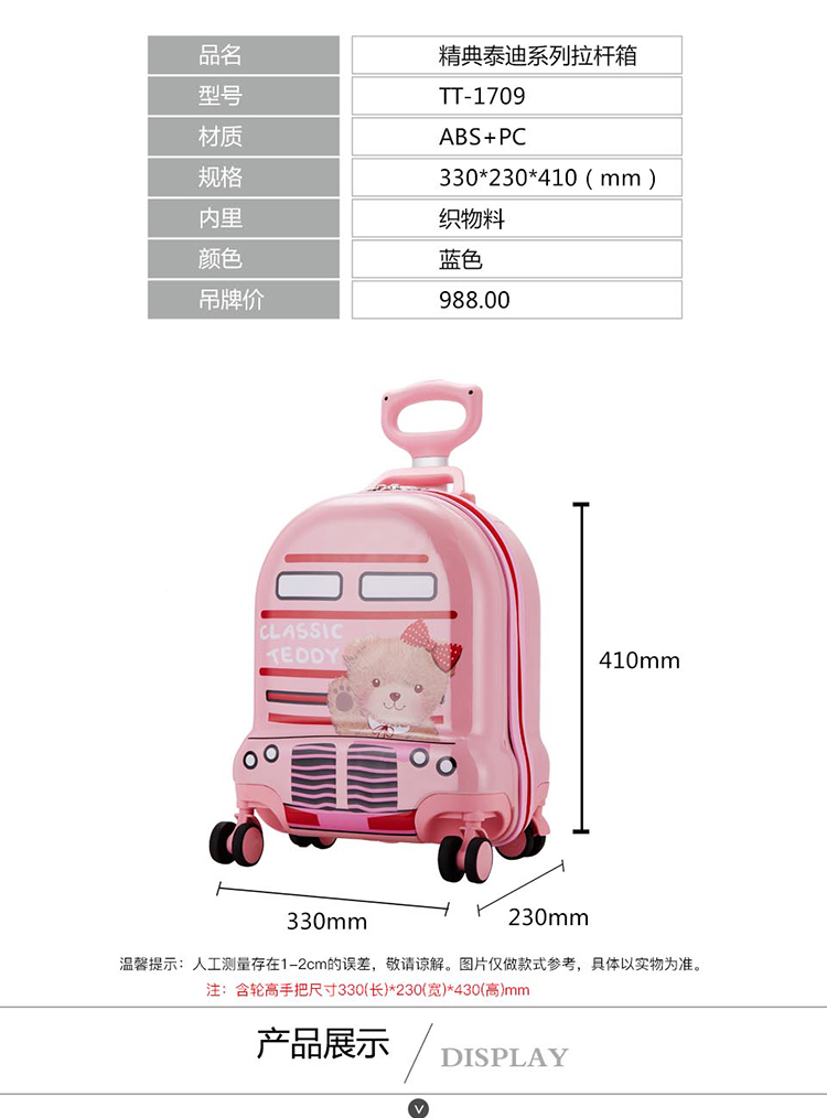 型 号:TT-1709 尺 寸:330*230*410MM 适应年龄:5岁-18岁 材 质:ABS+PC