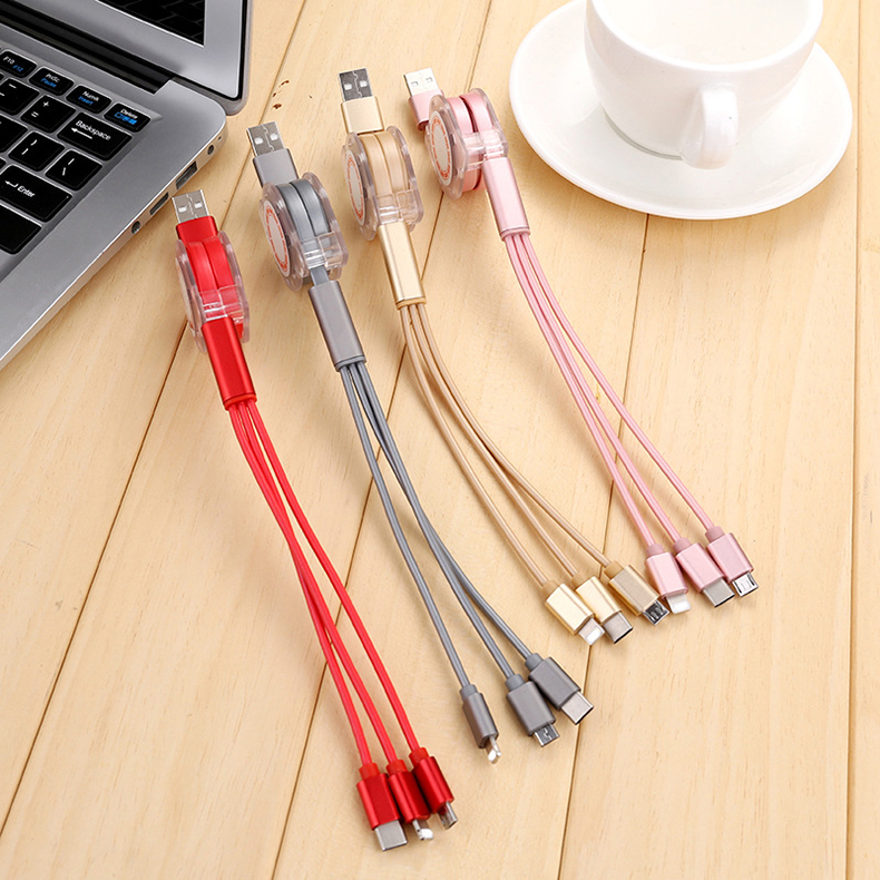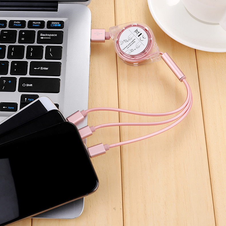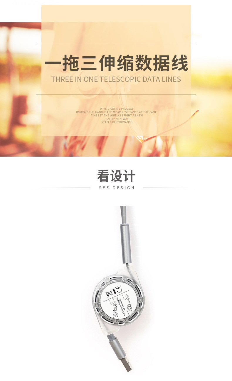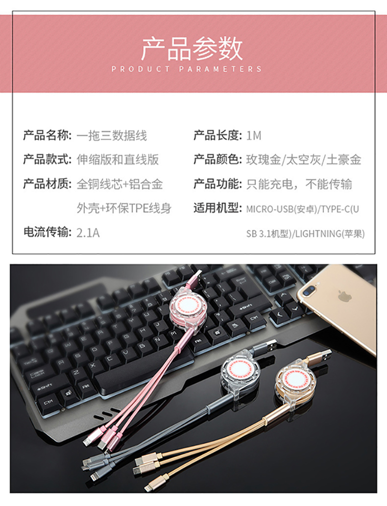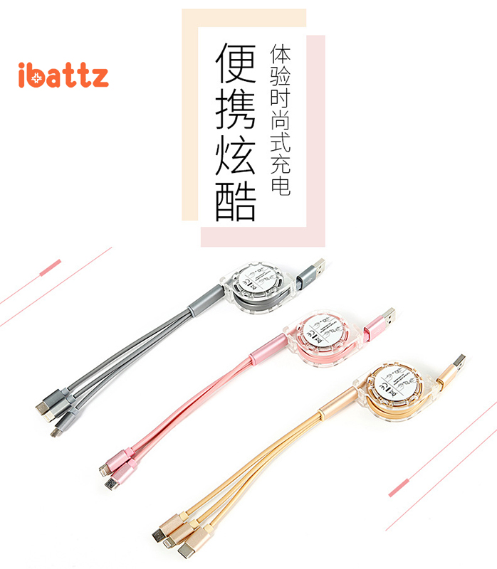 产品名称:一拖三伸缩数据线 产品型号:RX-C 产品规格:1米 产品功能:设备充电+(数据传输) 接口类型:Micro USB、Lighting,USB-C 产品材质:TPE+PE+五金 适用范围:电流电压国际通用 附属功能:伸缩收纳,一拖三充电, 可过2A电流 印制工艺:丝印、彩印、3D浮雕、热转印 可选颜色:红、蓝、灰、黑、土豪金,玫瑰金