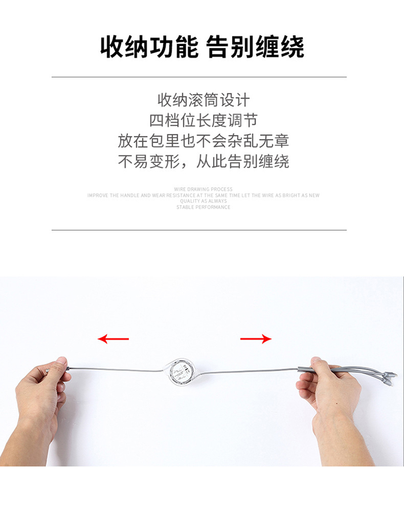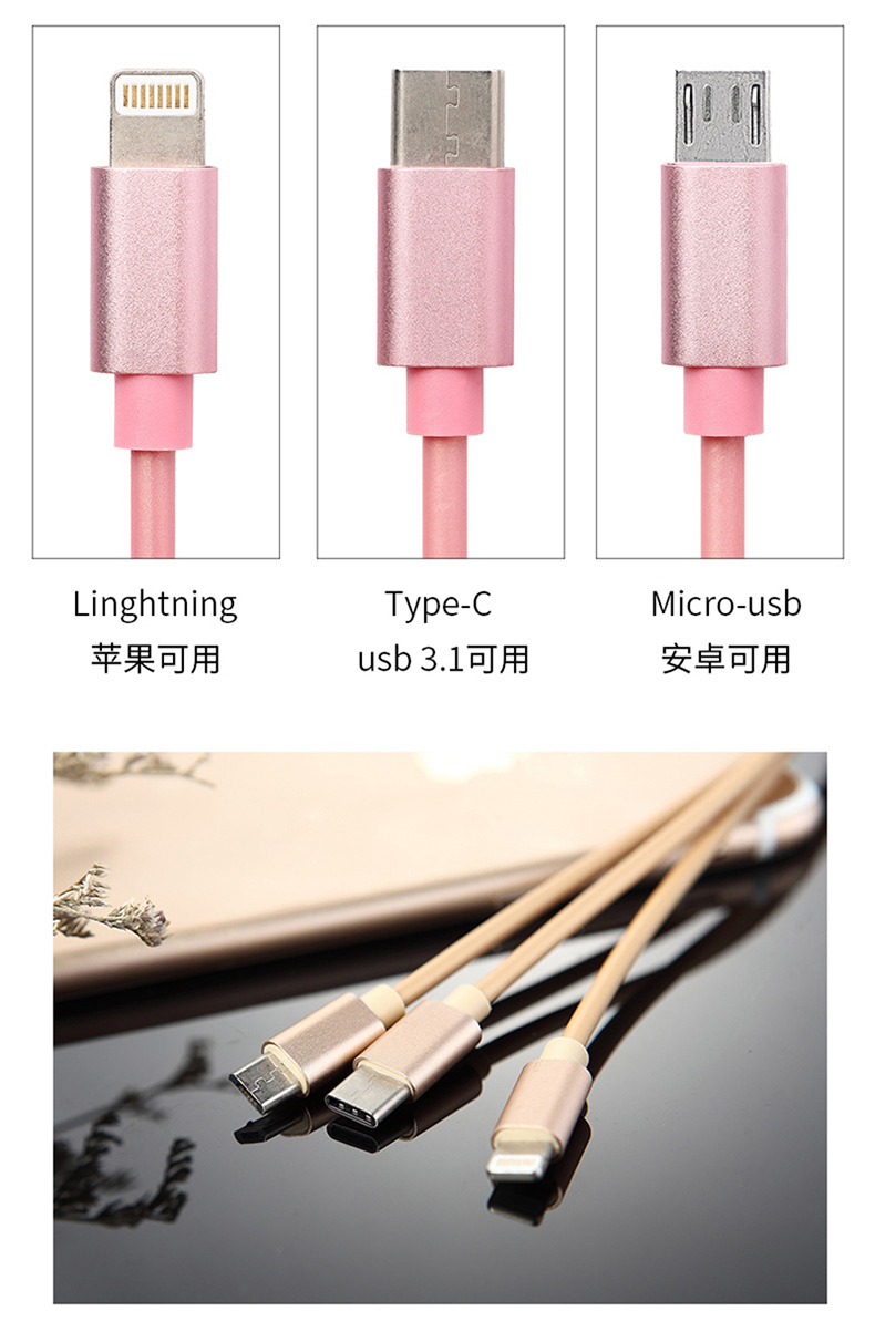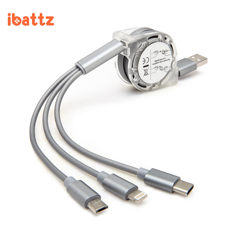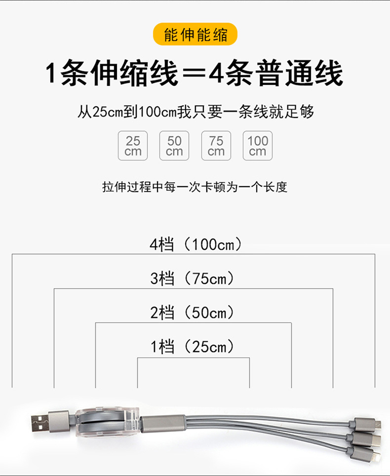 产品名称:一拖三伸缩数据线 产品型号:RX-C 产品规格:1米 产品功能:设备充电+(数据传输) 接口类型:Micro USB、Lighting,USB-C 产品材质:TPE+PE+五金 适用范围:电流电压国际通用 附属功能:伸缩收纳,一拖三充电, 可过2A电流 印制工艺:丝印、彩印、3D浮雕、热转印 可选颜色:红、蓝、灰、黑、土豪金,玫瑰金