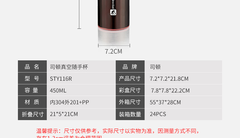 型号:STY116R 材质:内304外201+PP 容量:450ML 产品尺寸:7.2*7.2*21.8CM 彩盒尺寸:7.8*7.8*22.2CM 外箱尺寸:55*37*28CM 装箱数量:24PCS 装箱重量:10.3KG