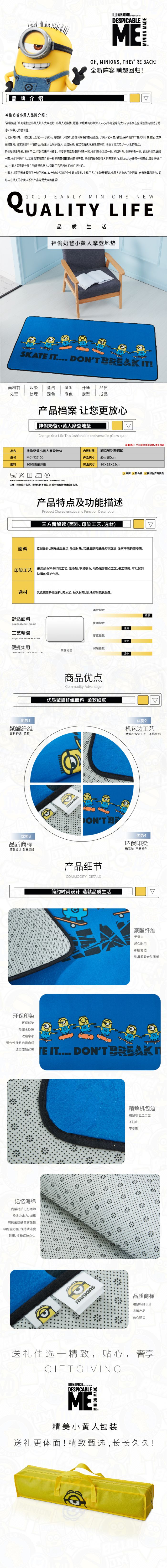 1. 面料:图案卡通设计,造就品质生活,神偷奶爸小黄人摩登地垫,创意来源于健康与活力,并时尚而富于人情味,回归生活,时尚多用,全屋通用。