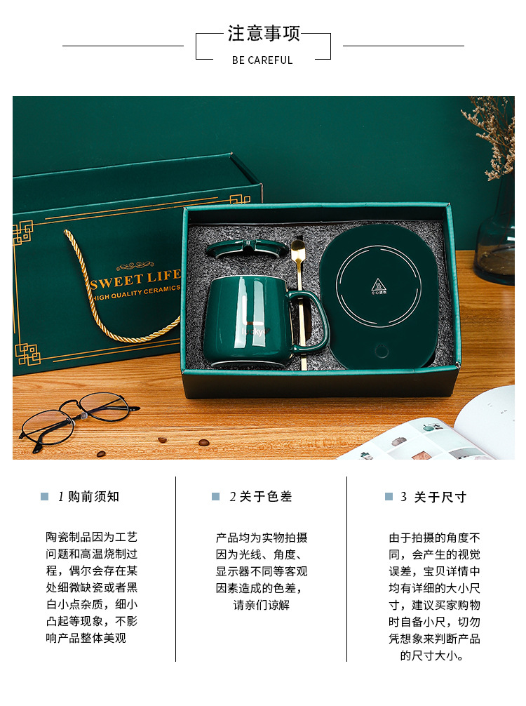 材质:陶瓷高温烧制 容量: 400ml 彩盒尺寸:29cm*11.5cm*18.3cm 卖点介绍: 1、底座升级防爆玻璃,陶瓷高温烧制 2、持续保温一整天 3、精致小巧,不占地方 4、礼盒升级,送礼有面