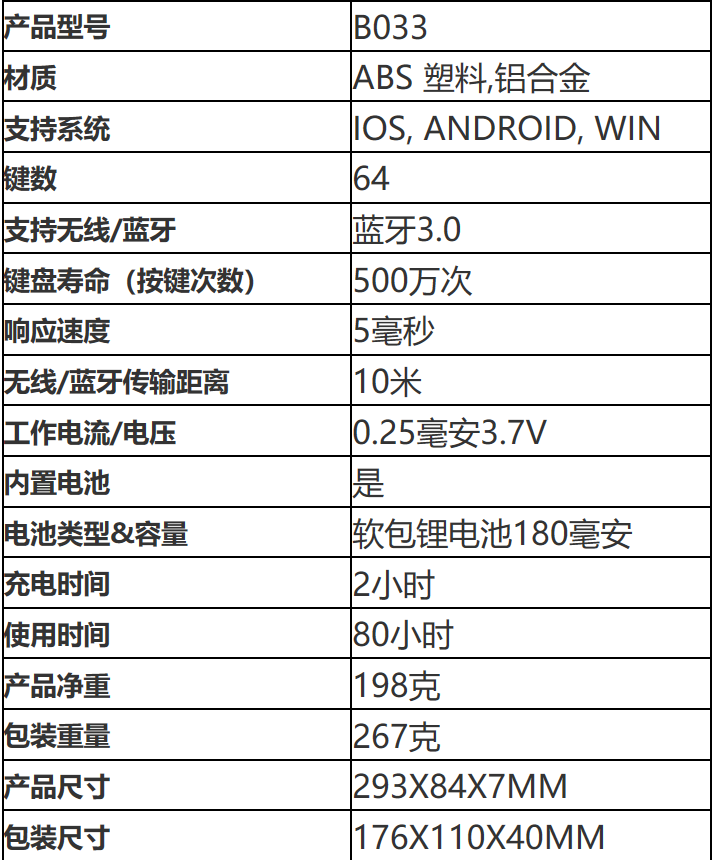 产品名称:轻便蓝牙折叠键盘 产品型号:R-B11 产品重量:132.8g 产品规格:展开286*89*5mm合起:150*58*10mm 工作时长:》65小时 产品功能:蓝牙扩展折叠键盘, 接口类型:Micro USB, 适配系统:苹果,安卓,Windows 产品材质:注塑+组装+配件,ABS+PC+金属 适用范围:电流电压国际通用 印制工艺:丝印,彩印,浮雕 可选颜色:黑,白,