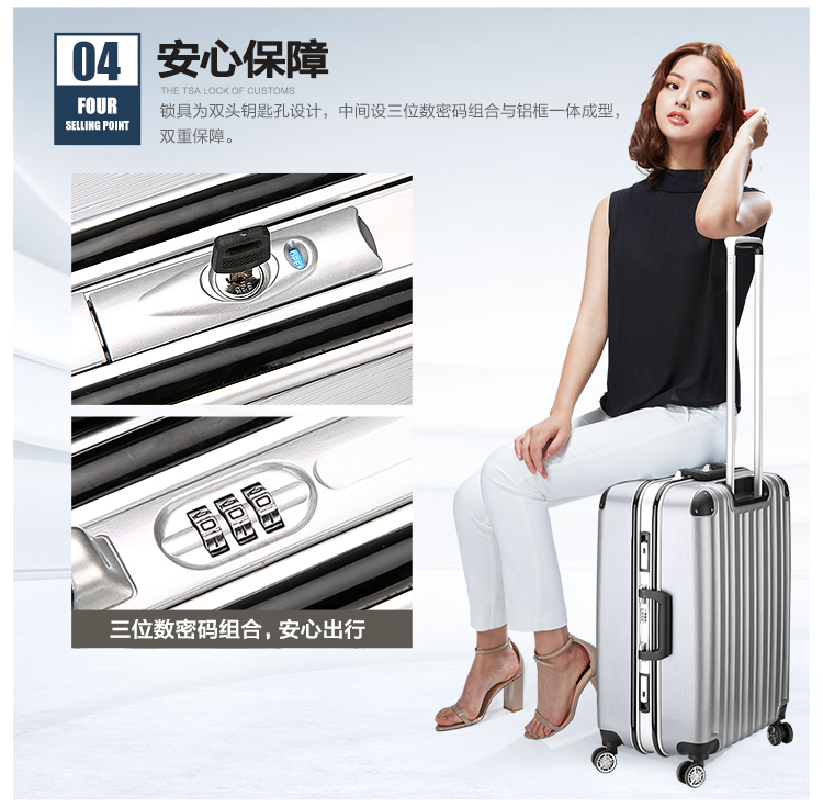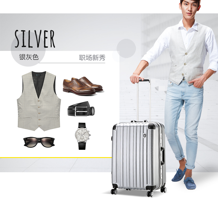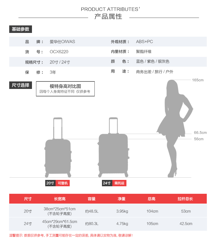 型号:OCX6220 材质:ABS+PC 尺寸:380*250*510mm(20寸) 450*290*615mm(24寸) 颜色:银灰色,紫色 吊牌价:1119元 (20寸)