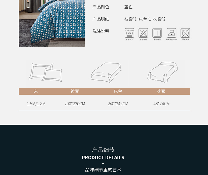 产品材质:100%聚酯纤维 产品尺寸:被套:200*230cm 床单:240*245cm 枕套:48*74cm包装尺寸 : 43*35.5*8.5cm 产品说明:采用高品质聚酯纤维原料,面料经过两次特殊处理,面料舒爽,不粘身,手感柔软,触感细腻!