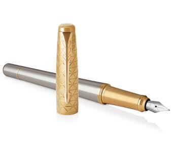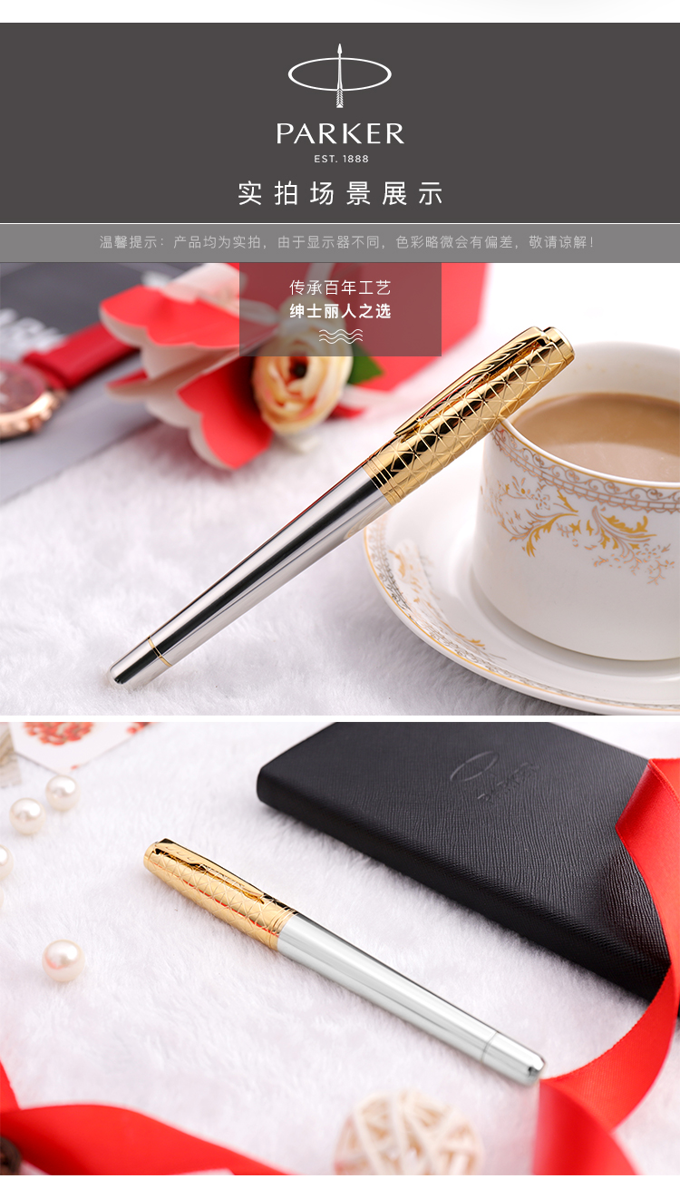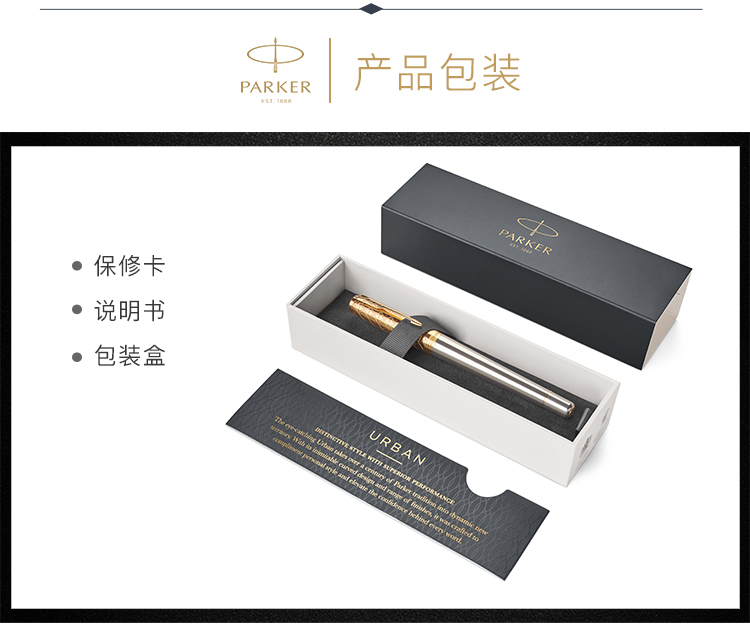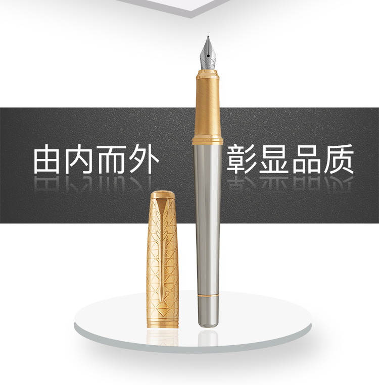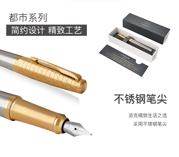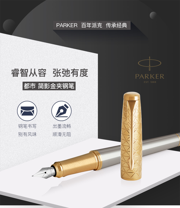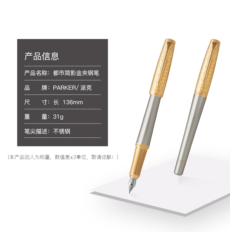 商品名称:派克(PARKER)都市简影金夹墨水笔 商品属性:笔尖:不锈钢 笔饰:不锈钢 笔身:阳极电镀铝+抛光 笔帽:黄铜蚀刻+抛光+镀金 零售价:¥1088