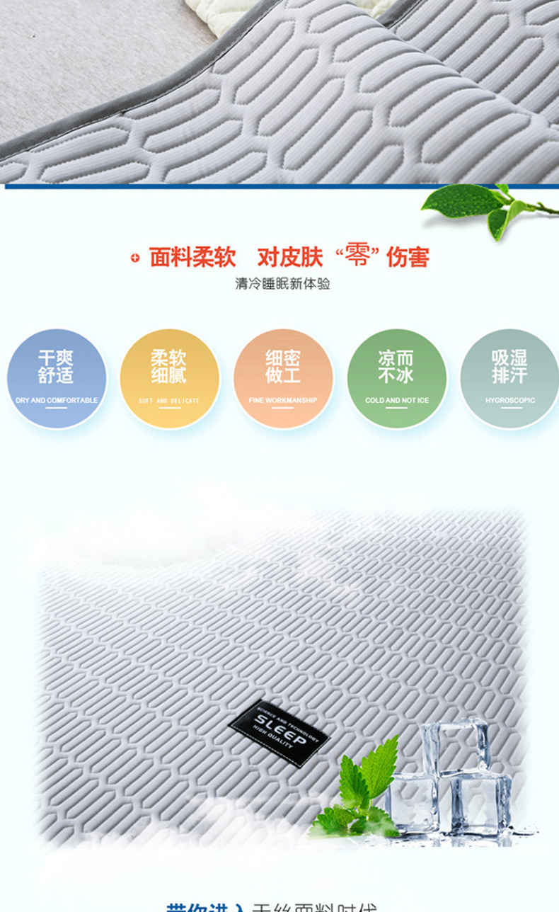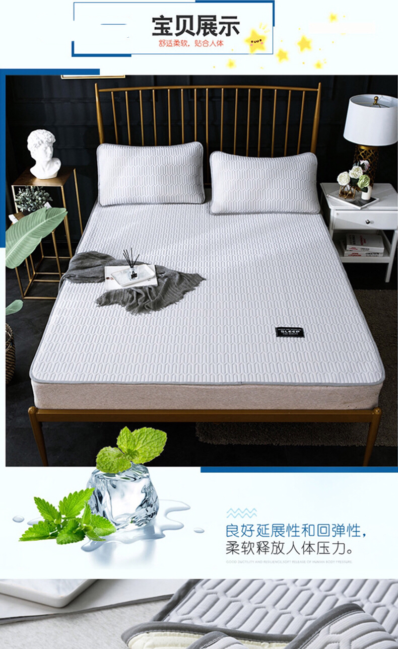 产品规格:180cm*200cm 面料:针织纤维(聚酯纤维) 填充:乳胶 包装:彩盒 产品描述:采用原生态泰国进口乳胶,无异味,不板结,更环保,更健康,使用用冰丝面料柔软爽肤,精细针脚走线有效定型内部乳胶。